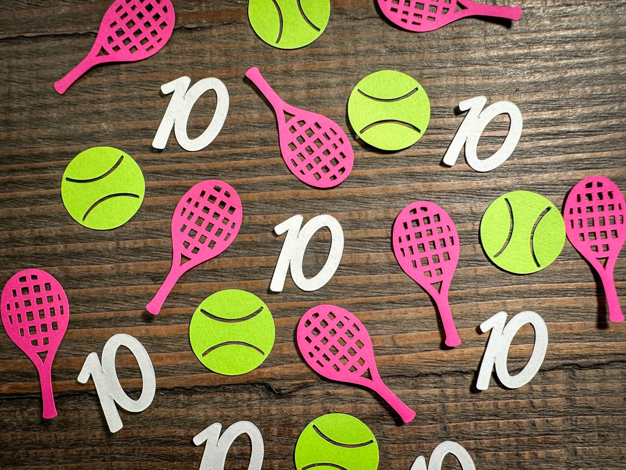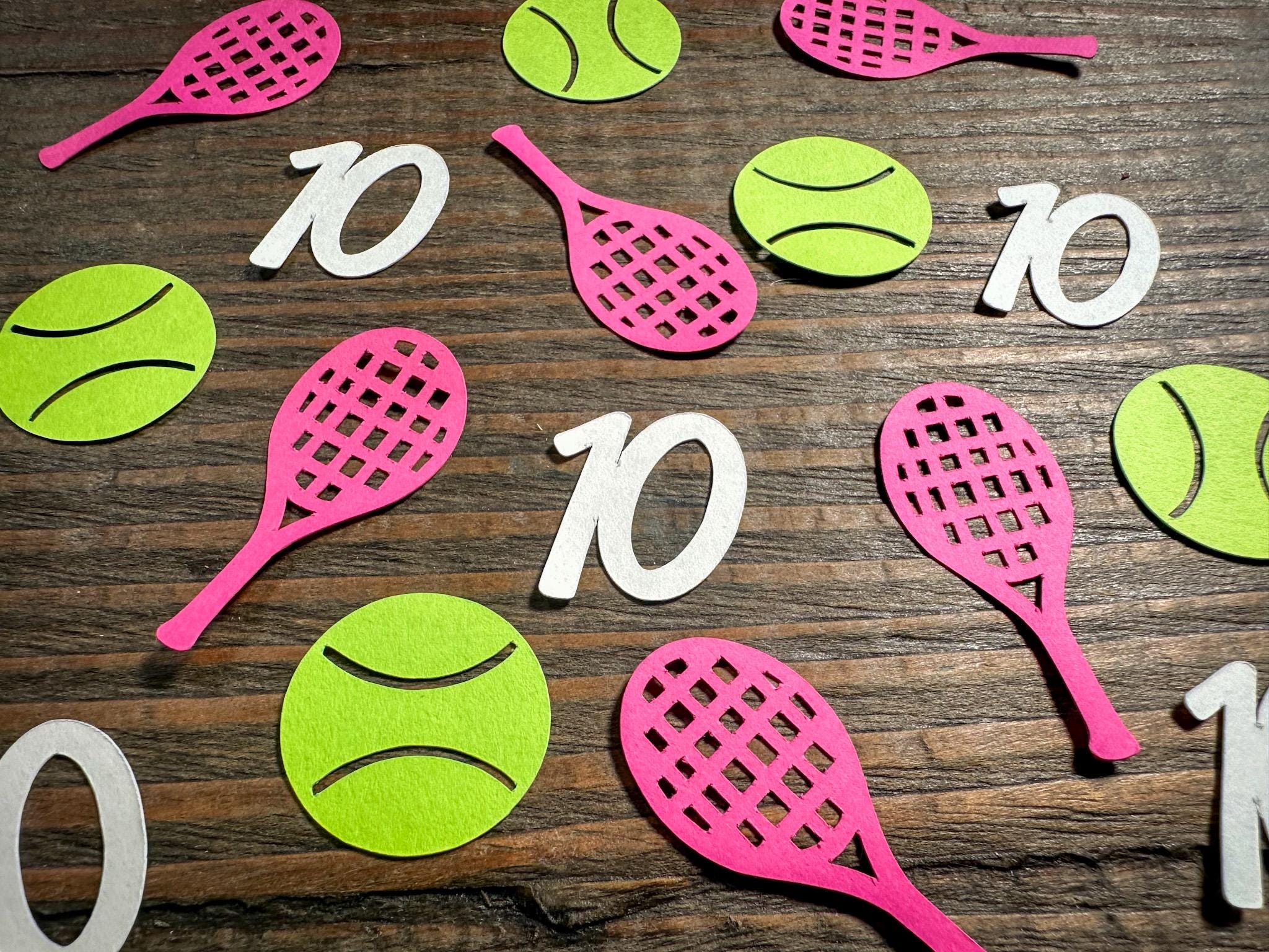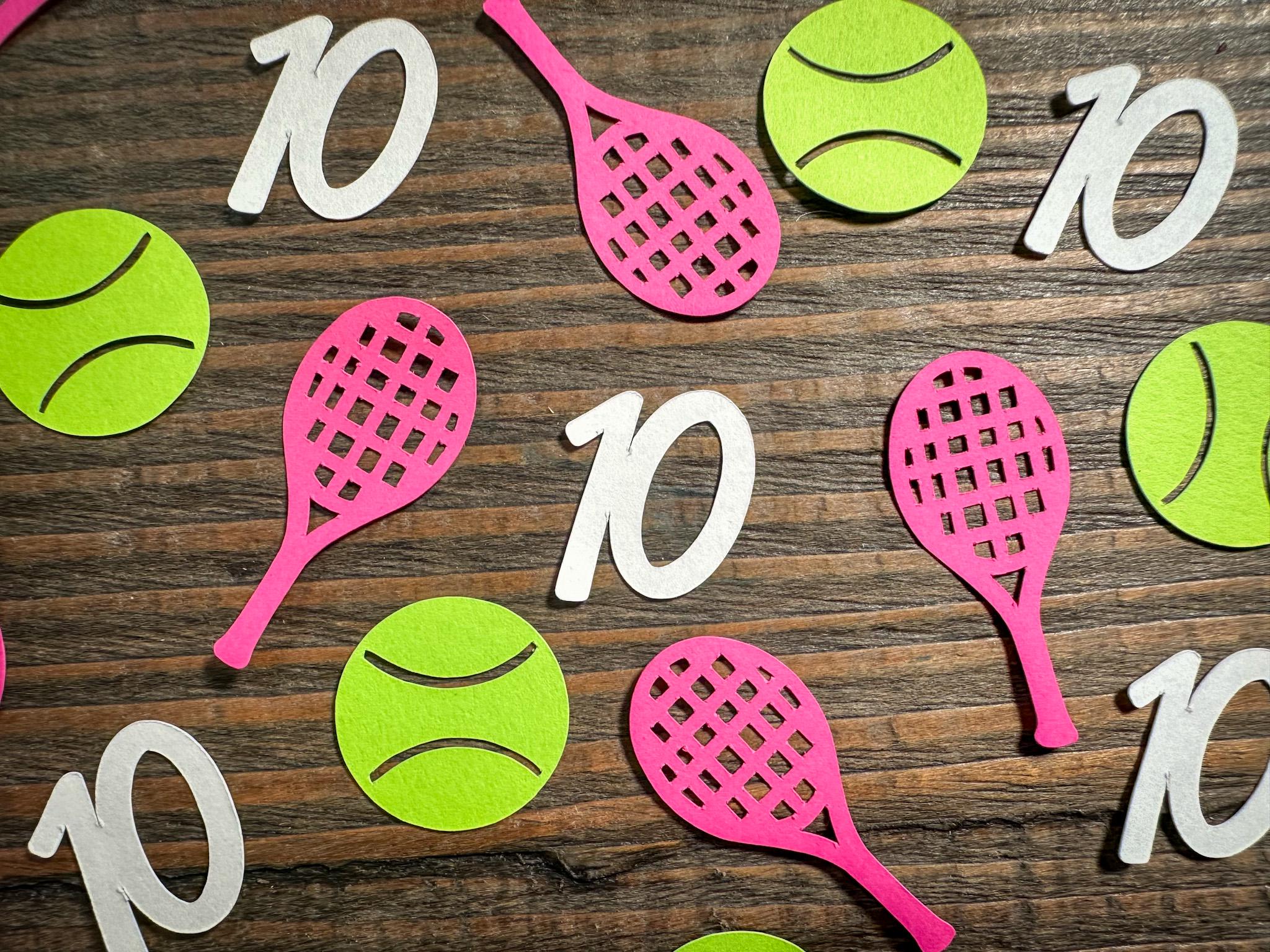 This listing is for 100 pieces of confetti! It includes 25 white number pieces, 40 pieces of tennis balls and 35 rackets. The rackets measure approximately 1.75 inches in length and the tennis balls measure approximately 1 inch in diameter.