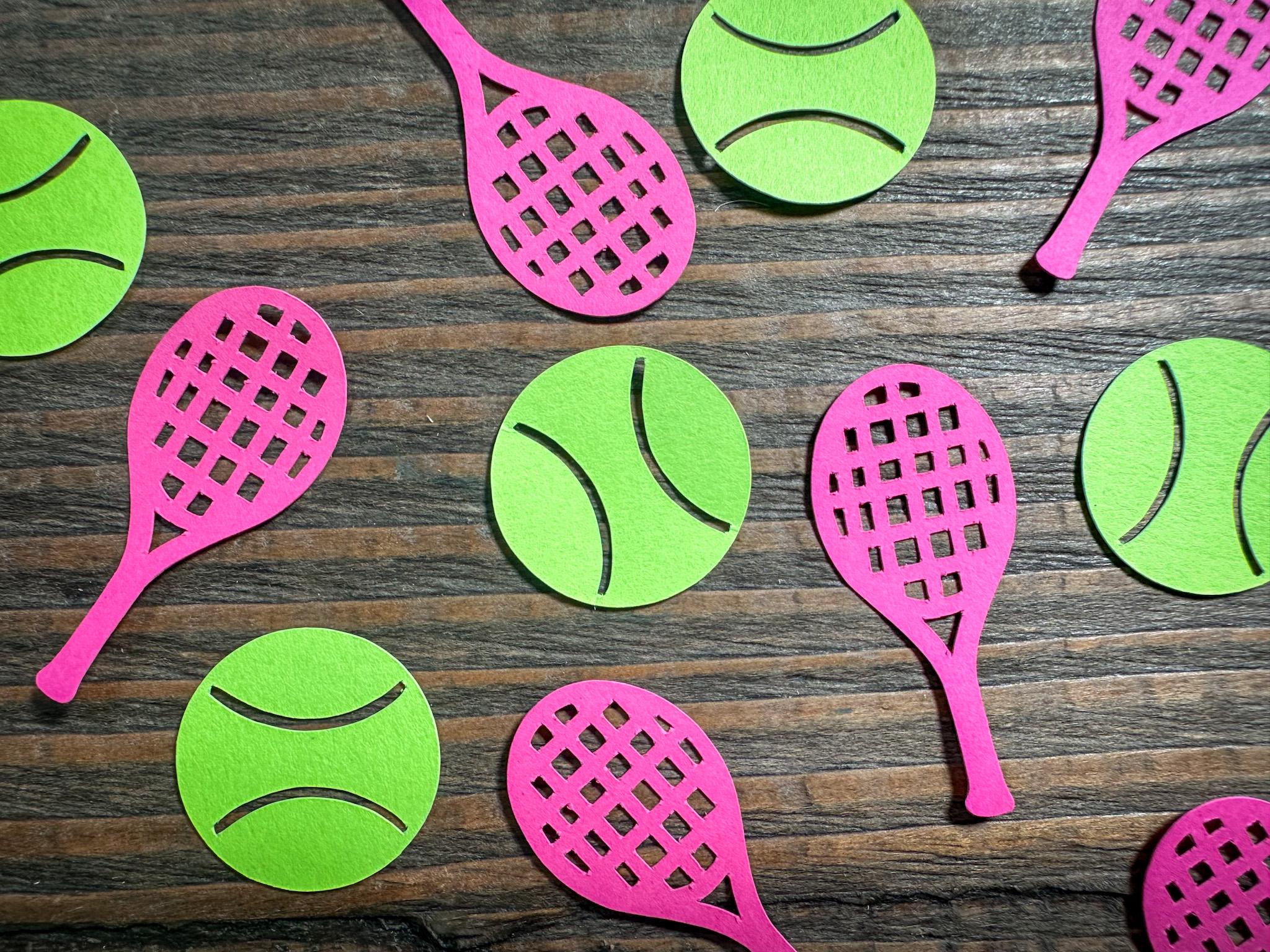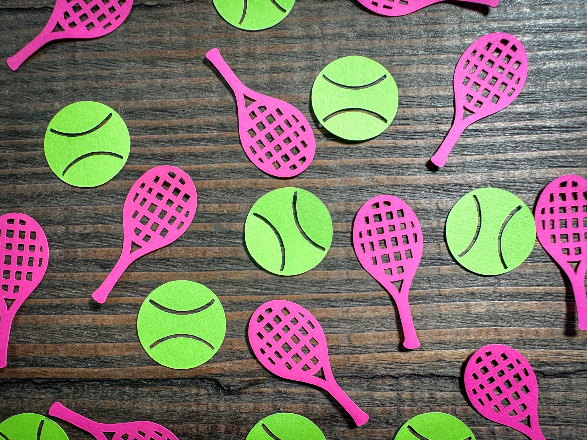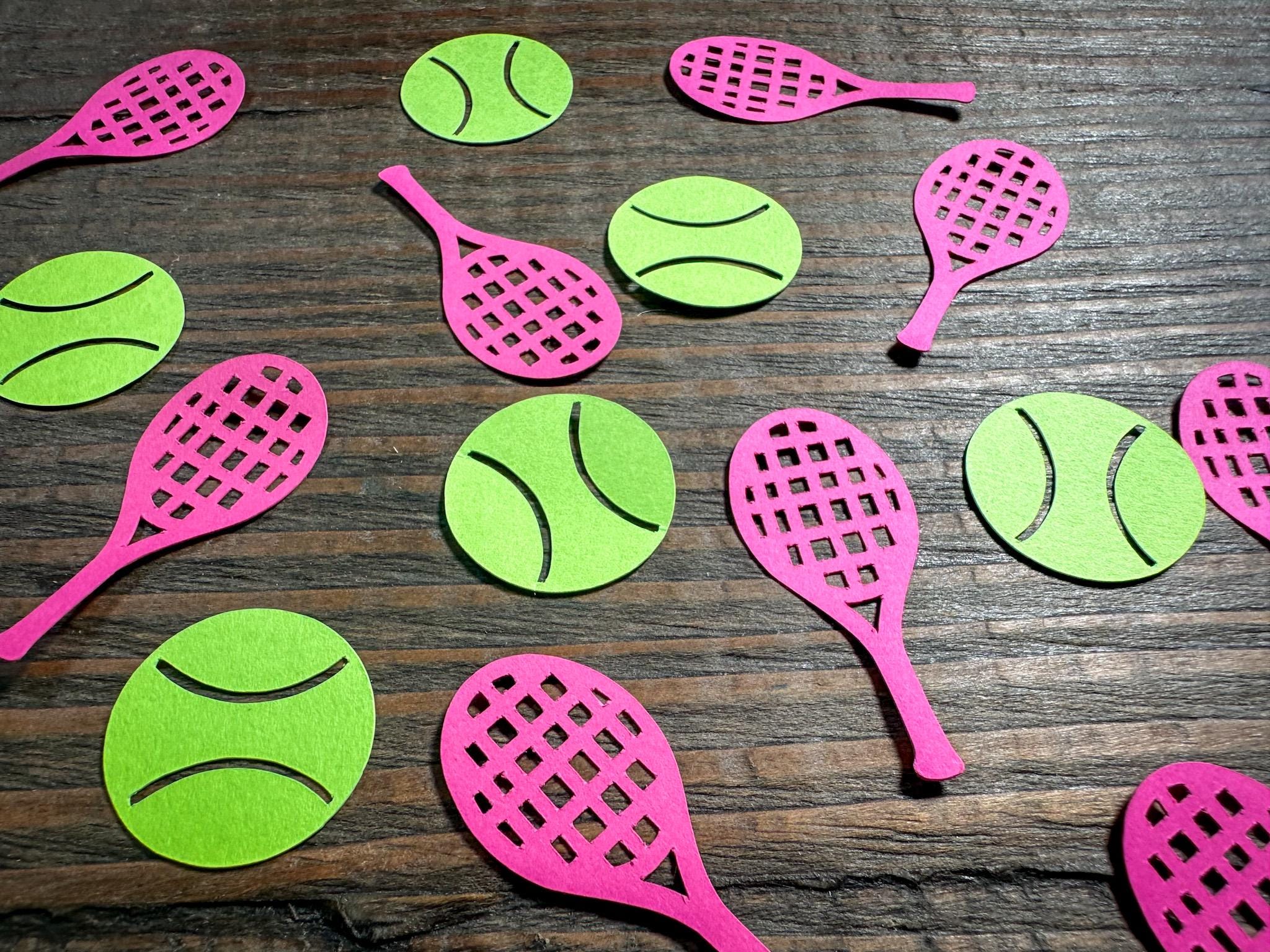 This listing is for 100 pieces of confetti! It includes 50 pieces of tennis balls and 50 rackets. The rackets measure approximately 1.75 inches in length and the tennis balls measure approximately 1 inch in diameter.