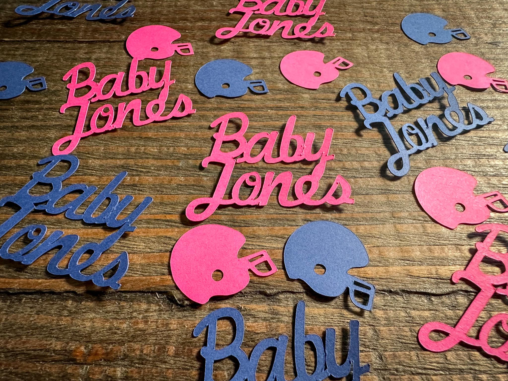 Boy or girl, what will it be? Are you team pink or team blue? This bright pink and navy blue gender reveal confetti is the perfect addition to your football themed party decor! The custom name pieces add a nice personal touch! This confetti is perfect for a football themed gender reveal or baby shower!