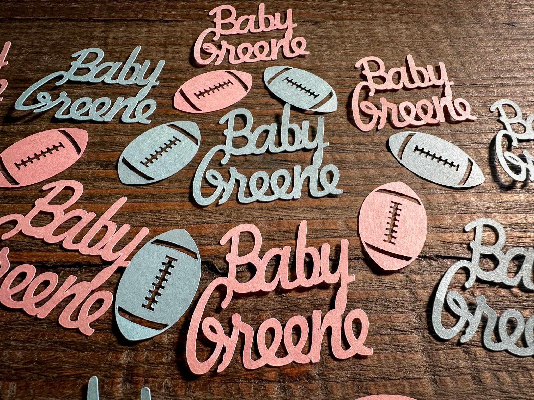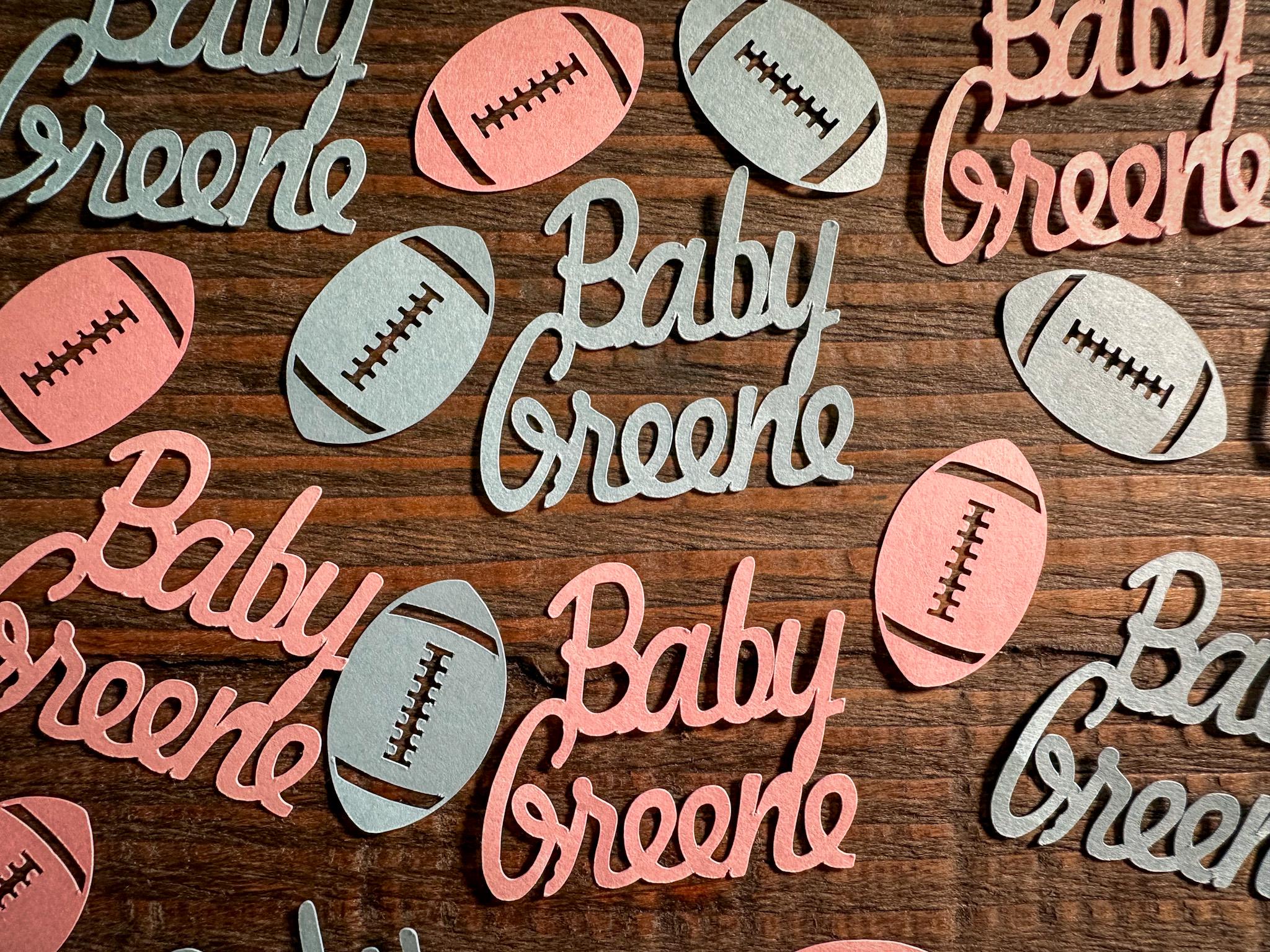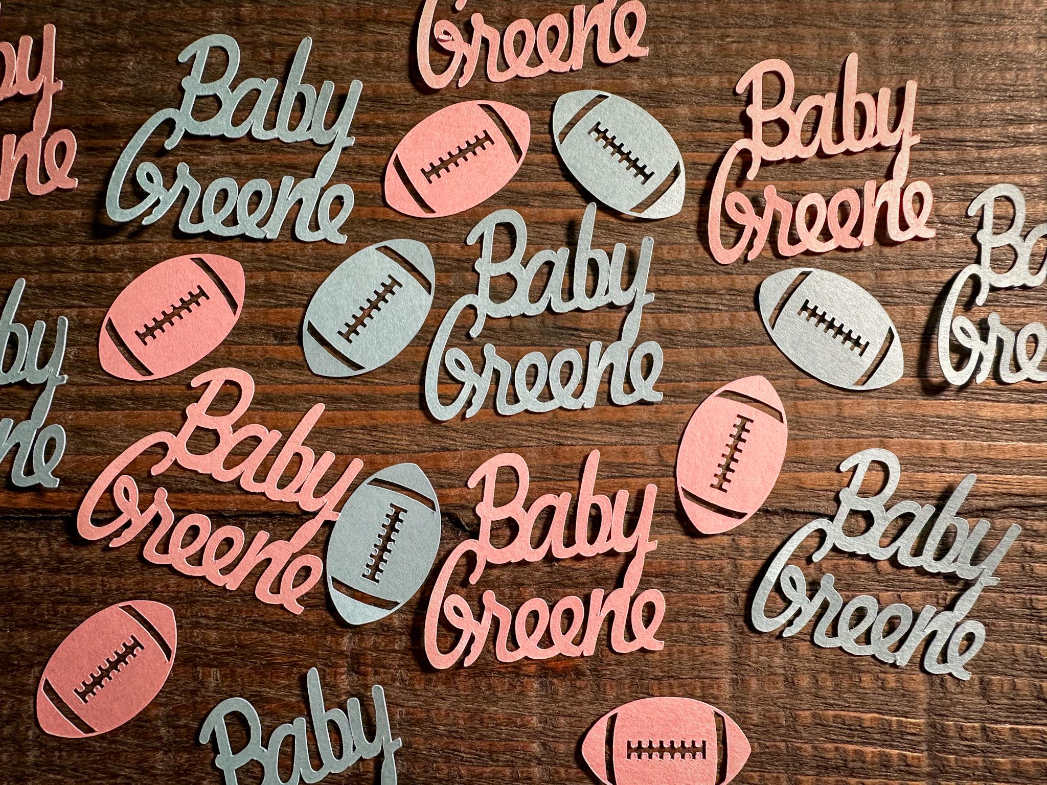 Boy or girl, what will it be? Are you team pink or team blue? This light pink and light blue gender reveal confetti is the perfect addition to your football themed party decor! The custom name pieces add a nice personal touch! This confetti is perfect for a football themed gender reveal or baby shower!