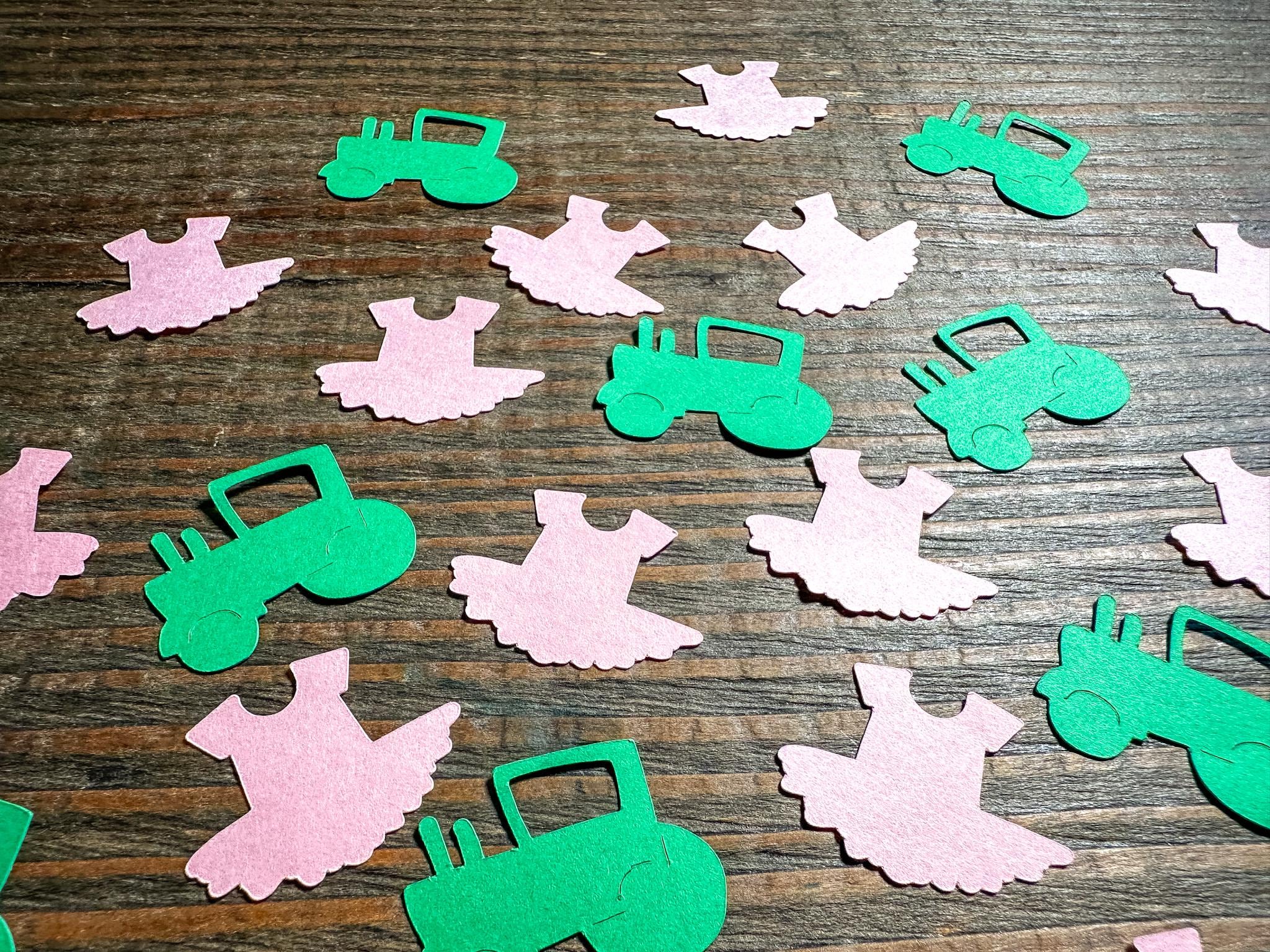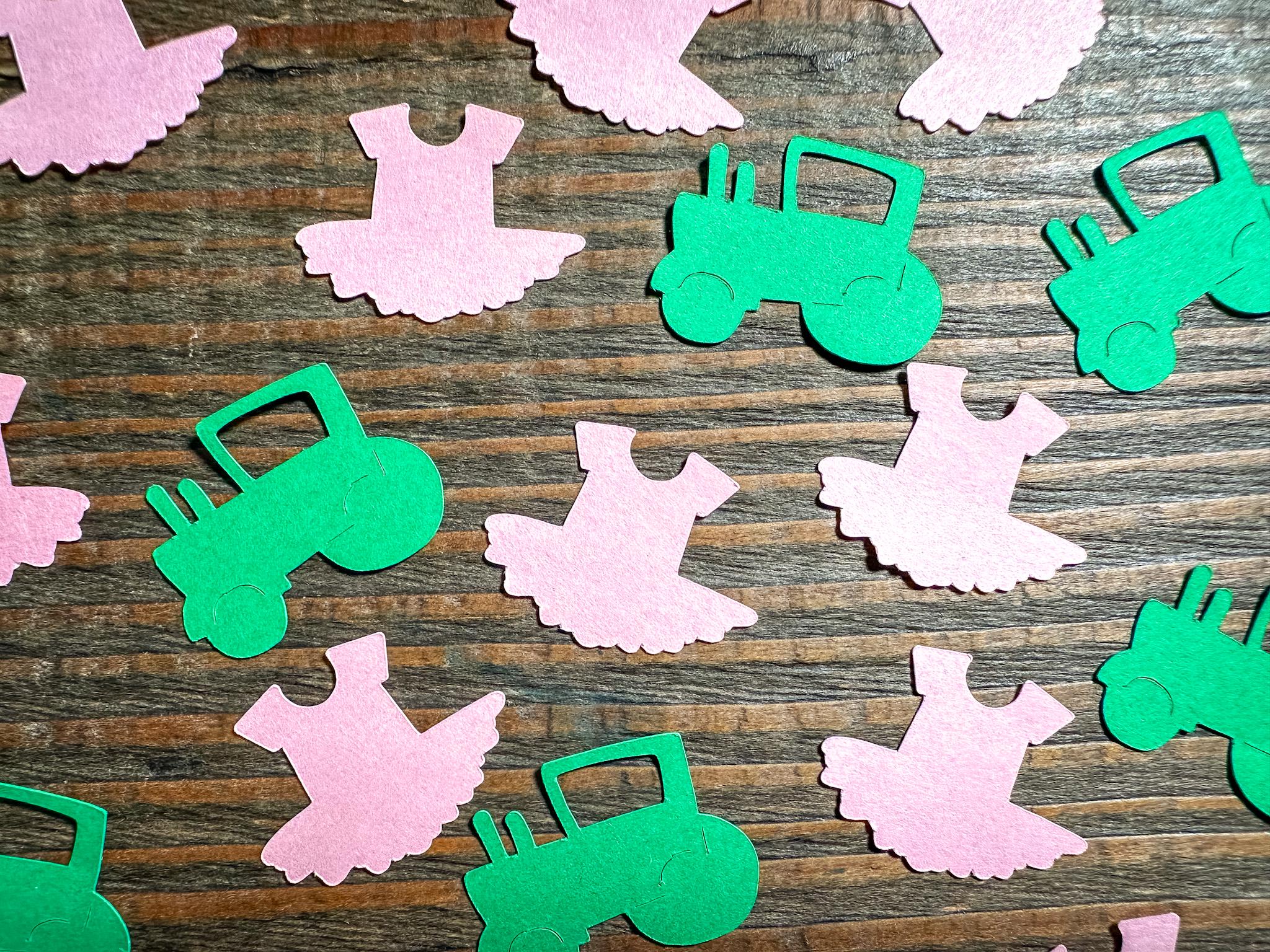 This listing is for 100 pieces of confetti. It includes 50 pieces of green tractors and 50 pieces of light pink tutus. The tractors measure approximately 1.25 inches in width and the tutu measures approximately 1.25 inches in height.