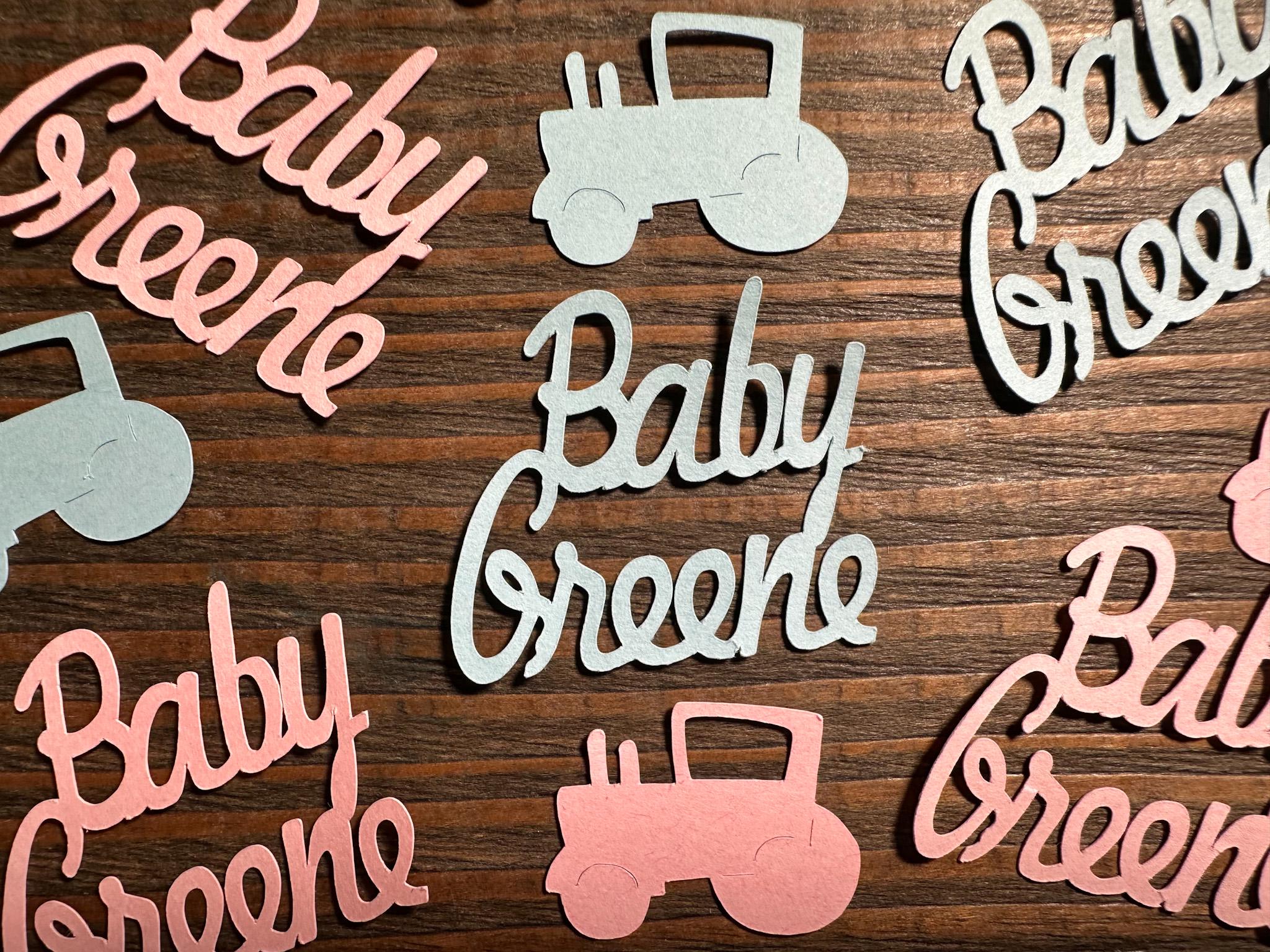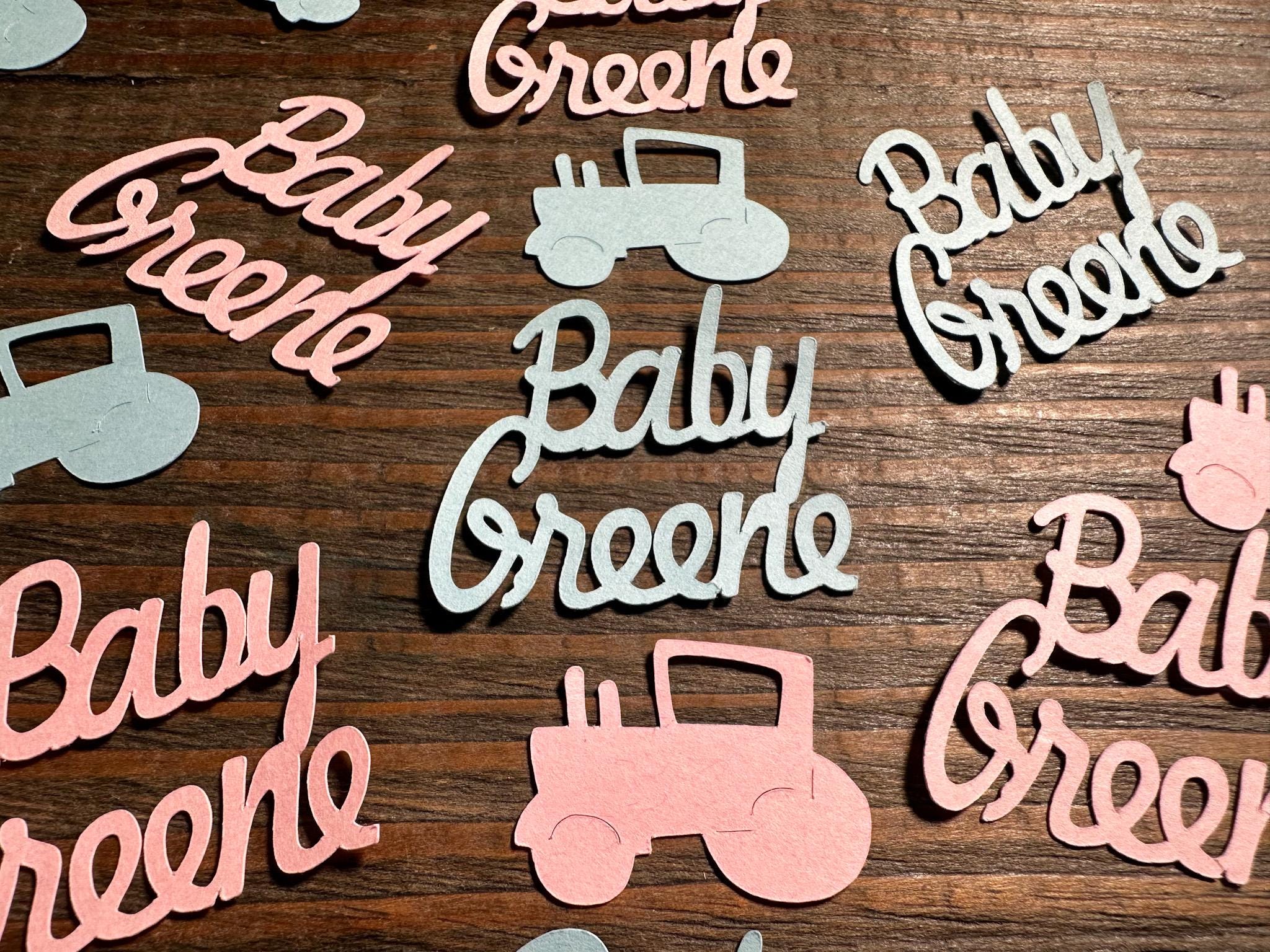 Are you hosting a tractor or farm themed gender reveal or baby shower? Be sure to add this personalized confetti to your party decor!