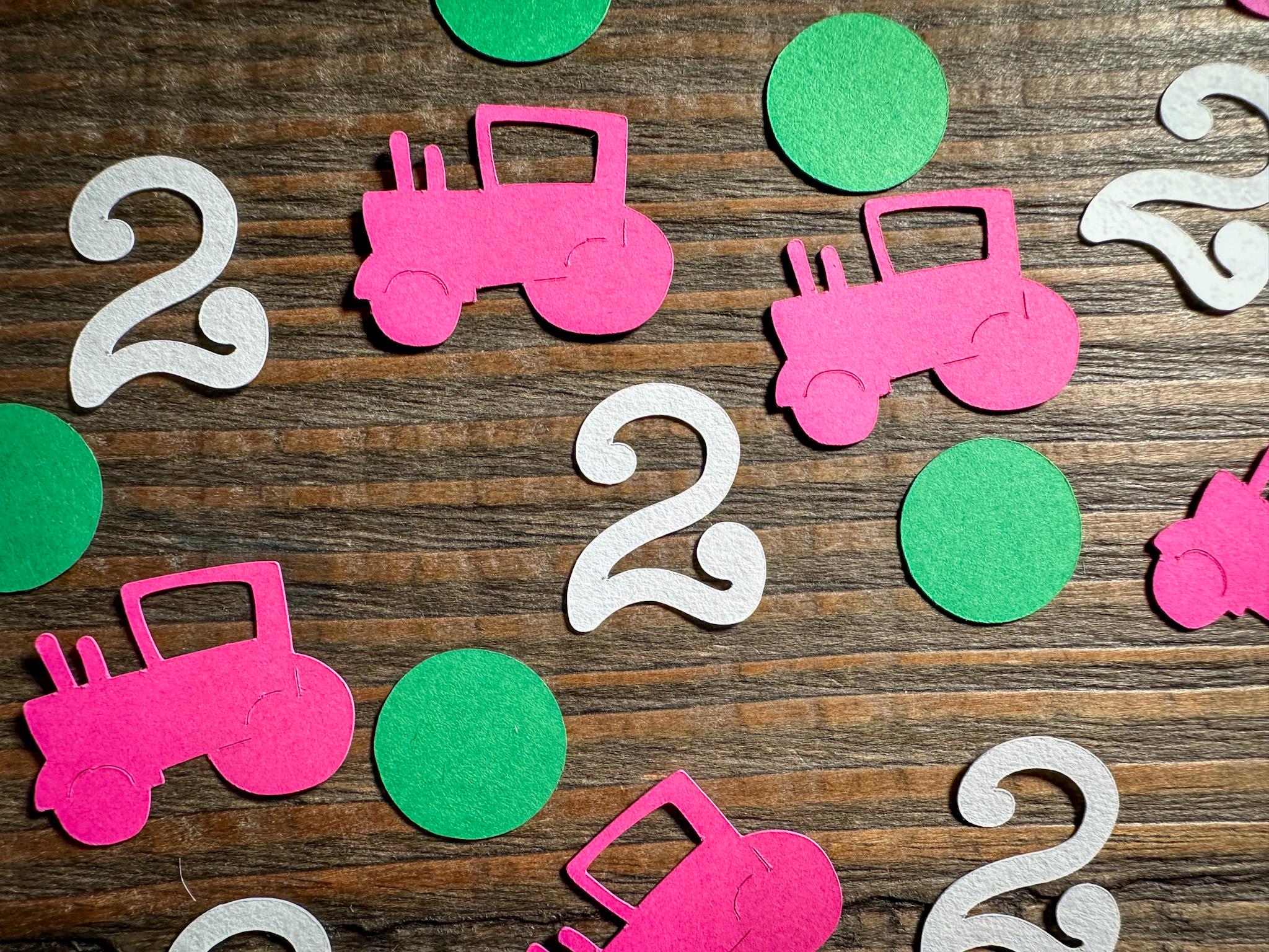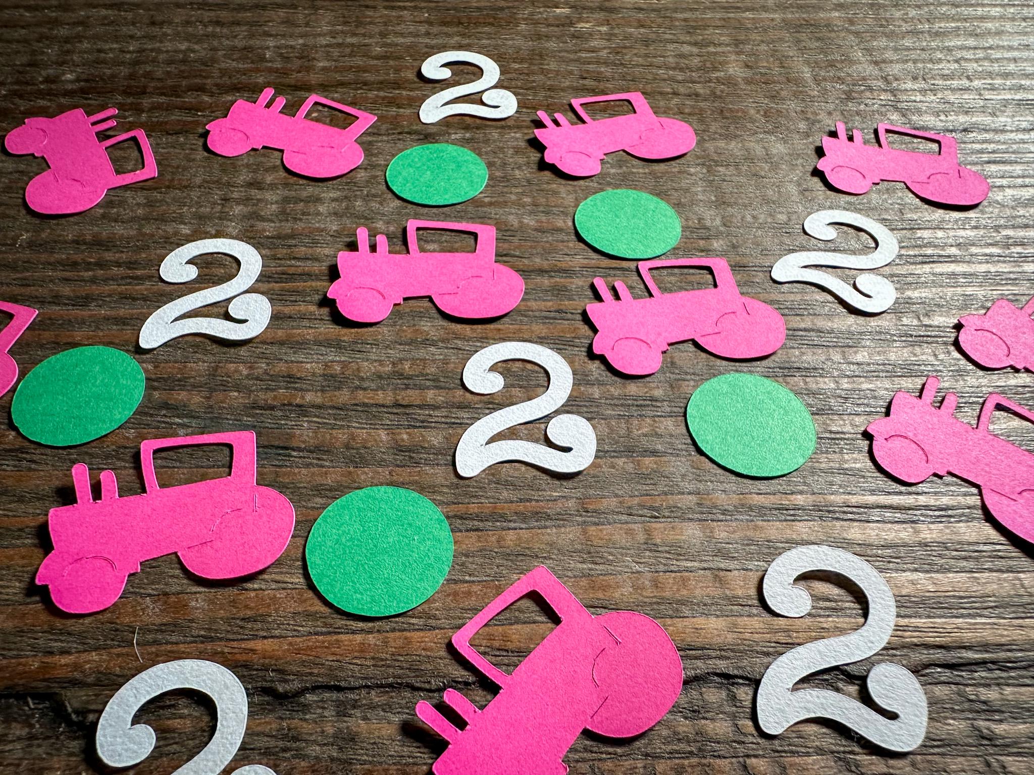 This listing is for 100 pieces of confetti. It includes 25 pieces of white numbers, 25 pieces of pink tractors, and 50 green circles. The Tractors measure approximately 1 inch in height by 1.25 inches in width, the circles measure .75 inches in diameter, and the numbers are approximately 1 inch in height.