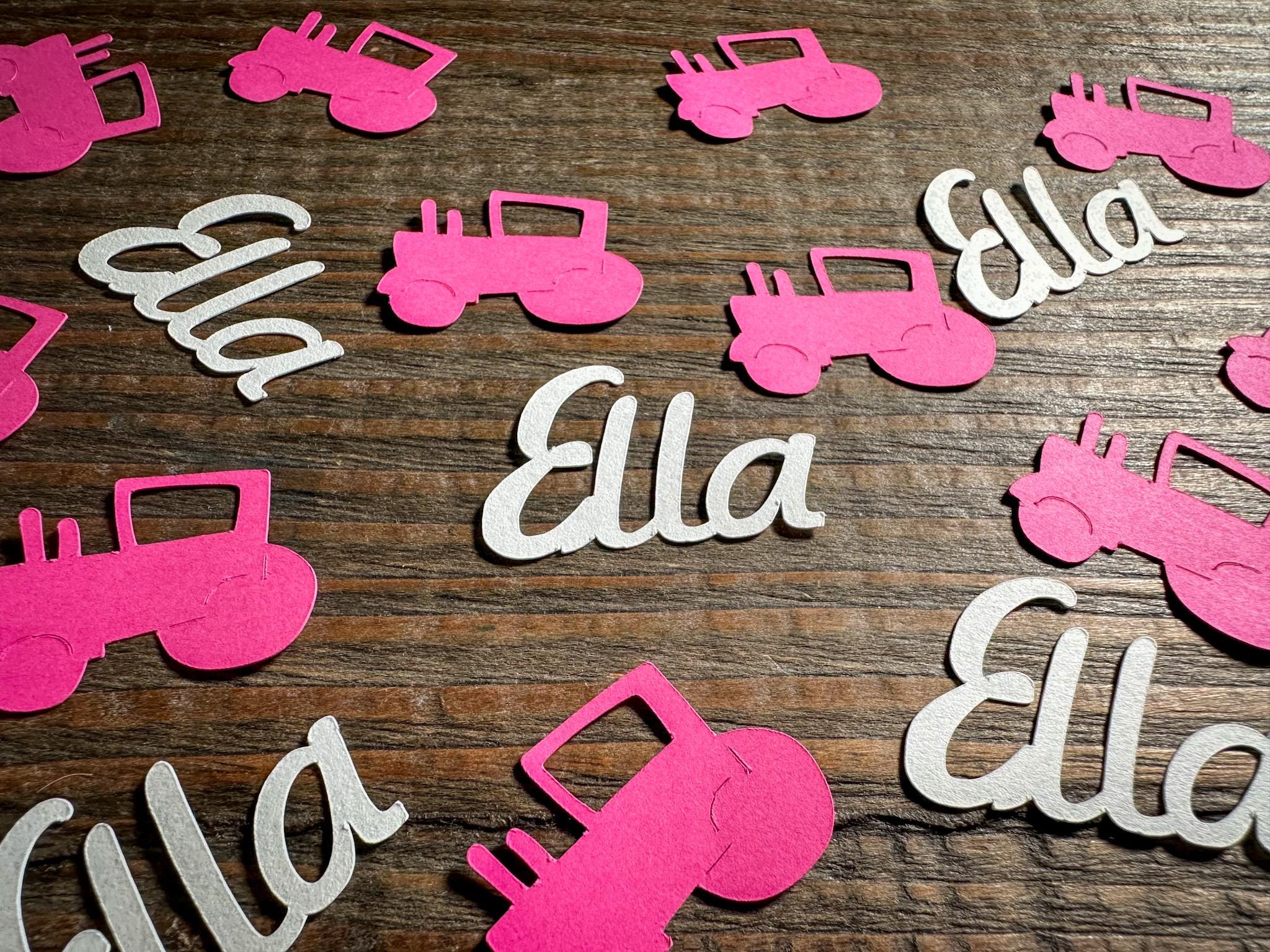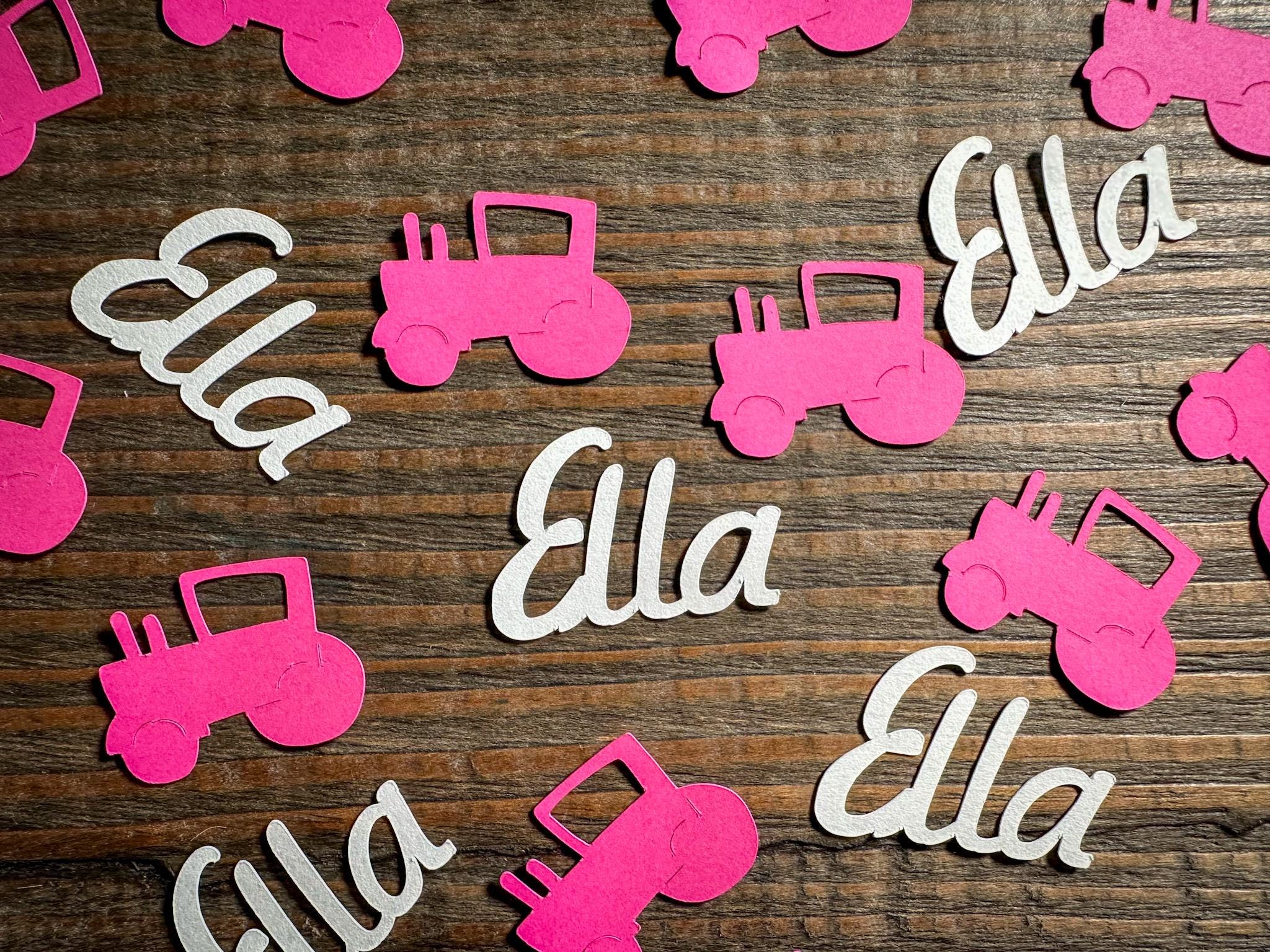 This listing is for 100 pieces of confetti! It includes 25 pieces of white name confetti and 75 pieces of pink tractor confetti. The circles measure approximately .75 inches in diameter. The tractors measure approximately 1.25 in width by 1 inch in height. The names measure approximately 1 inch in height and the length varies based on the name.