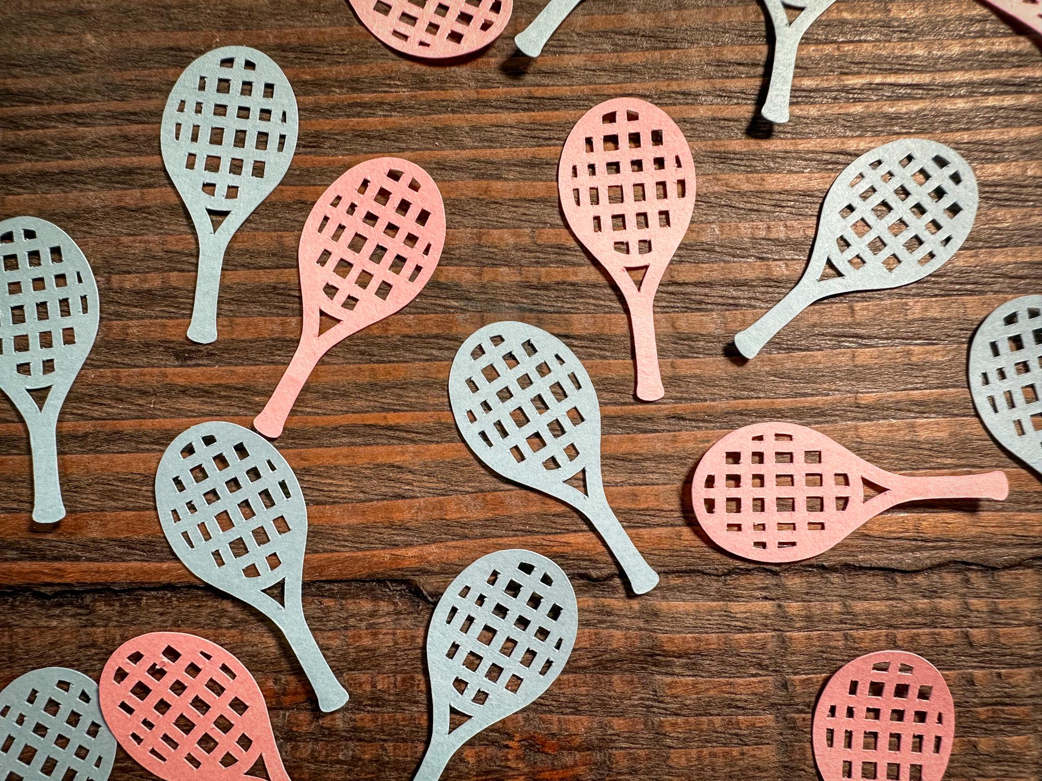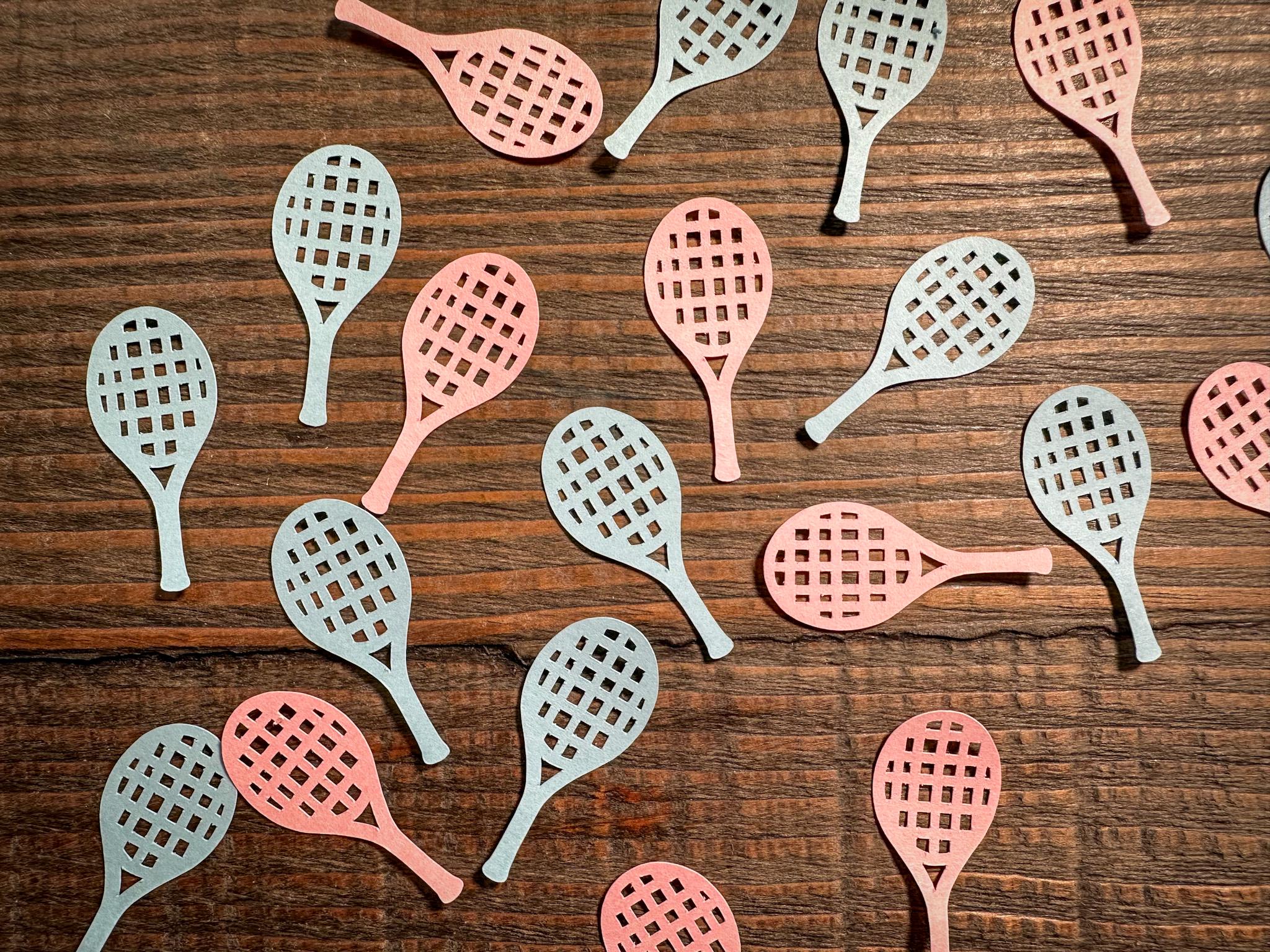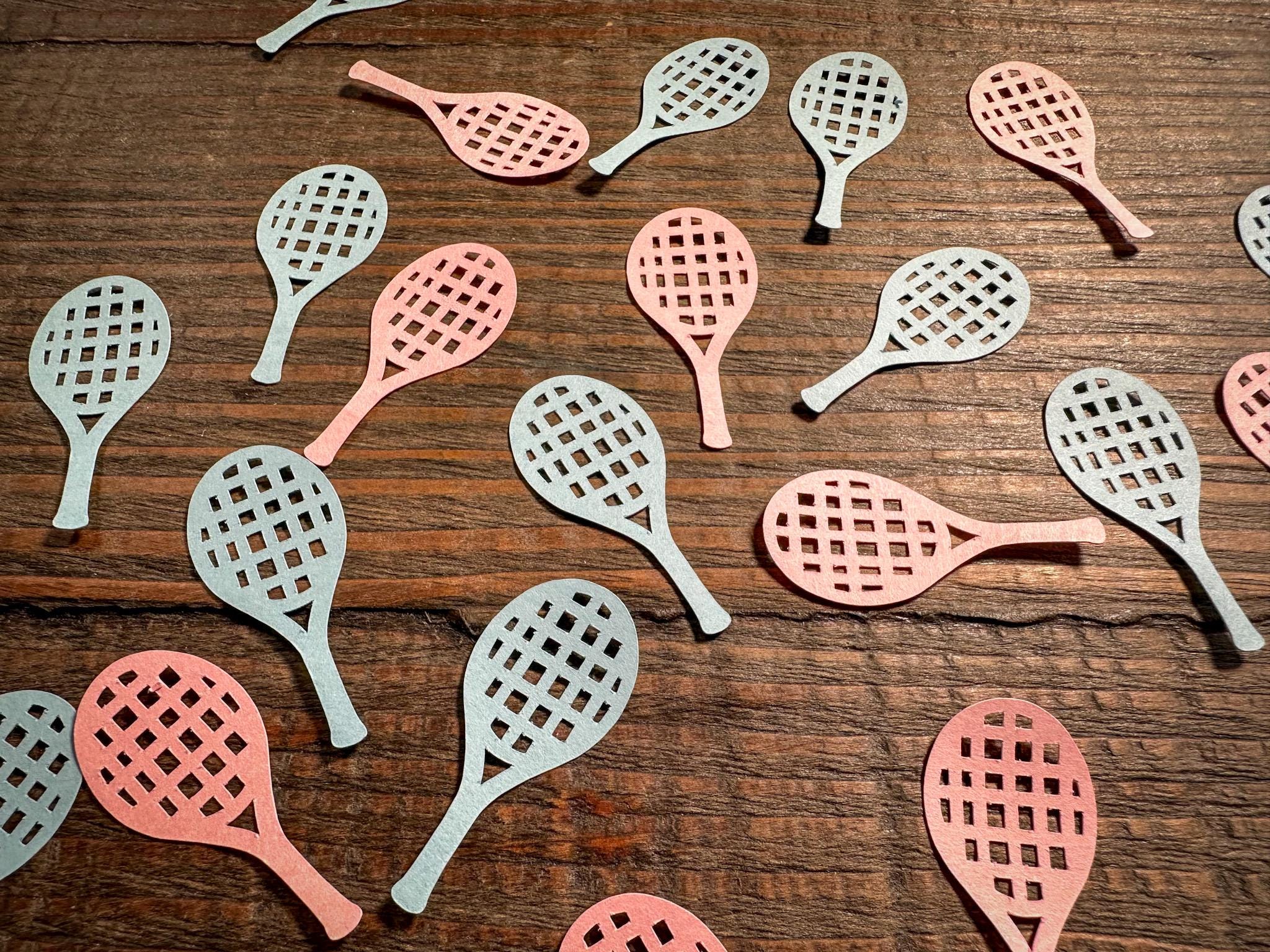This listing is for 100 pieces of confetti! It includes 50 pieces of light blue tennis rackets and 50 pieces of light pink tennis rackets. The confetti is made from premium cardstock and the rackets measure approximately 1.75 inches.
