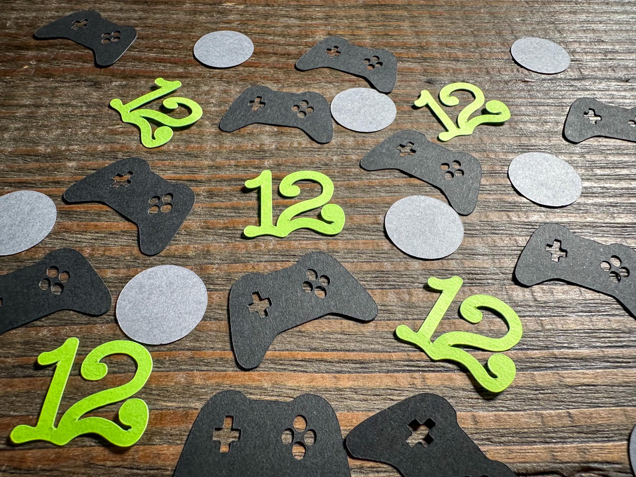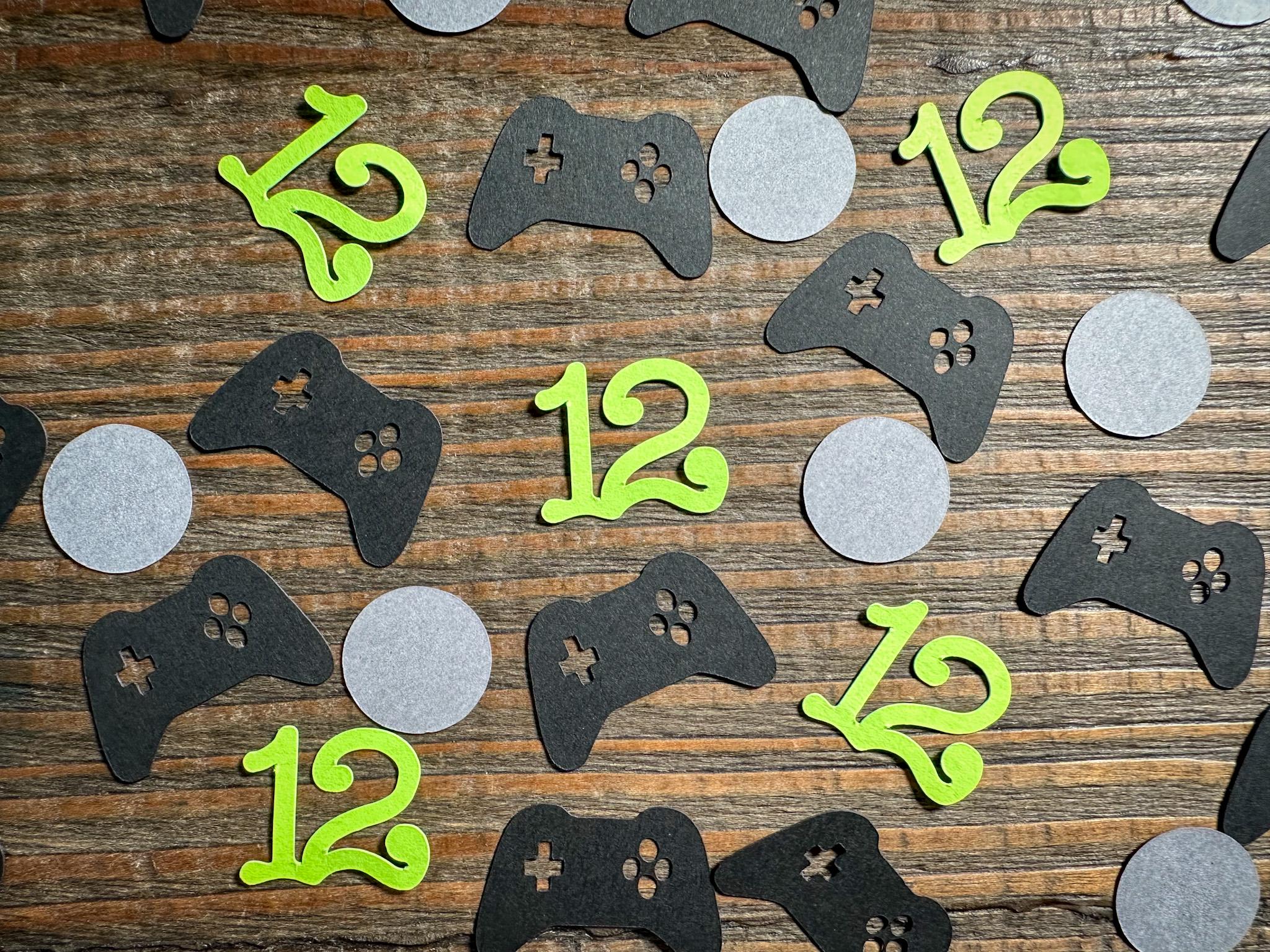 This listing is for 100 pieces of confetti! It includes 25 pieces of bright green numbers, 35 pieces of black game controllers, and 40 dark gray circles. The game controllers measure approximately 1.25 inches in width and the circles measure approximately .75 inches in diameter.