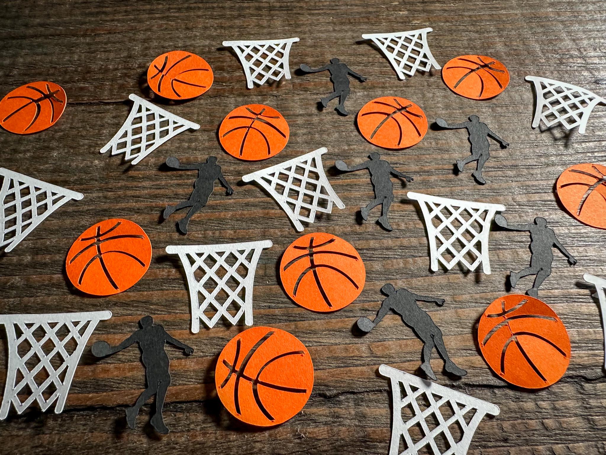This listing is for 100 pieces of confetti. It includes 35 pieces of basketballs, 35 nets, and 30 player cutouts. The basketballs are made fro orange cardstock and measure approximately 1 inch in diameter and the nets are made from white cardstock, measure 1.25 inches in width, and the players are made from black cardstock and measure approximately 1.25 inches in height.