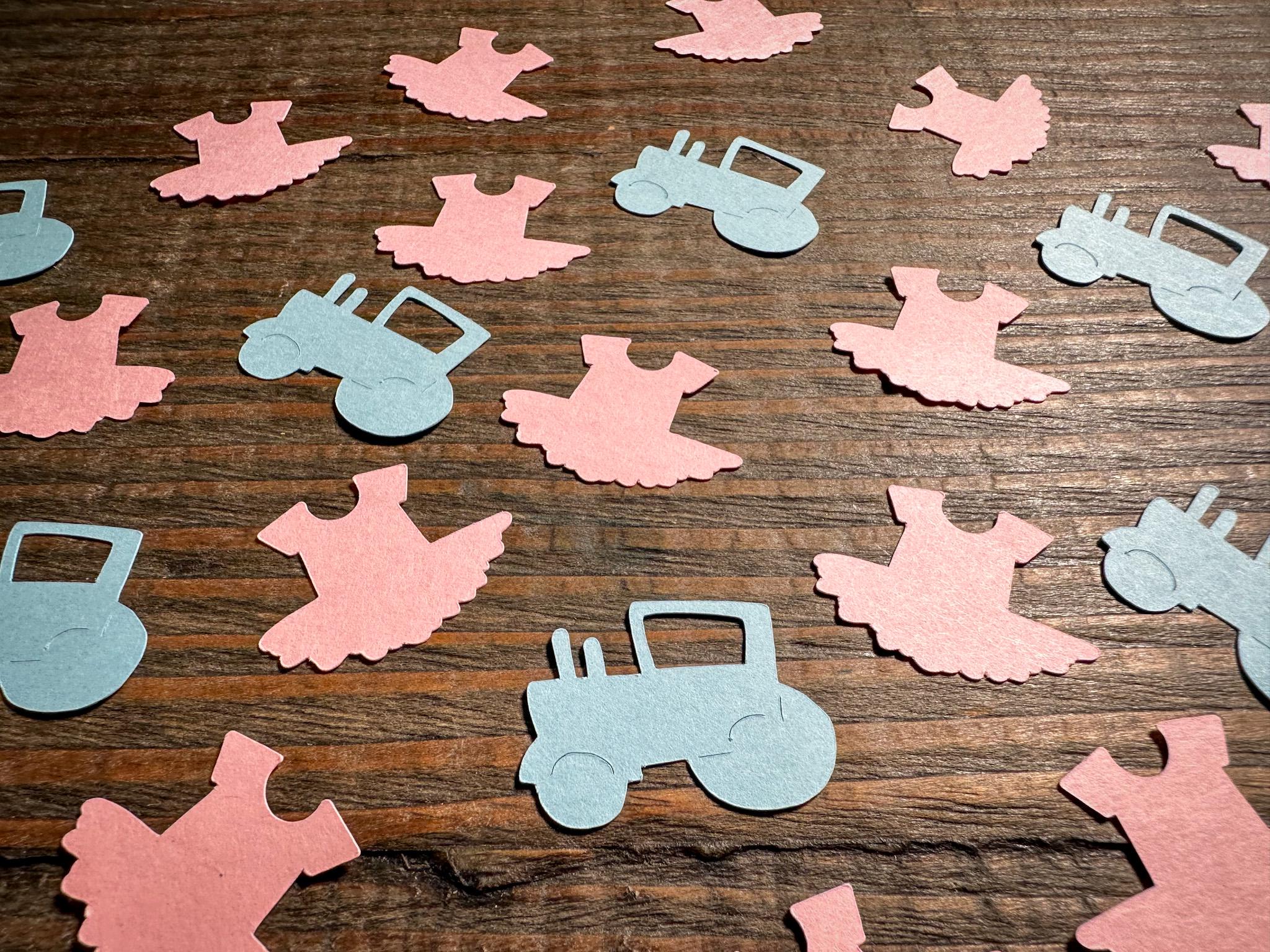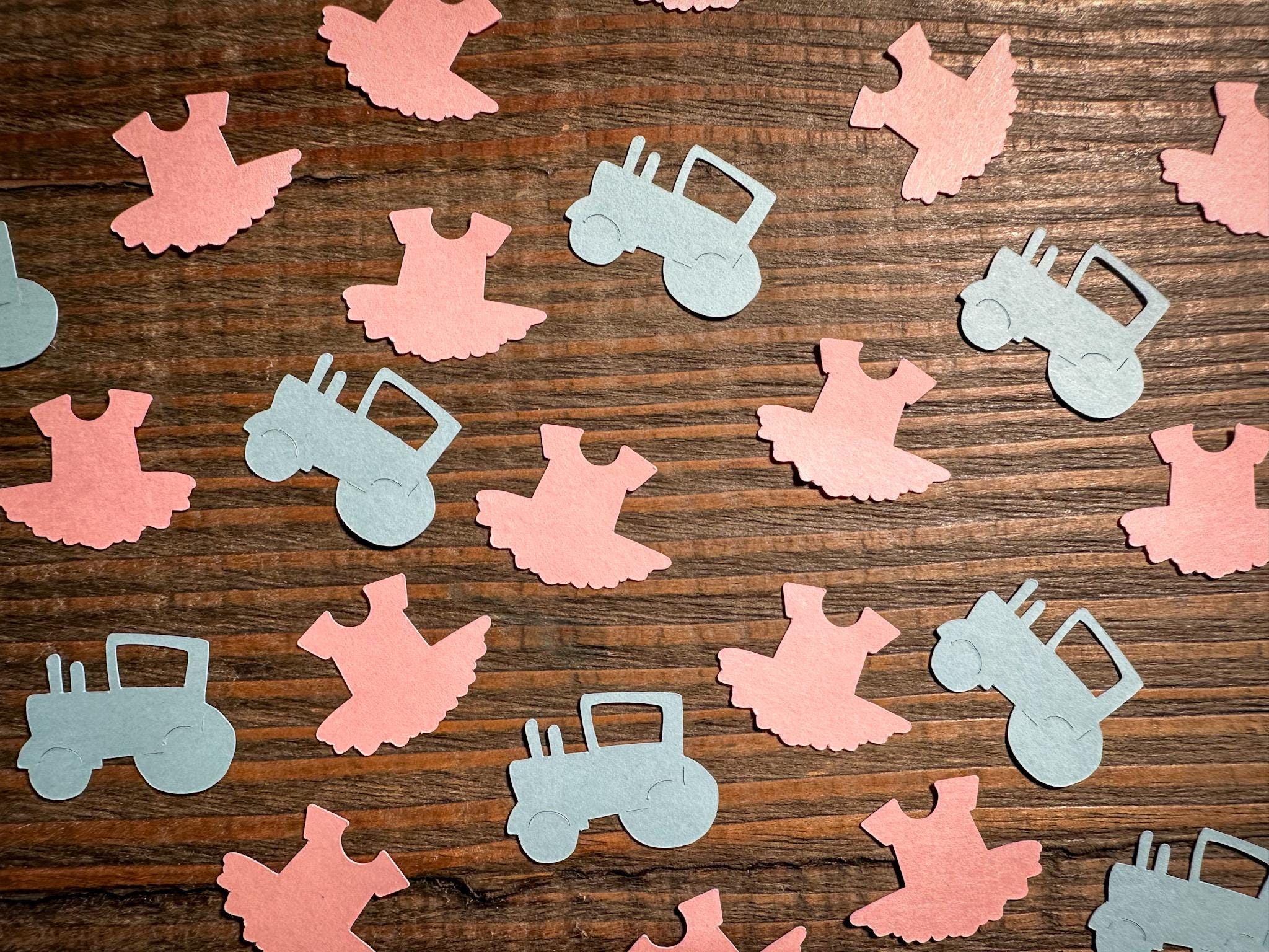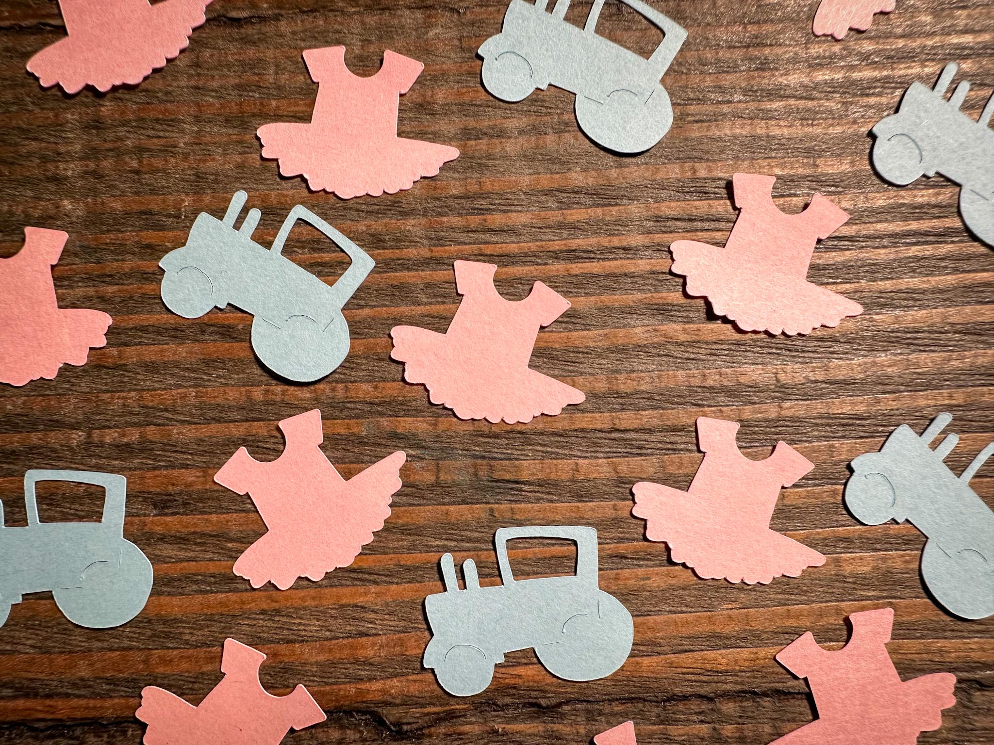 This listing is for 100 pieces of confetti. It includes 50 pieces of light blue tractors and 50 pieces of light pink tutus. The tractors measure approximately 1.25 inches in width and the tutu measures approximately 1.25 inches in height.