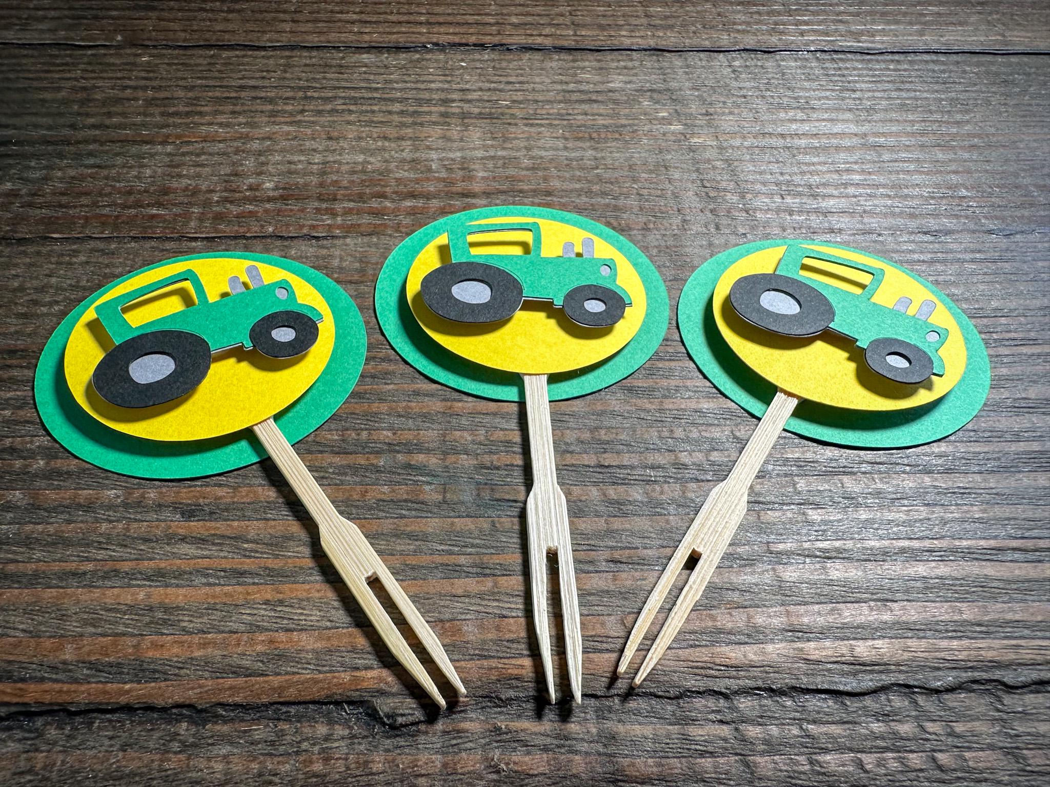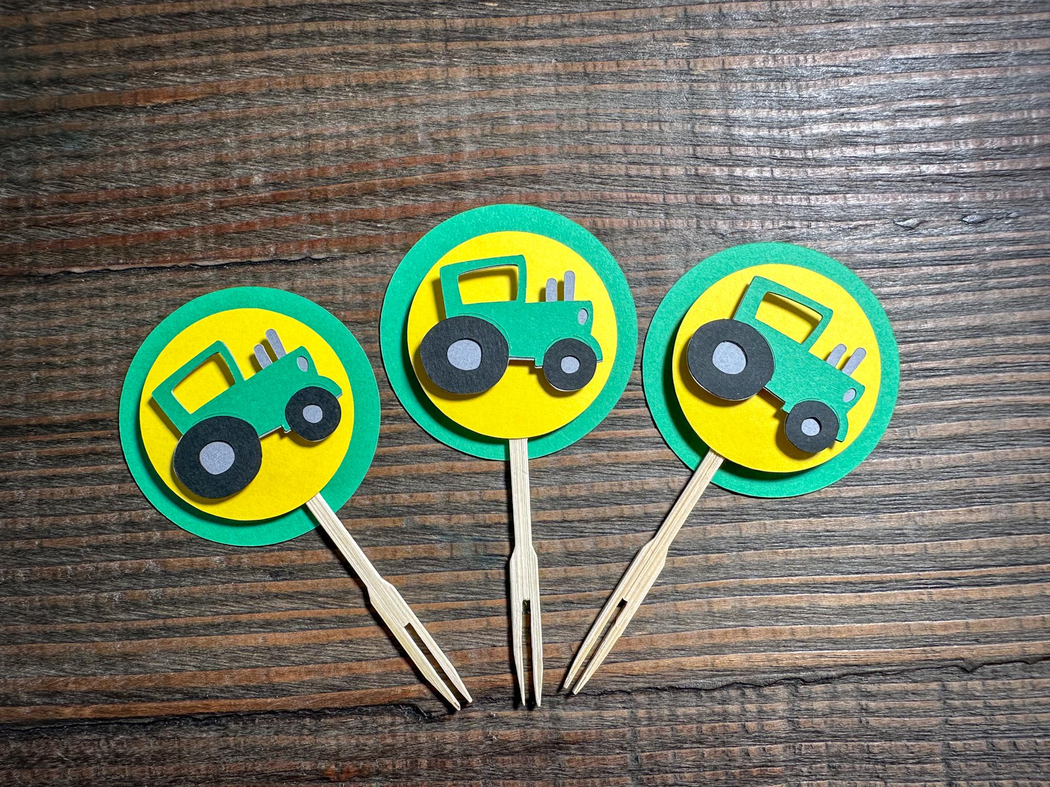 This listing is for 12 cupcake toppers! The toppers are made of premium cardstock and measure 2.5 inches in diameter. They are attached to a bamboo skewer. The tractors are attached with a foam dot for a 3D effect.