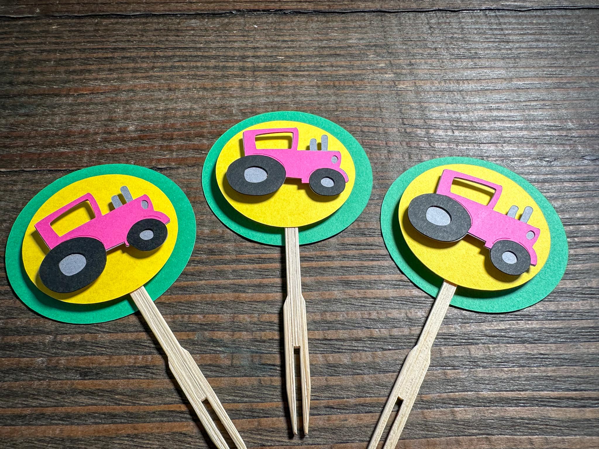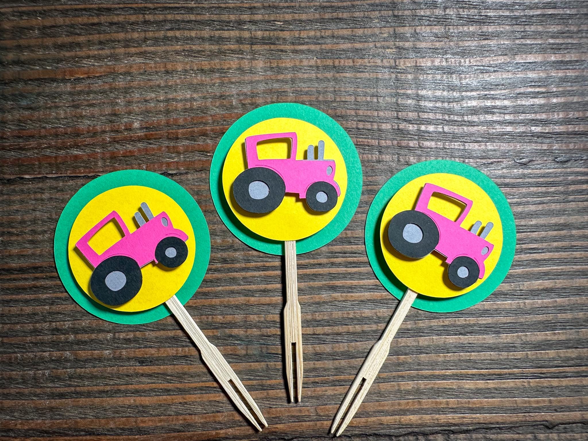 This listing is for 12 cupcake toppers! The toppers are made of premium cardstock and measure 2.5 inches in diameter. They are attached to a bamboo skewer. The tractors are attached with a foam dot for a 3D effect.