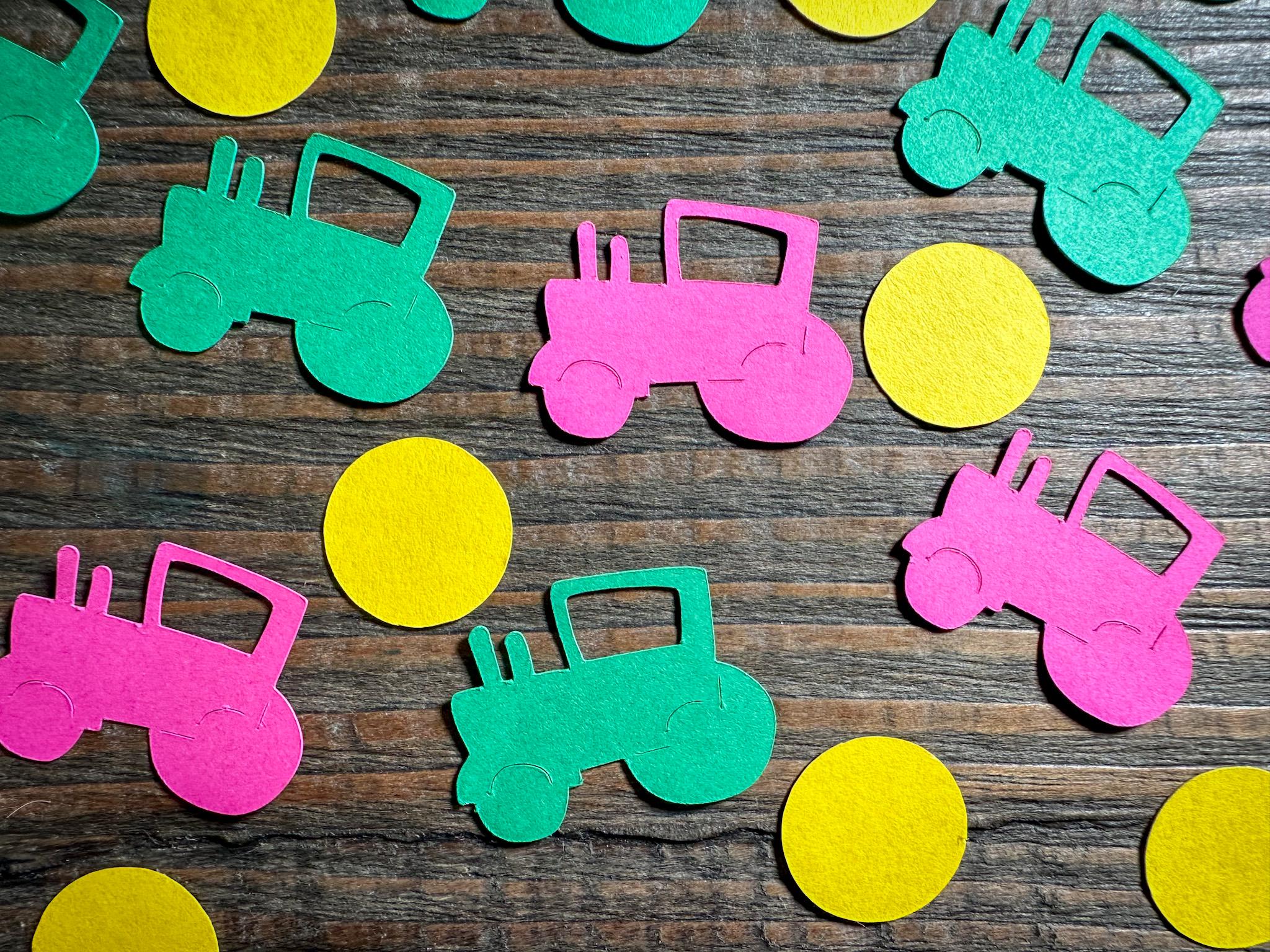 This listing is for 100 pieces of confetti! It includes 30 pieces of pink tractor confetti, 30 pieces of green tractors, and 40 pieces of yellow circles. The circles measure approximately .75 inches in diameter. The tractors measure approximately 1.25 in width by 1 inch in height.