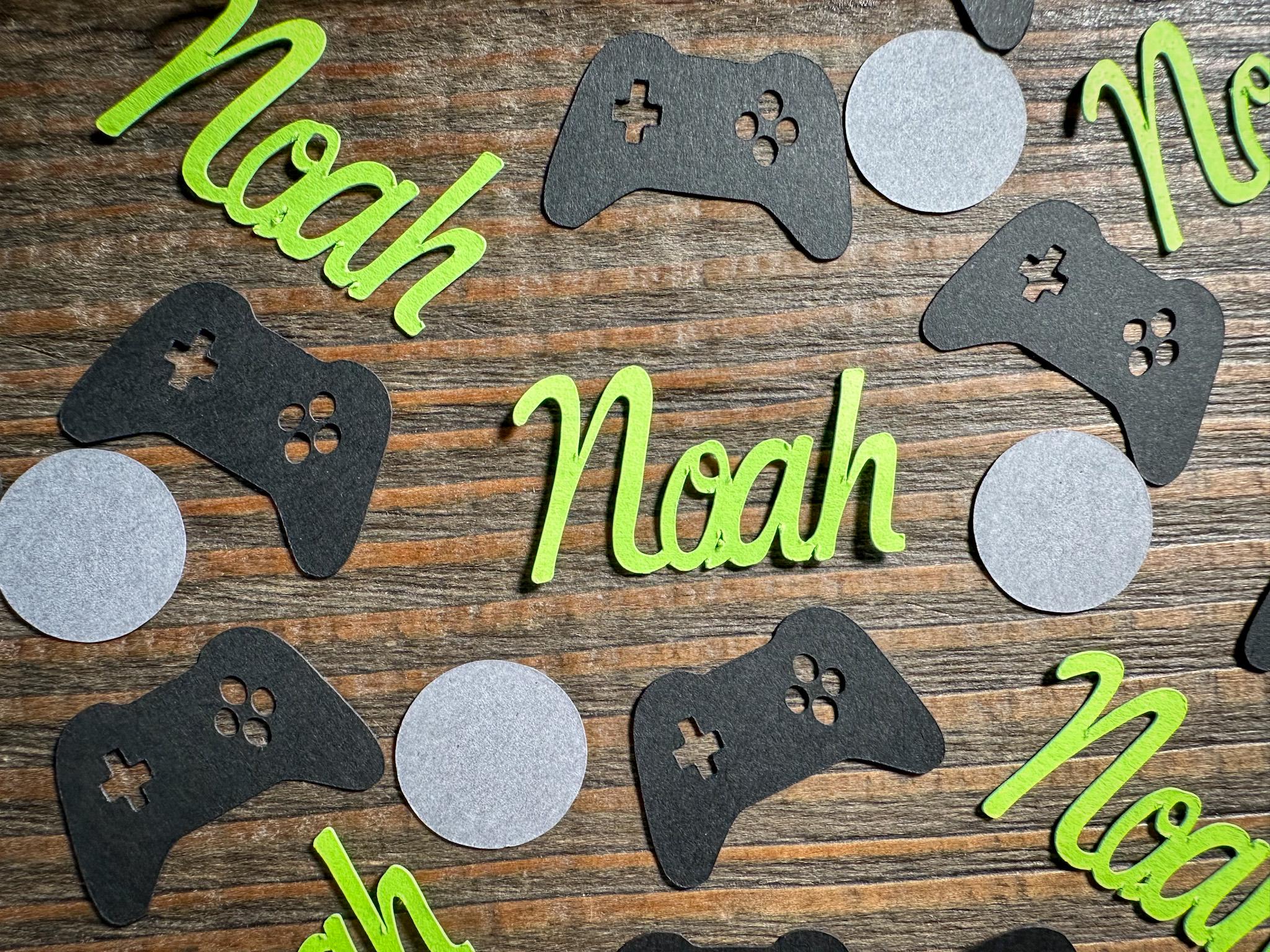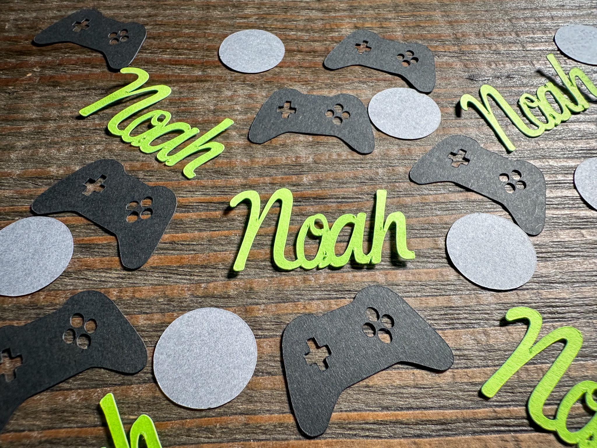 This listing is for 100 pieces of confetti! It includes 25 bright green names, 35 pieces of black game controllers, and 40 dark gray circles. The game controllers measure approximately 1.25 inches in width and the circles measure approximately .75 inches in diameter.
