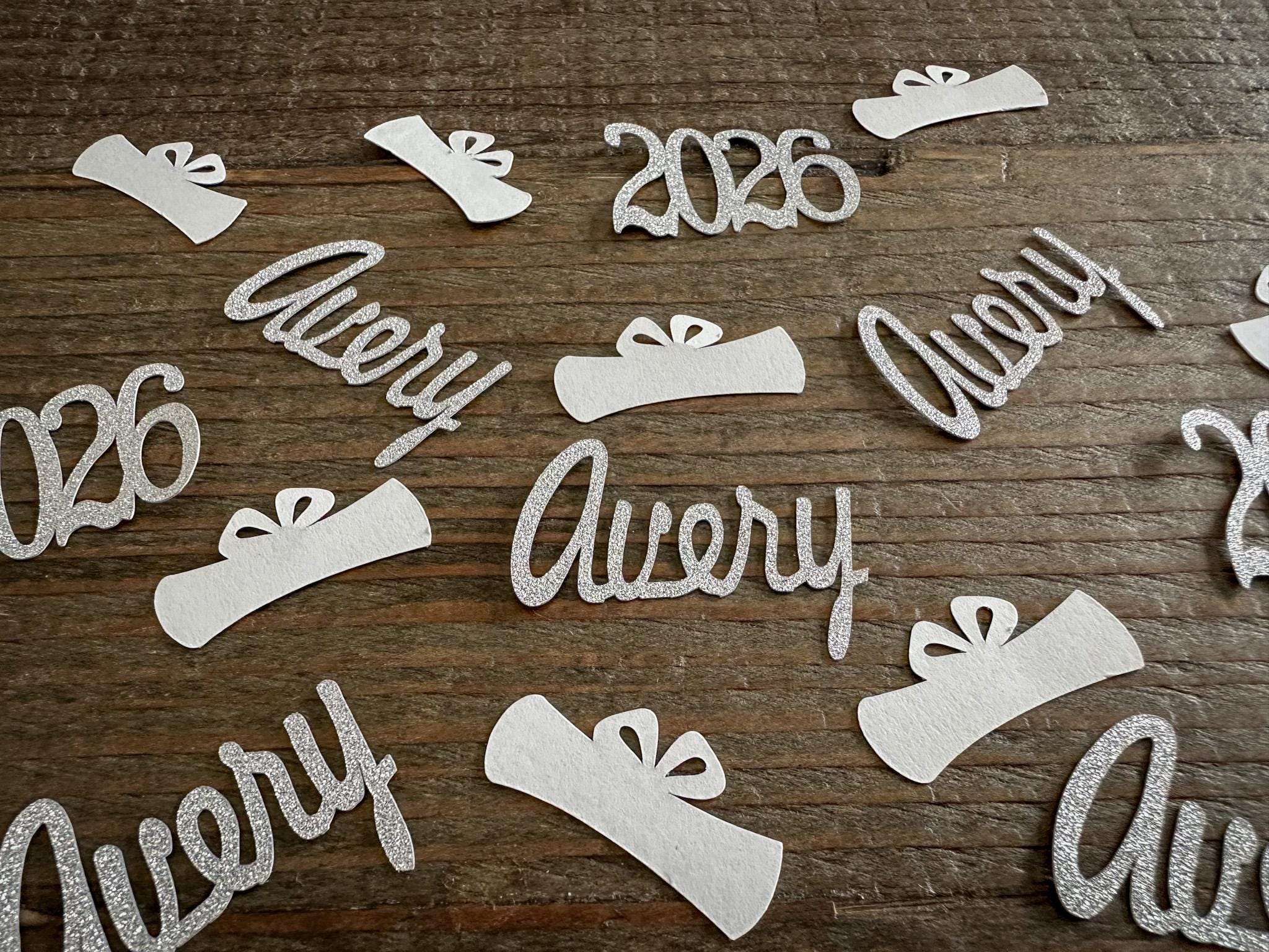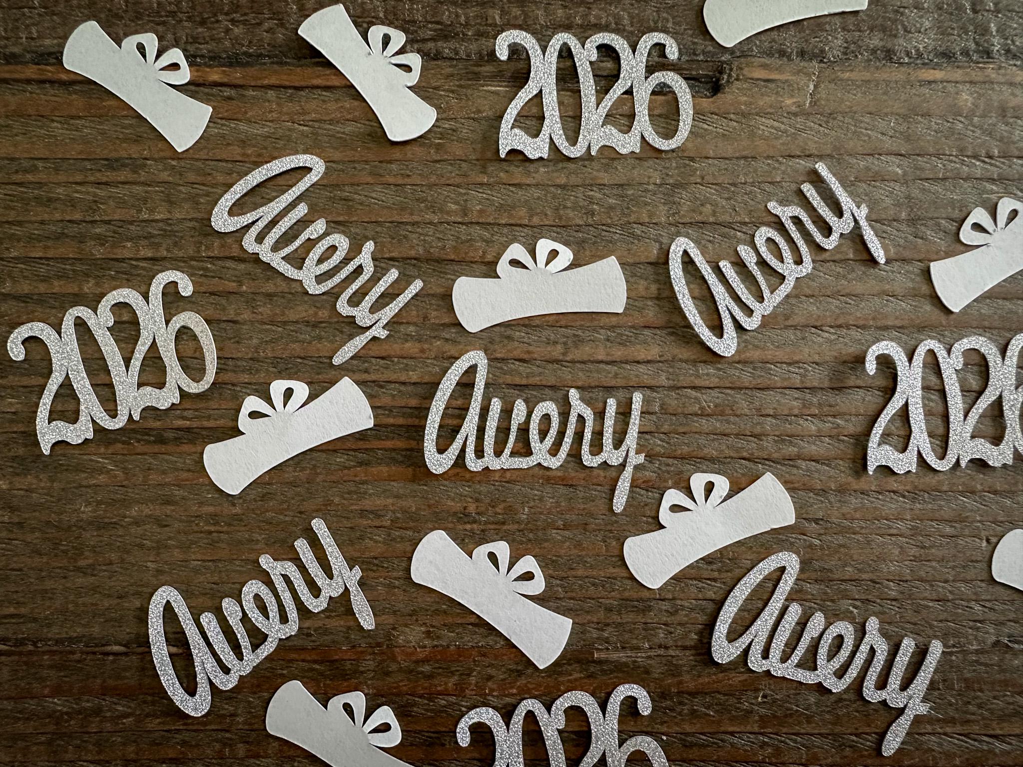 This listing is for 100 pieces of confetti. It includes 20 pieces of silver name confetti made with silver glitter paper (white on the reverse), 20 pieces of glitter silver 2026 (white on the reverse), and 60 pieces of white diplomas. The name pieces measure approximately 1 inch in height and the length varies based on the name, the diplomas measure 1.25 inches, and the 2026 measure 1.25 inches.