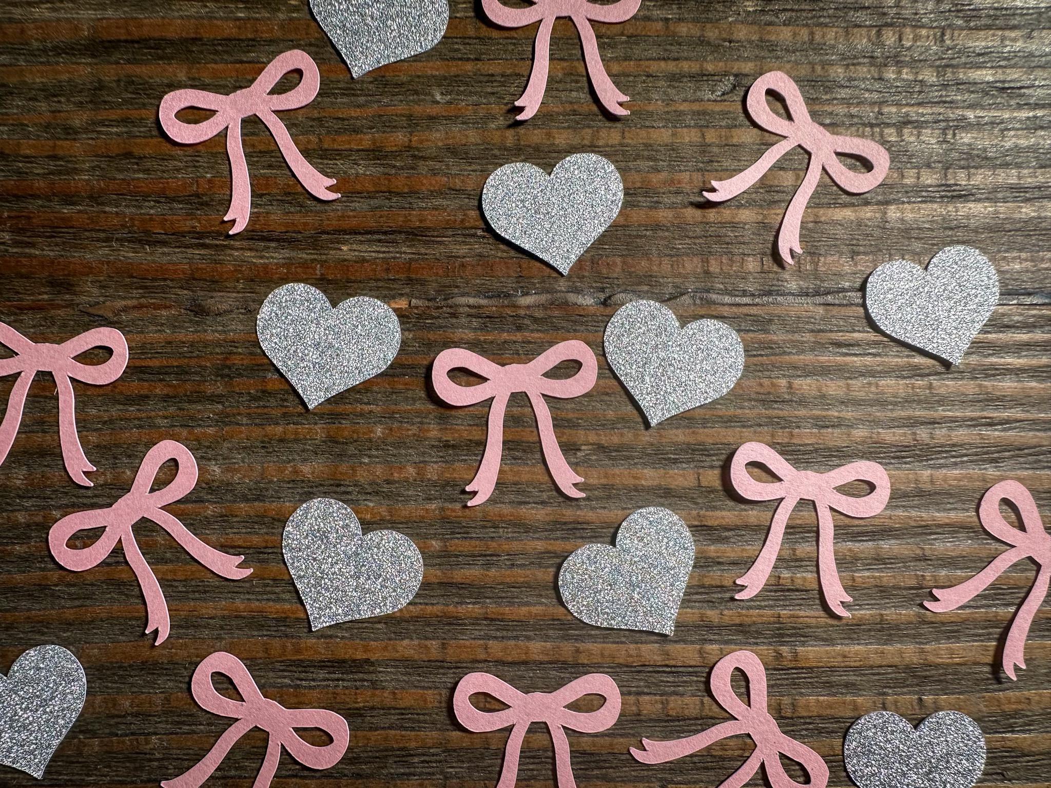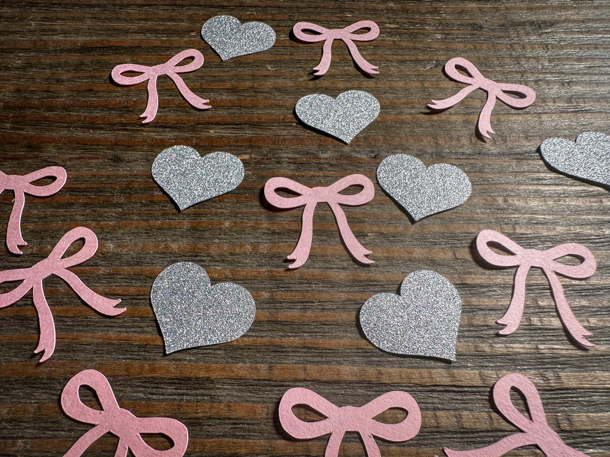 This listing is for 100 pieces of confetti and is available in different colors. It includes 30 hearts and 70 bows.The bows are made from premium cardstock and measures approximately 1 inch and the hearts are made from silver glitter cardstock and measure approximately .75 inches in diameter. The glitter cardstock is white on the reverse side.