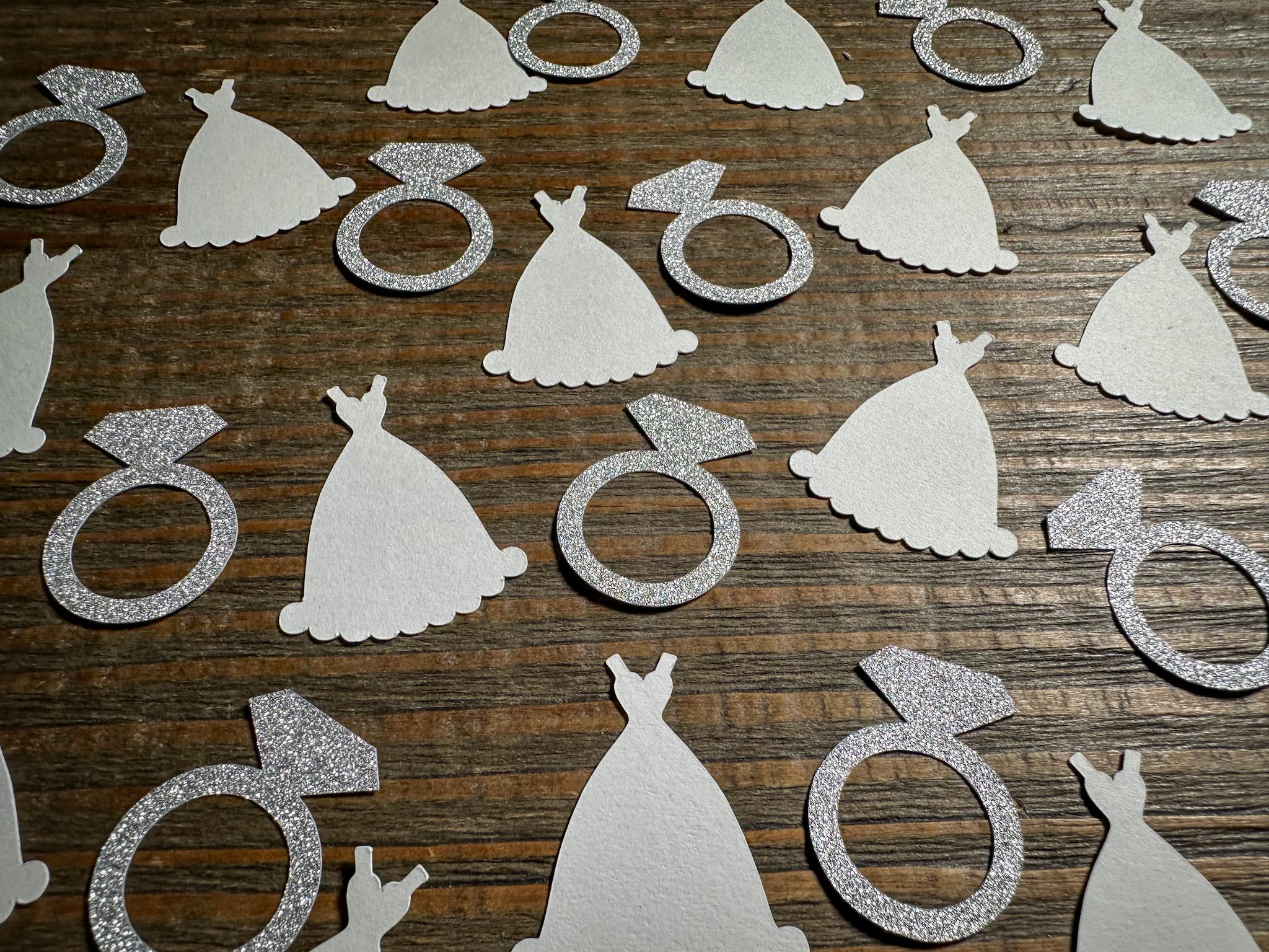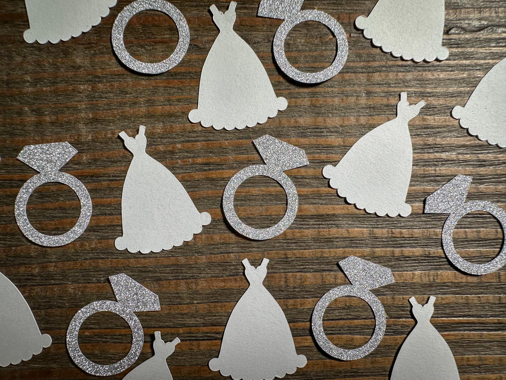 This listing is for 100 pieces of confetti! It includes 40 pieces of wedding dresses and 60 rings. The dresses are made from premium cardstock and measure approximately 1.5 inches in height. The rings are made of premium glitter cardstock, measure .75 inches, and are white on the reverse side. The rings are also available in silver glitter.