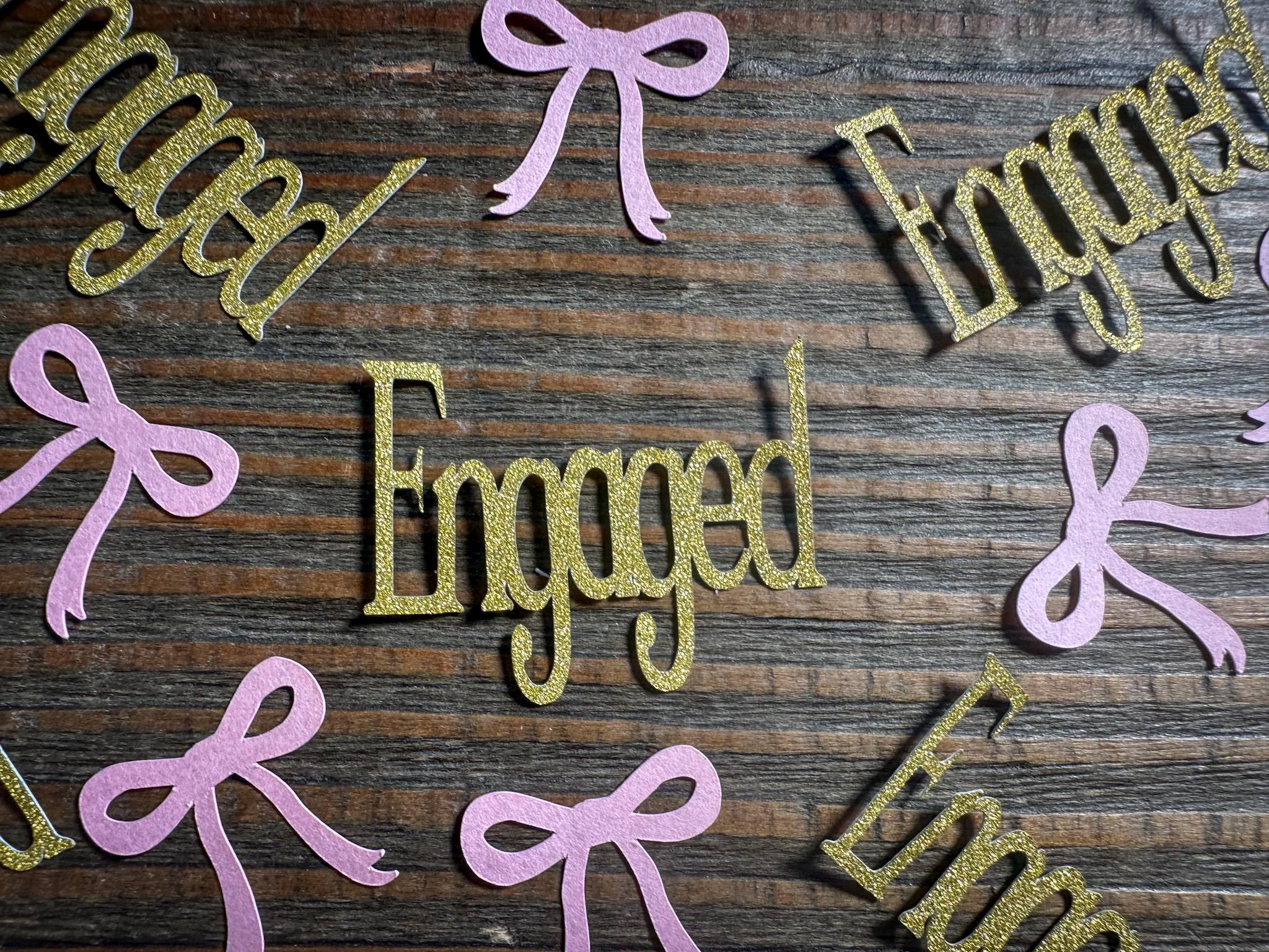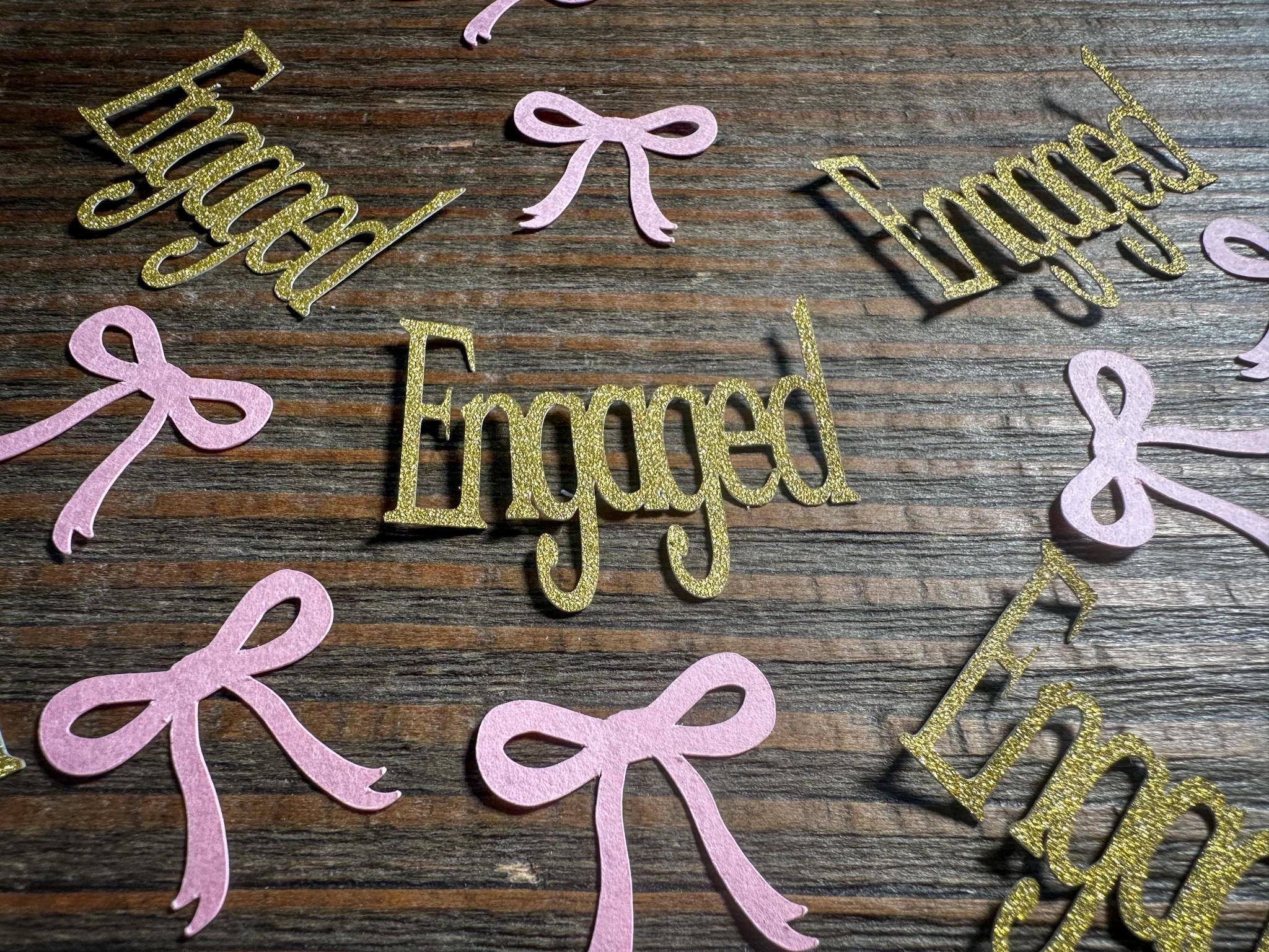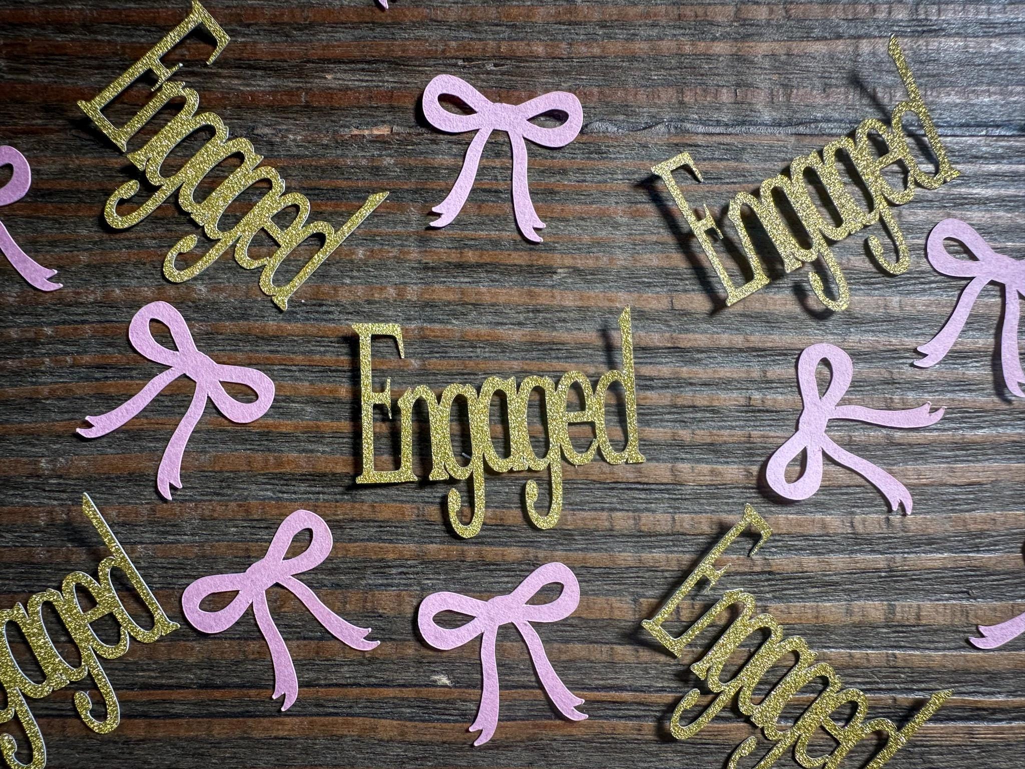 This listing is for 100 pieces of confetti and is available in different colors. It includes 20 engaged pieces and 80 bows.The bows are made from premium cardstock and measures approximately 1 inch and the engaged pieces are made from gold glitter cardstock. The glitter cardstock is white on the reverse side.