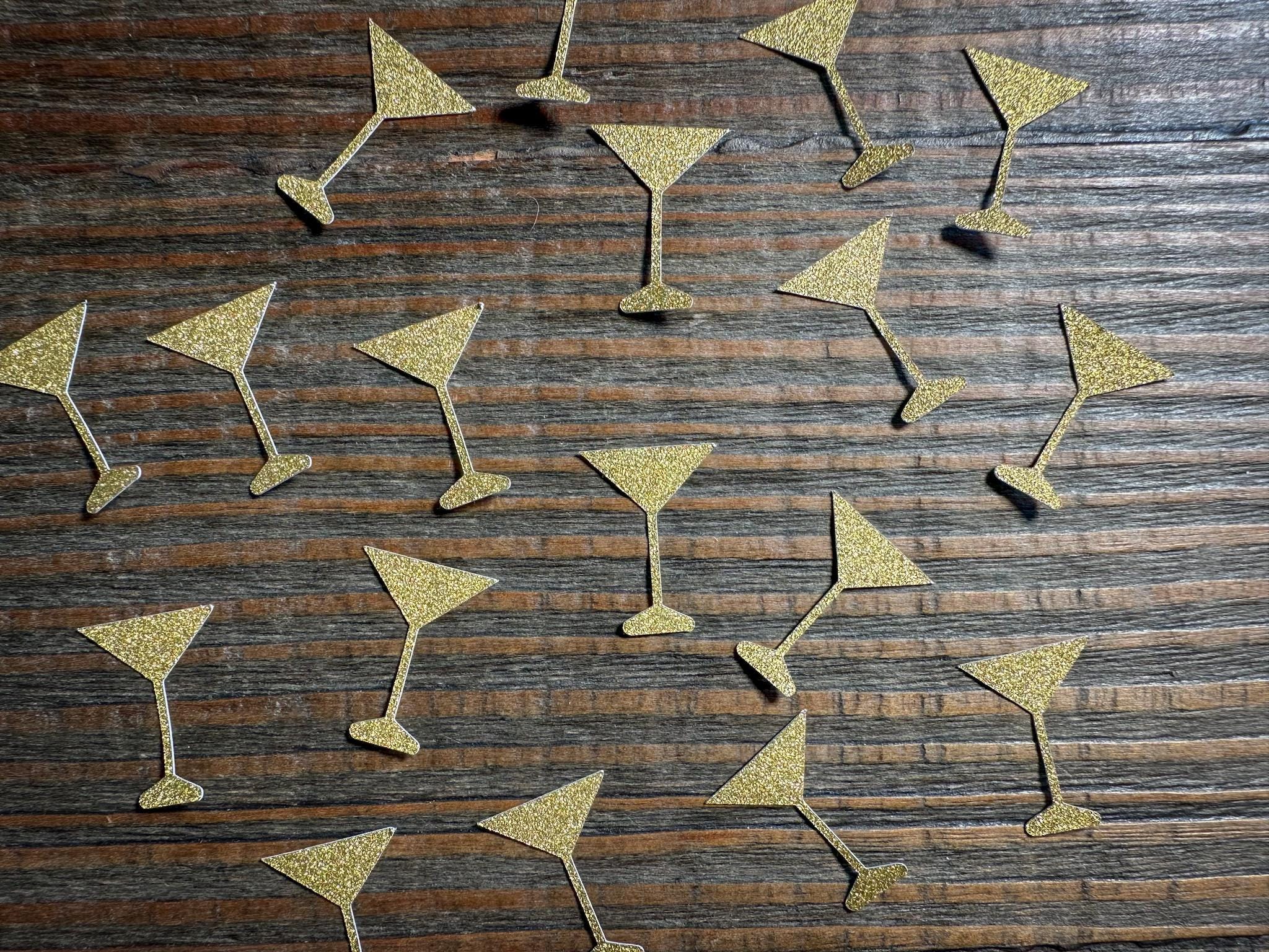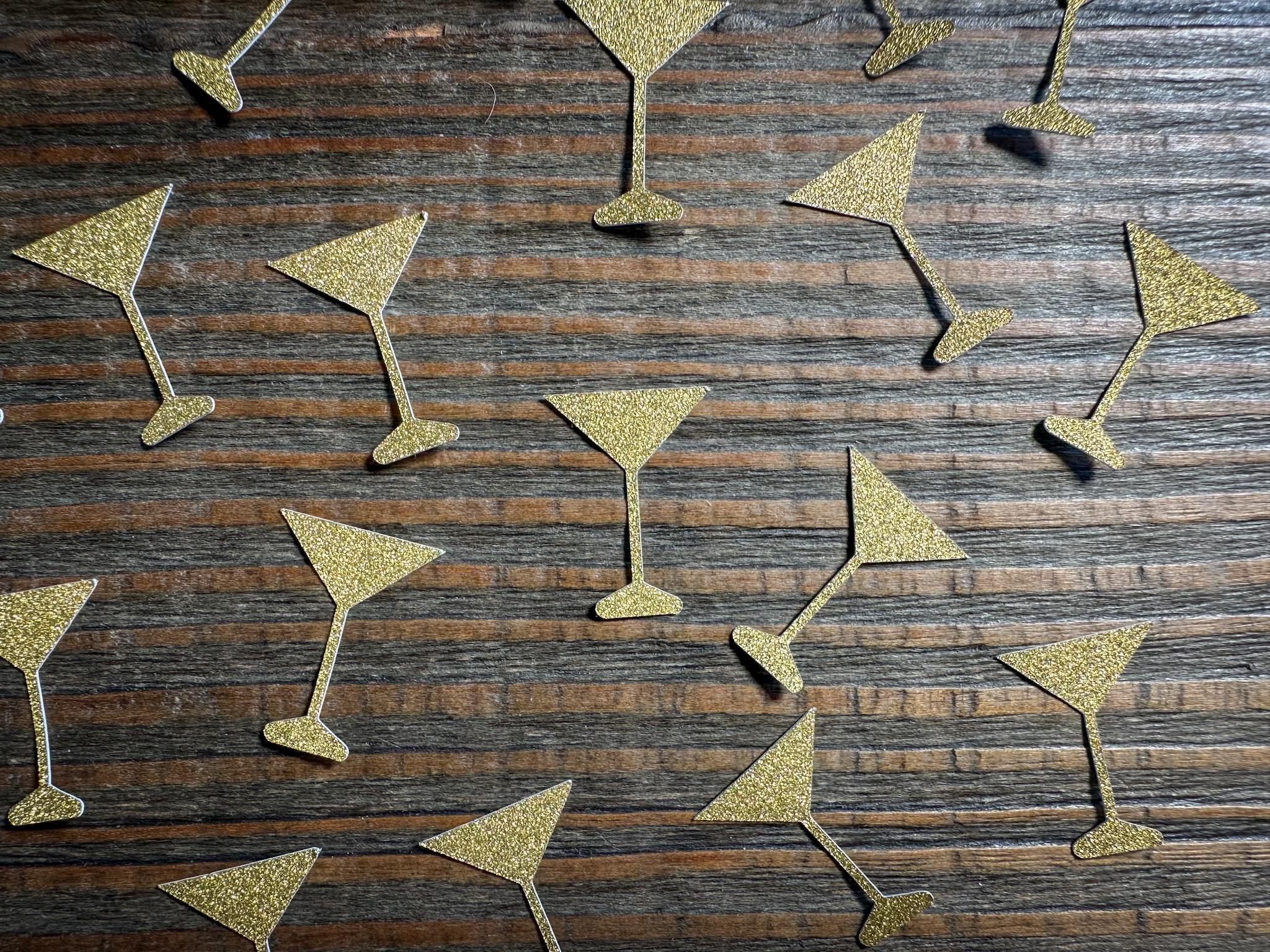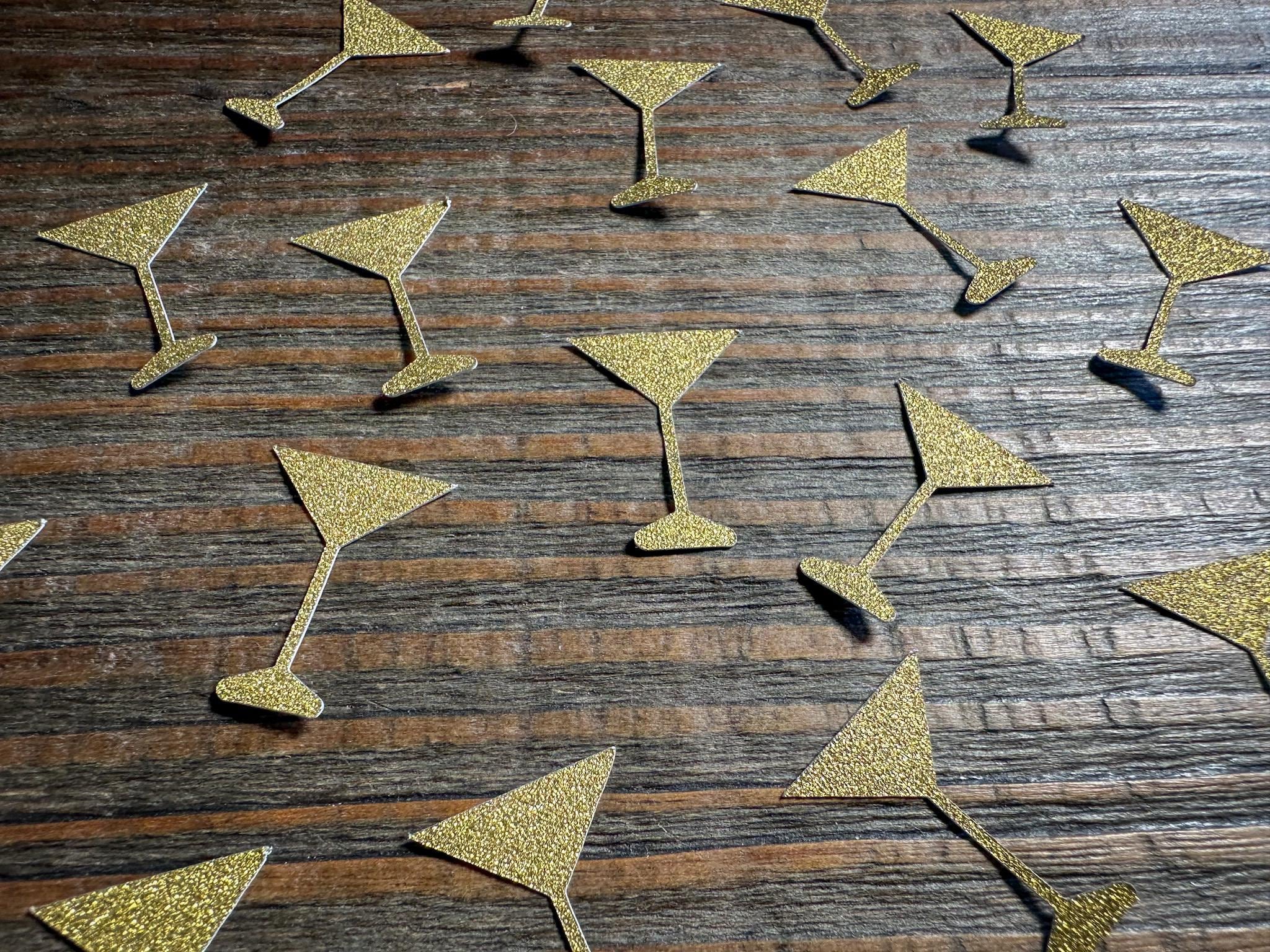 This listing is for 100 pieces of gold glitter martini glasses. The martini glass is made from premium glitter cardstock that is white on the reverse side.. Each pieces measures approximately 1 inch in height. This confetti is also available in silver glitter. I you would like a different color please message me for a custom listing!