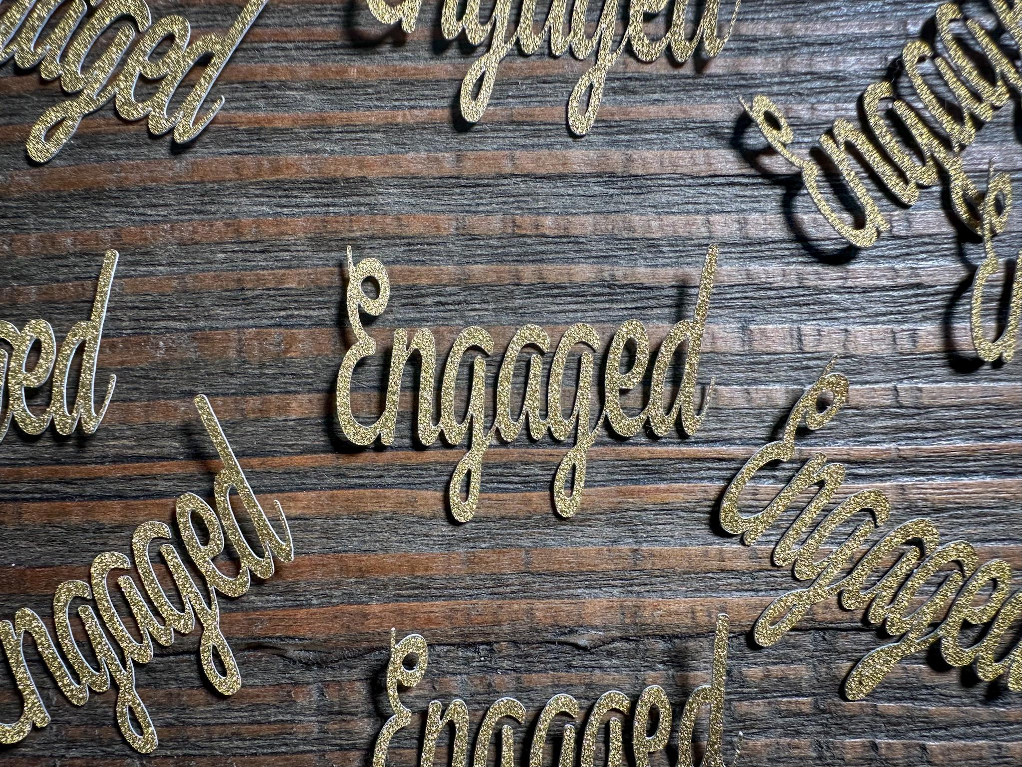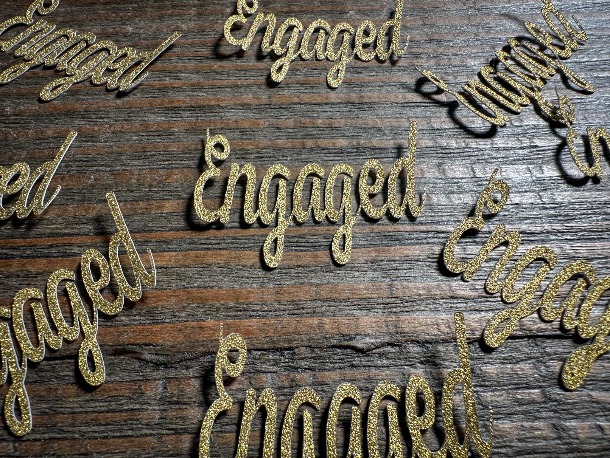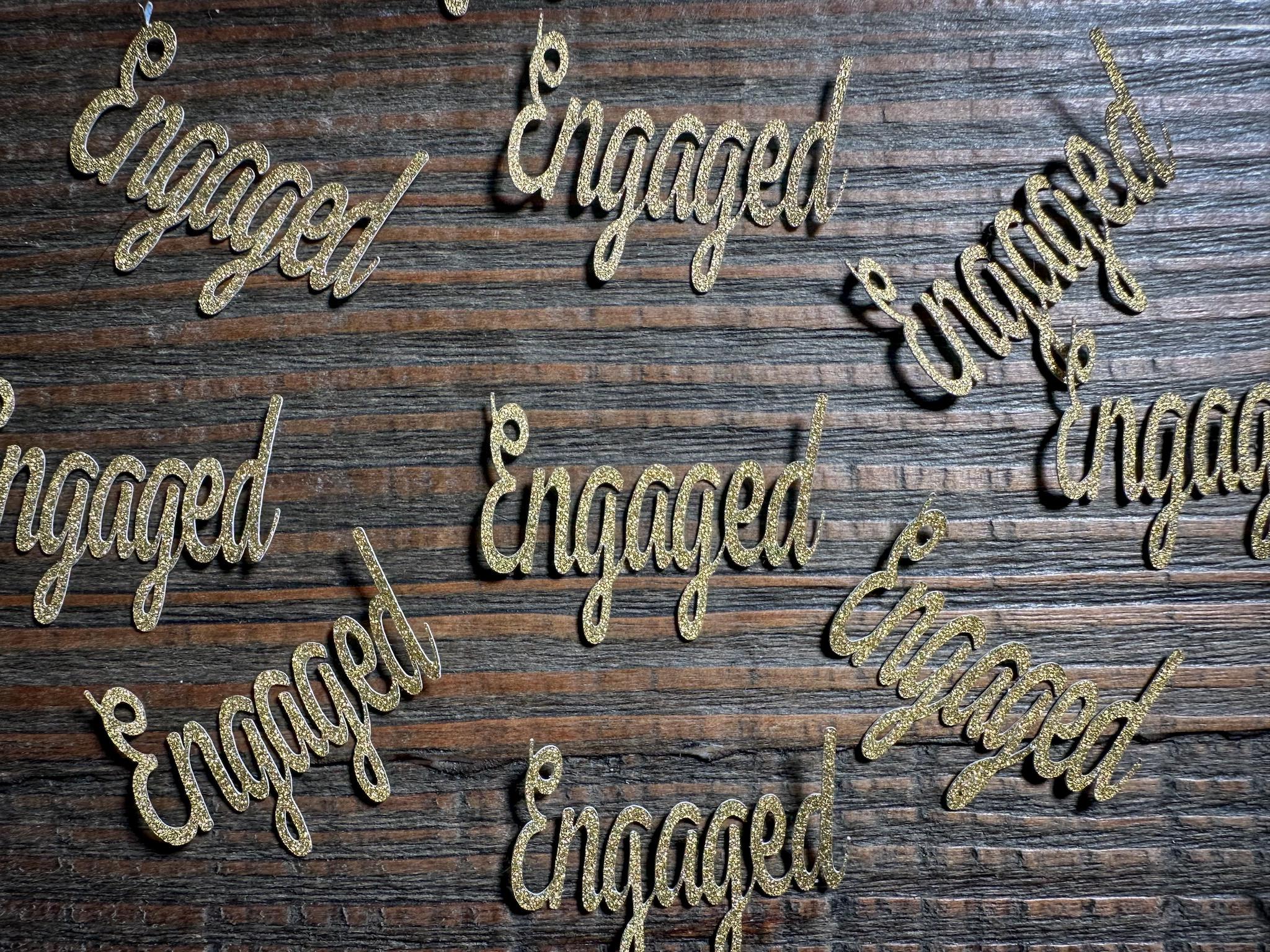 This listing is for 30 pieces of engaged confetti! The confetti is made from premium glitter cardstock that is white on the reverse side. The Engaged pieces measures approximately 1.75 inches.