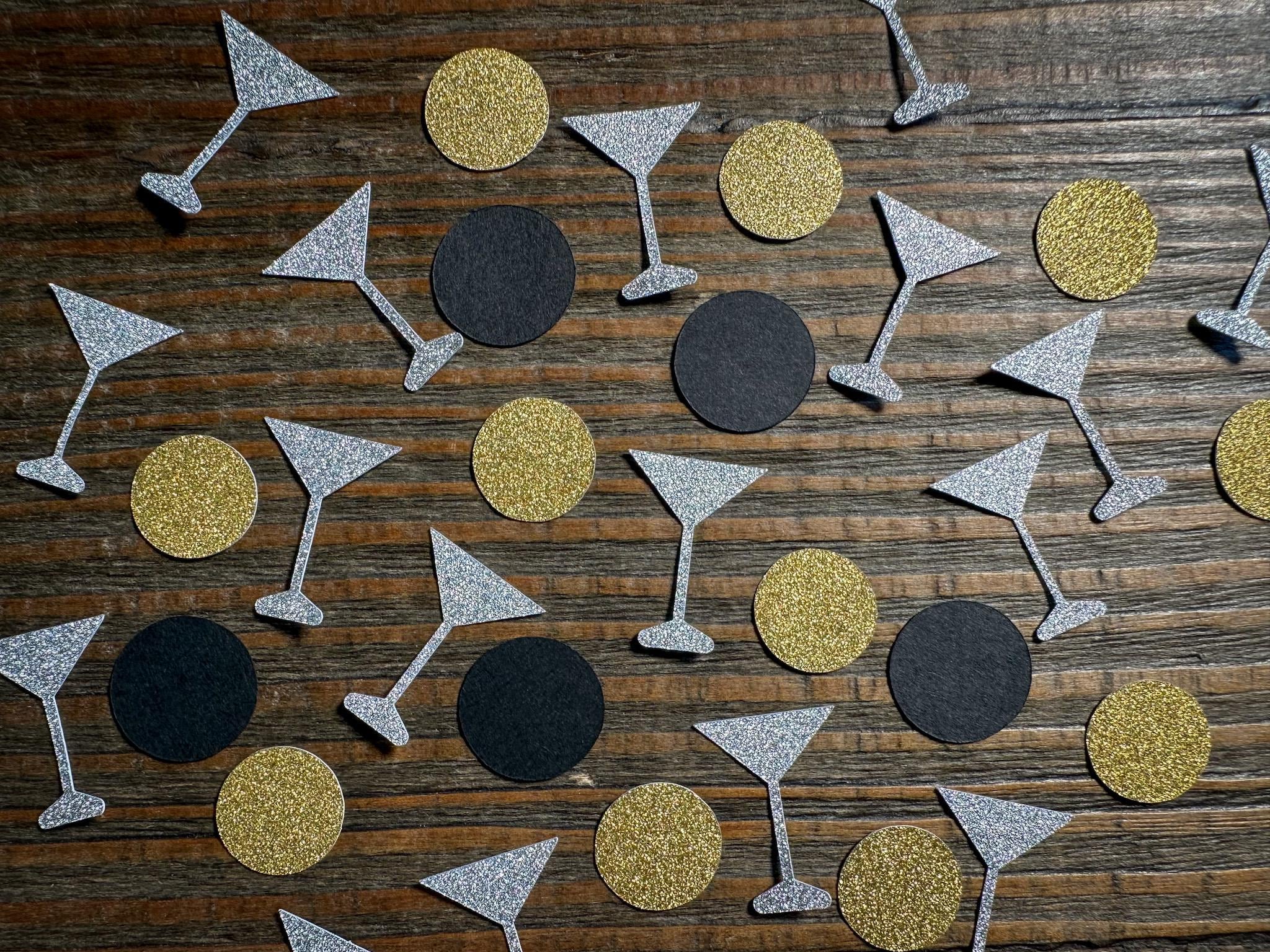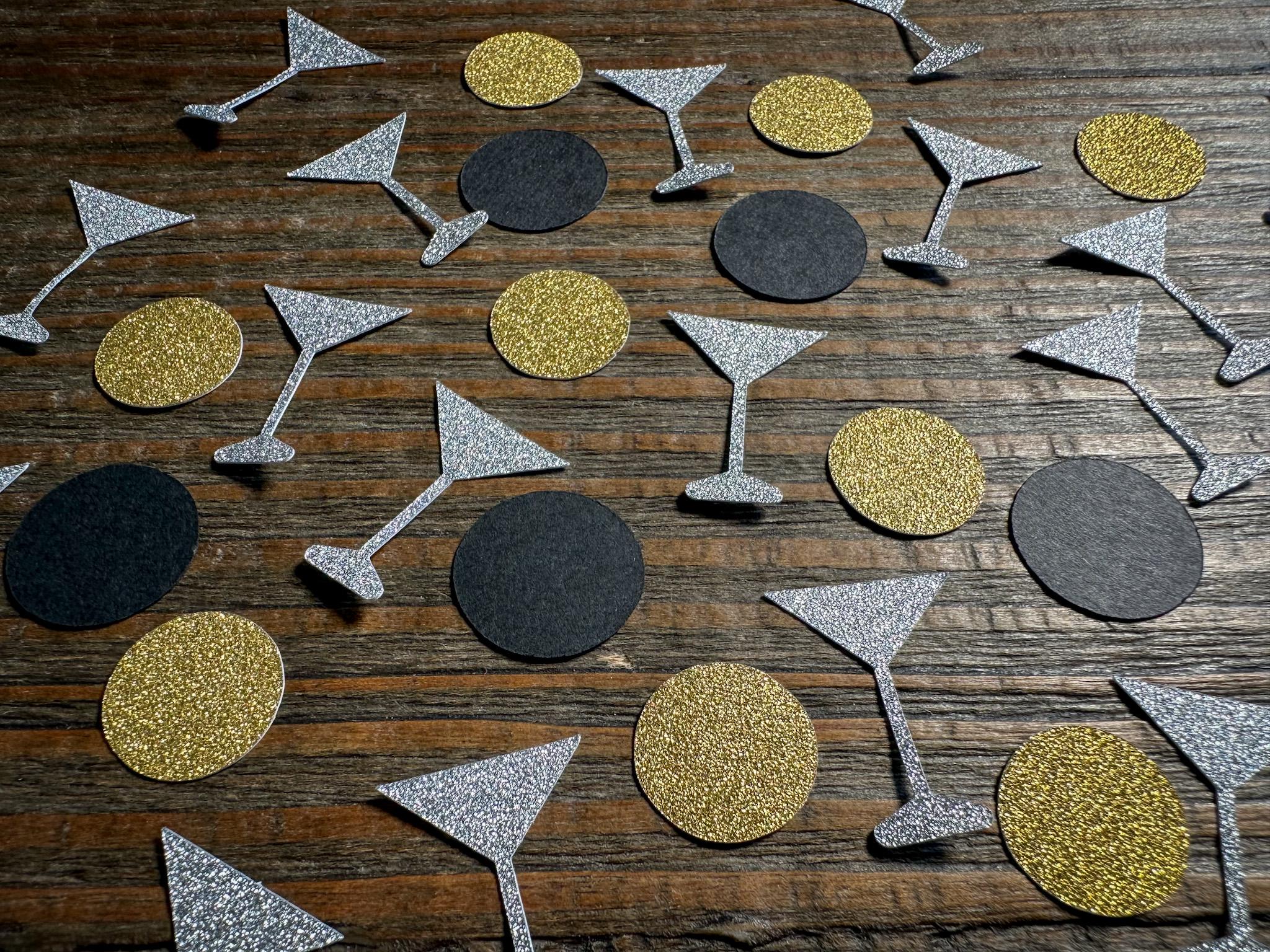 This listing is for 100 pieces of confetti. It includes 40 silver glitter martini glasses, 30 black circles, and 30 gold glitter circles. The glitter confetti is white on the reverse side. The martini glasses measure approximately 1 inch in height and the circles measure approximately .75 inches in diameter.