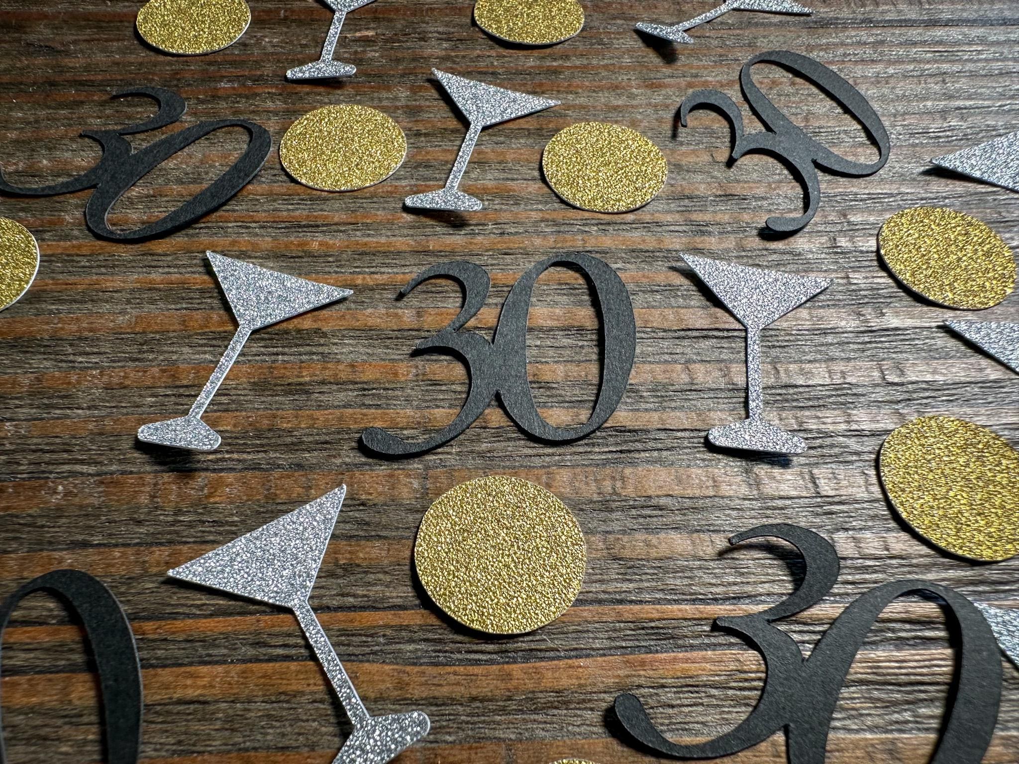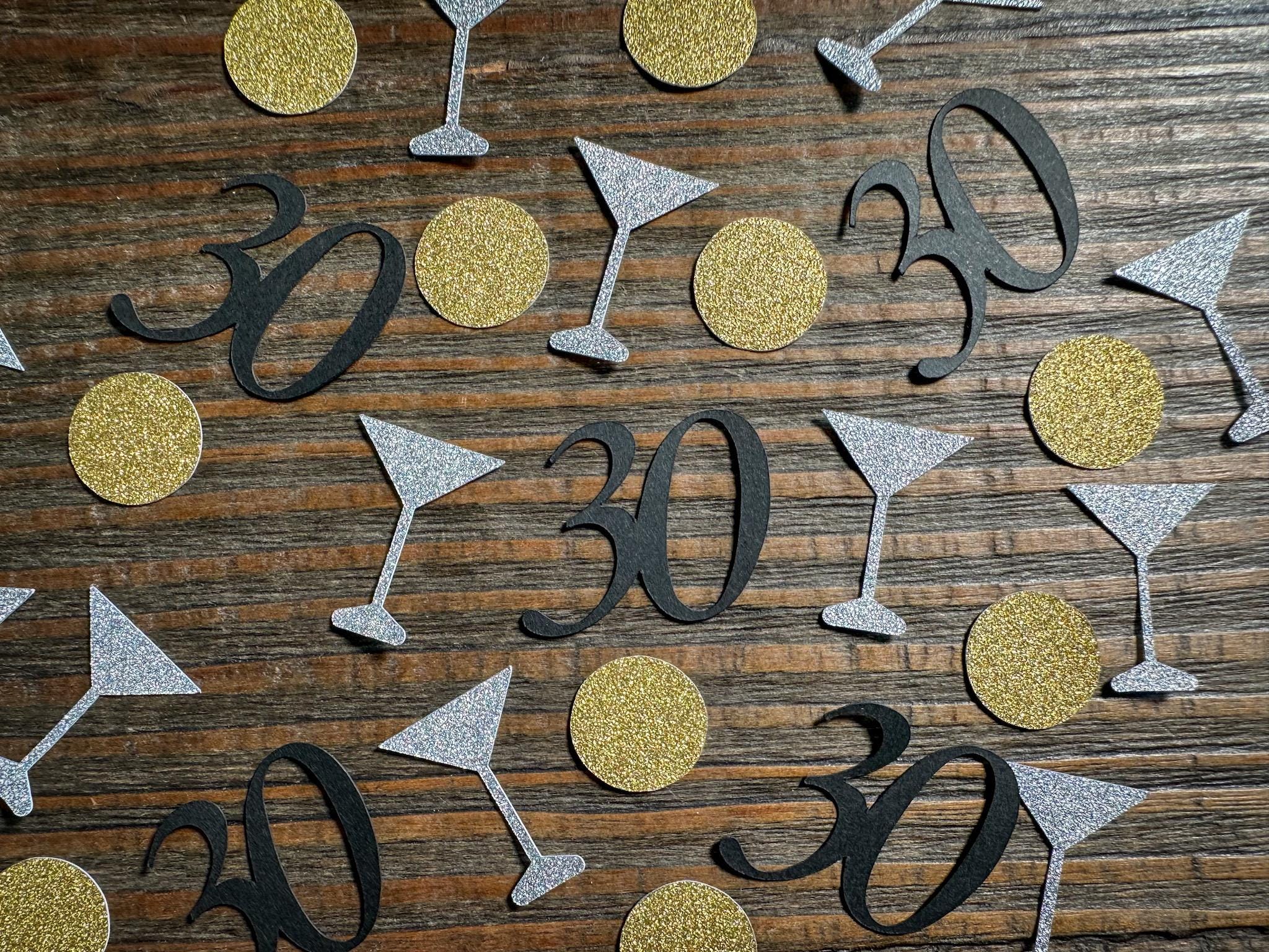 This listing is for 100 pieces of confetti. It includes 25 black age pieces, 25 silver glitter martini glasses and 50 gold glitter circles. The glitter confetti is white on the reverse side. The martini glasses measure approximately 1 inch in height and the circles measure approximately .75 inches in diameter.
