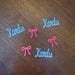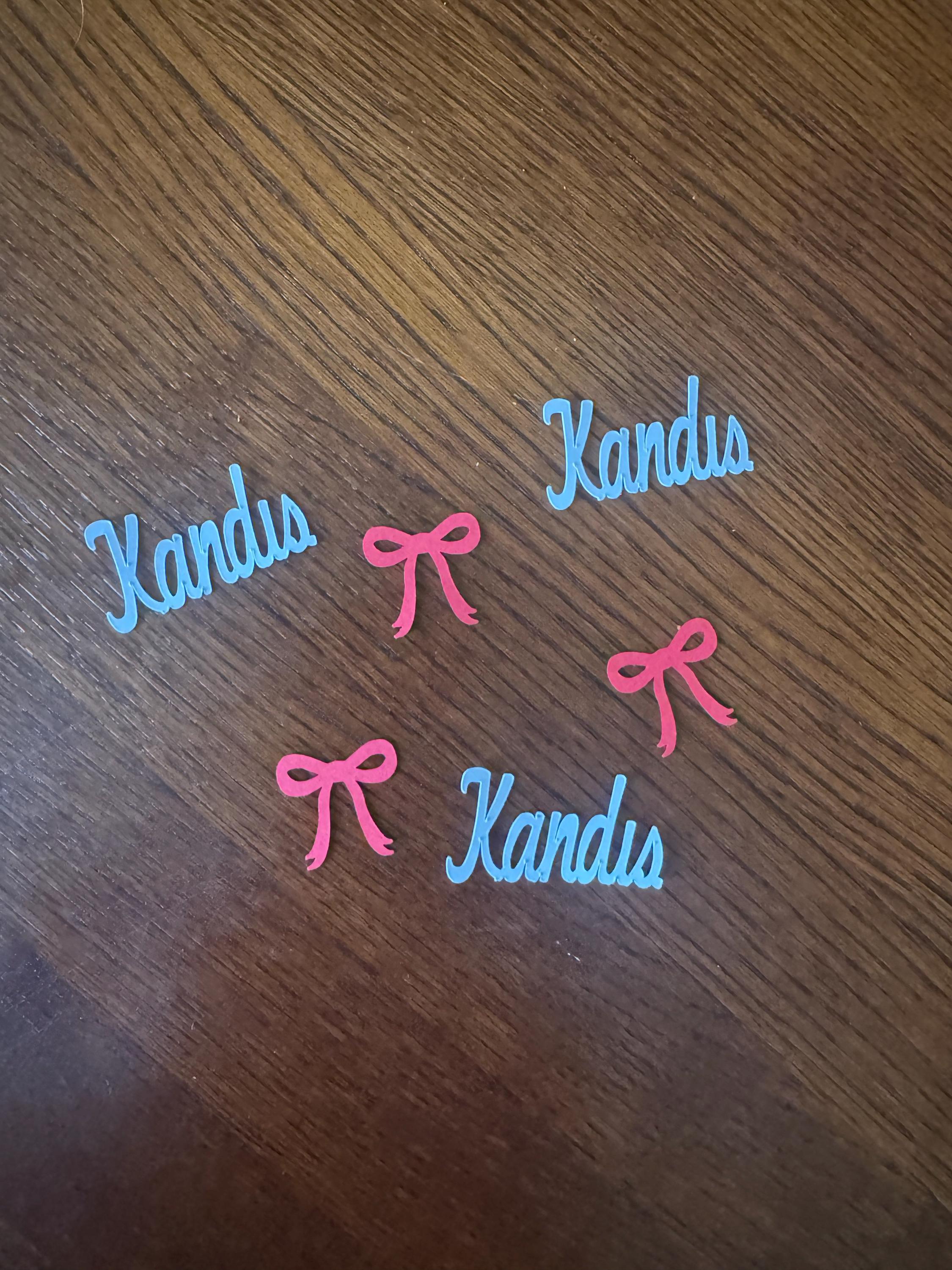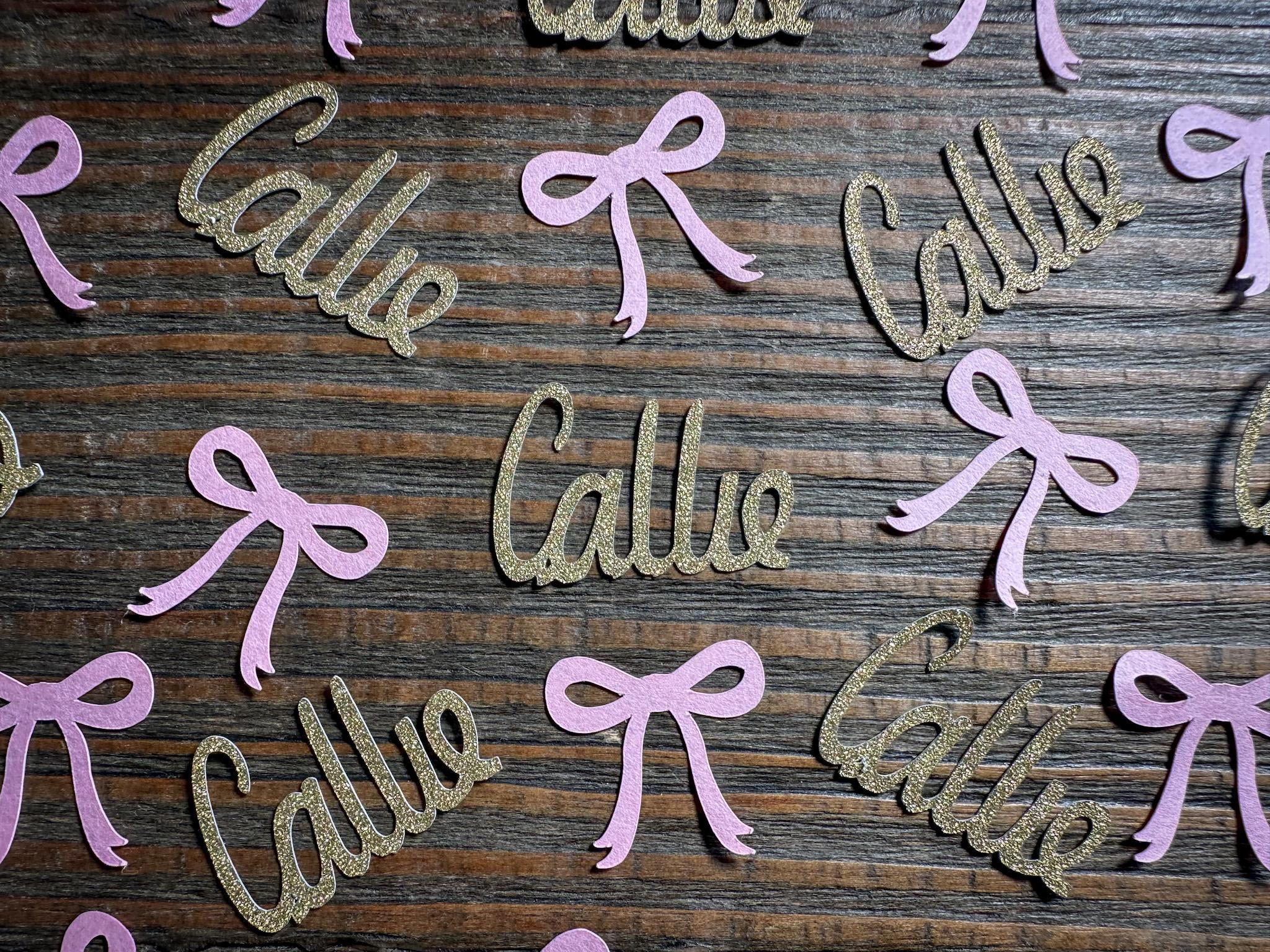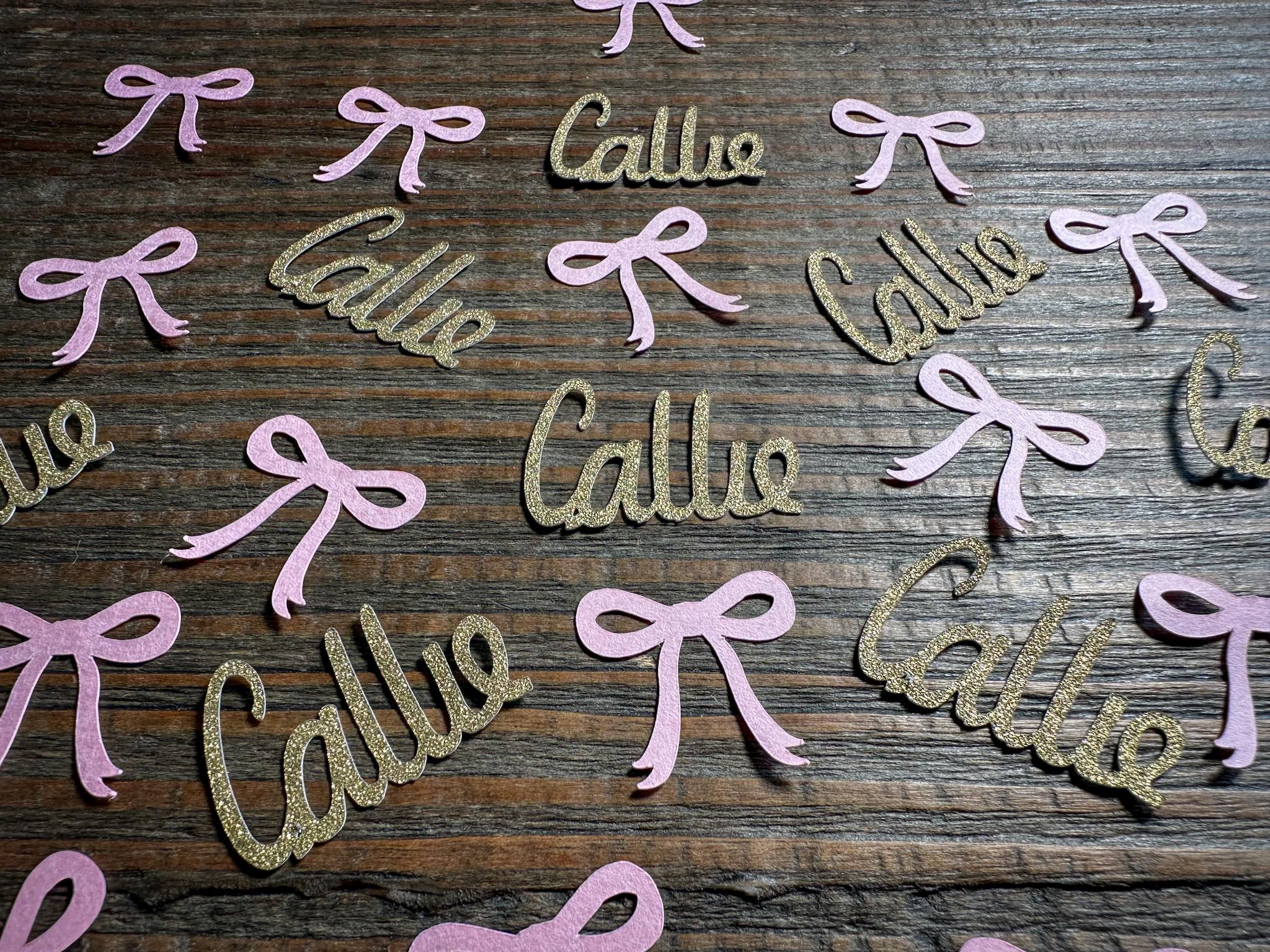 This listing is for 100 pieces of confetti and is available in different colors. It includes 25 name pieces and 75 bows.The bows are made from premium cardstock and measures approximately 1 inch and the names are made from gold glitter cardstock and measure approximately .75-1 inch in height and the length varies based on the name. The glitter cardstock is white on the reverse side.