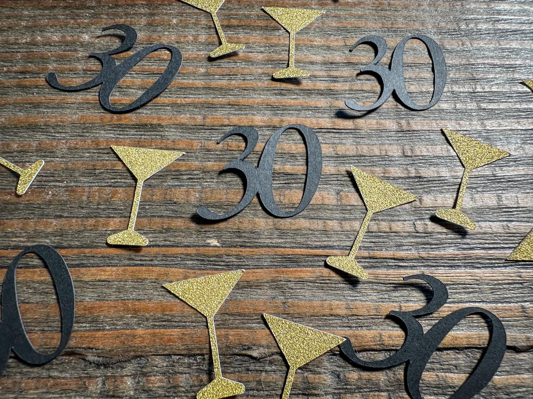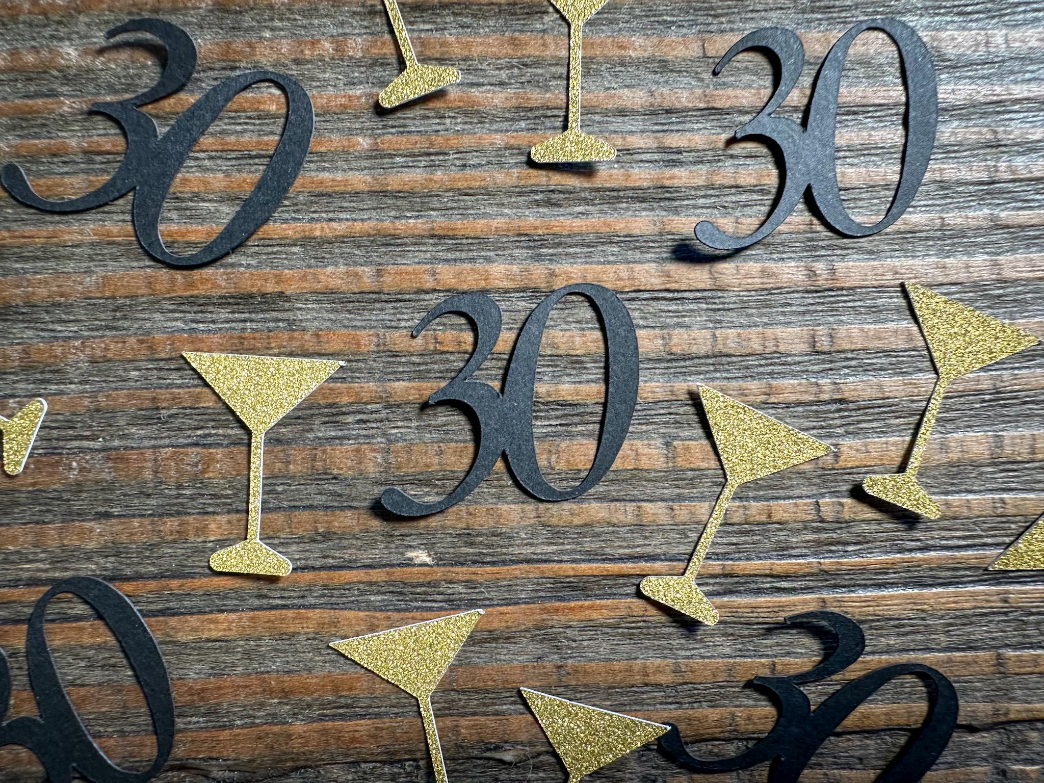 This listing is for 100 pieces of confetti. It includes 25 black age pieces and 75 gold glitter martini glasses. The glitter confetti is white on the reverse side. The martini glasses measure approximately 1 inch in height.