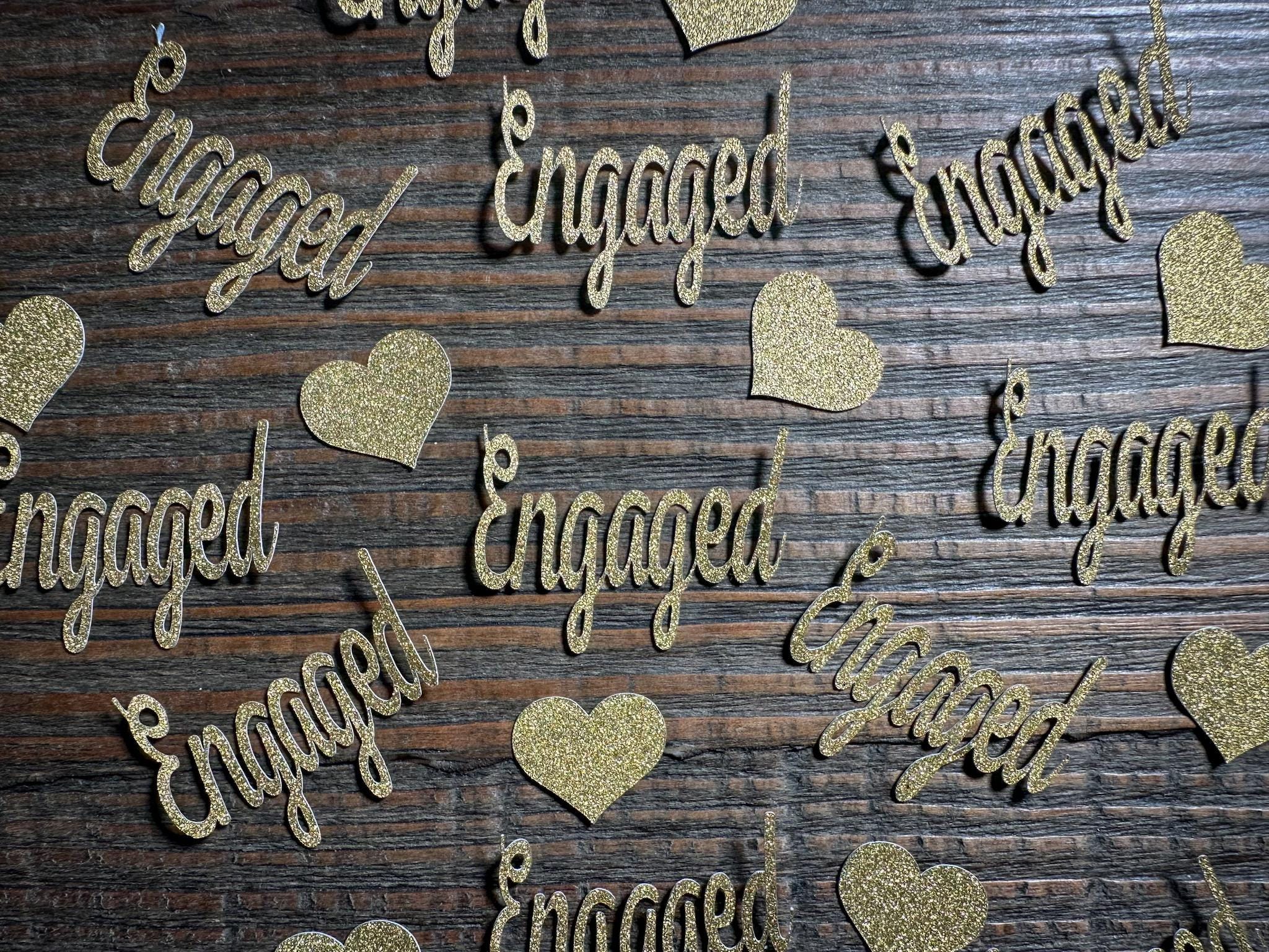 This listing is for 75 pieces of confetti! It includes 25 Engaged pieces and 50 hearts made form premium gold glitter card stock that is white on the reverse side. The Engaged pieces measures approximately 1.75 inches and the hearts measure approximately 3/4 inch.