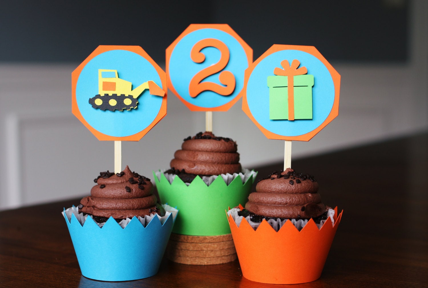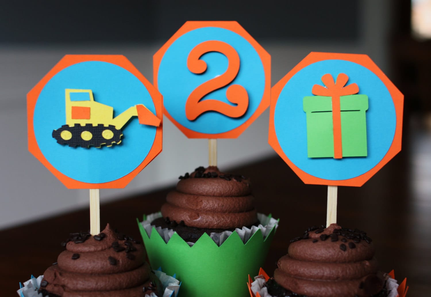 This listing is for 12 cupcake toppers. Each topper measure approximately 2. 5 inches and is made of heavy duty card stock and a forked bamboo tick. The listing includes 4 of each of three designs: excavator, present, and age.