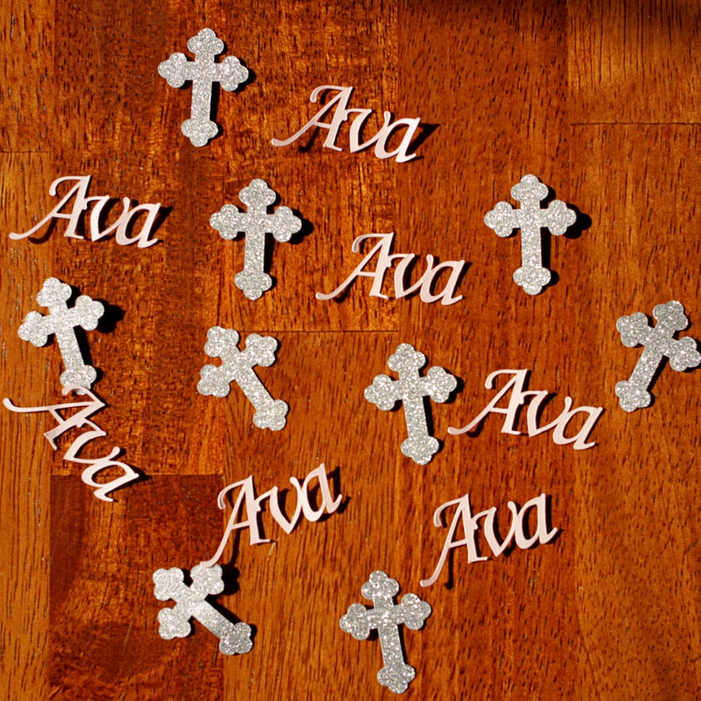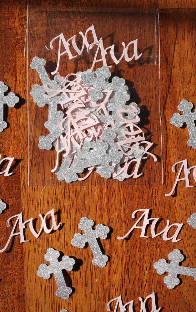 This listing is for 100 pieces of confetti. It includes 75 silver glitter crosses and 25 personalized name pieces in light pink card stock. The glitter crosses measure approximately 1.25 inches tall and are white on the reverse side. The name confetti is light pink and the size varies based on the name.