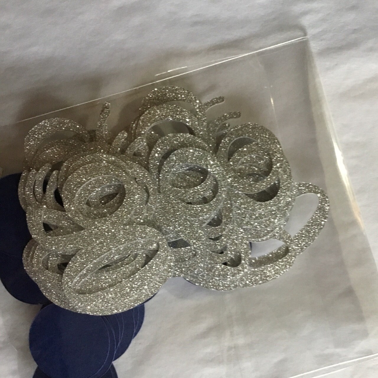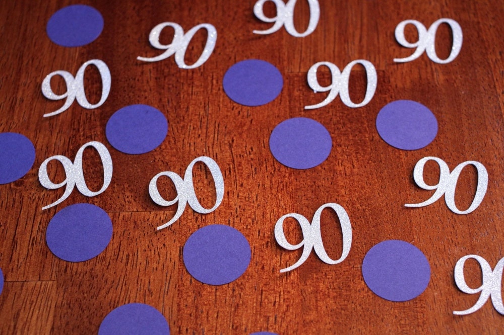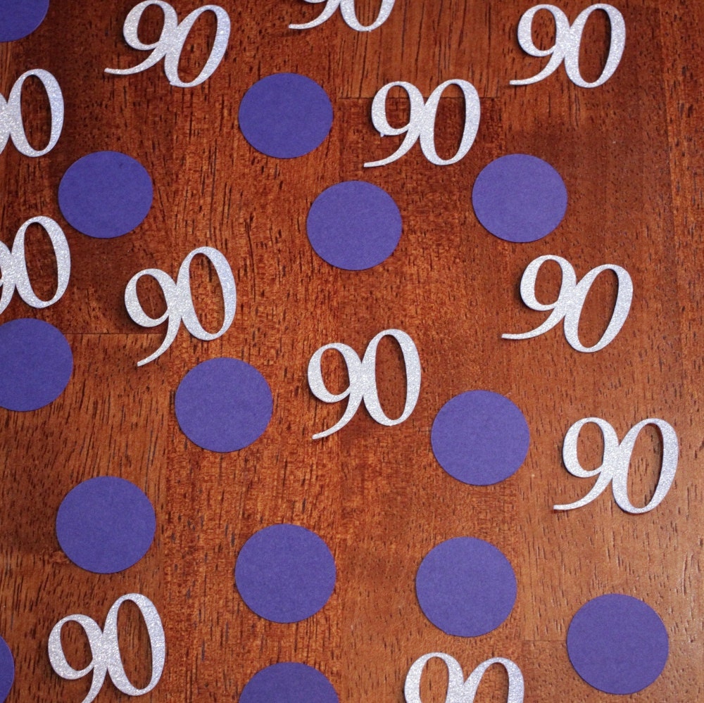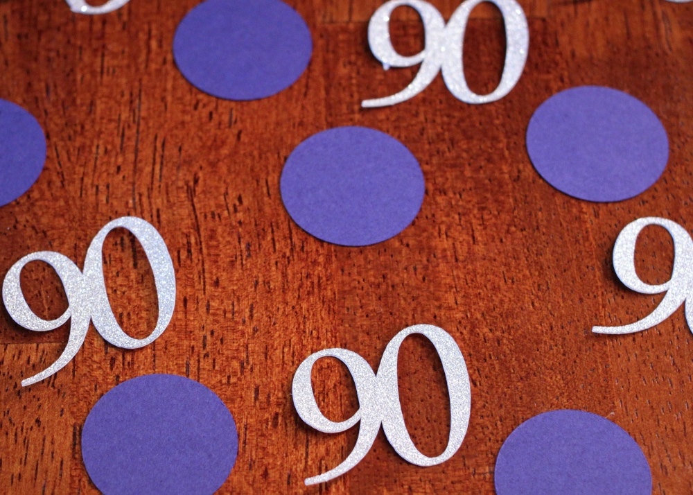 This listing is for 100 pieces of confetti. It includes 30 pieces of age confetti in premium silver glitter paper that is white on the reverse side. The size will change based on the age but is typically 1 to 1.5 inches wide. Also included are 70 pieces of navy blue circle confetti.