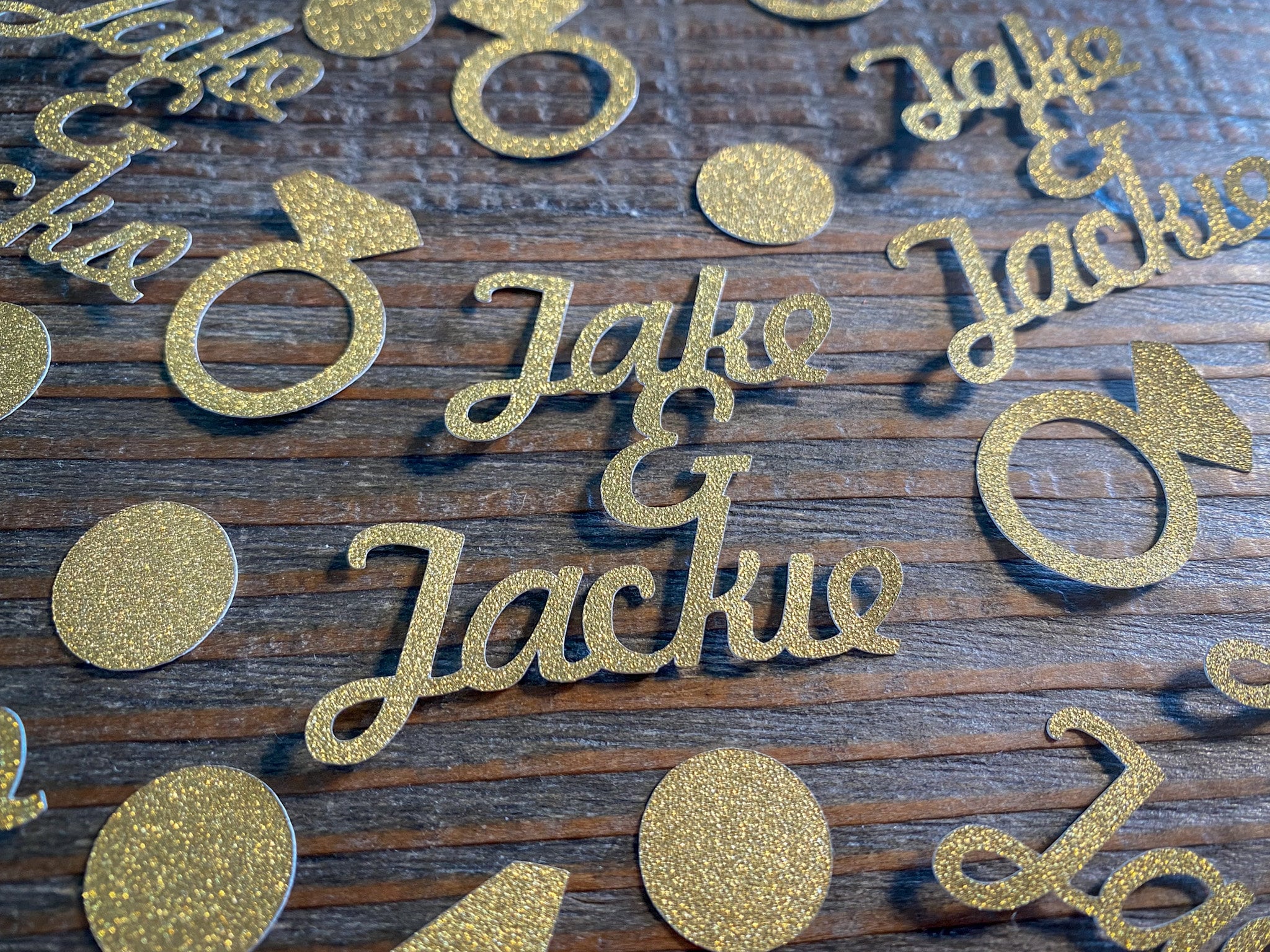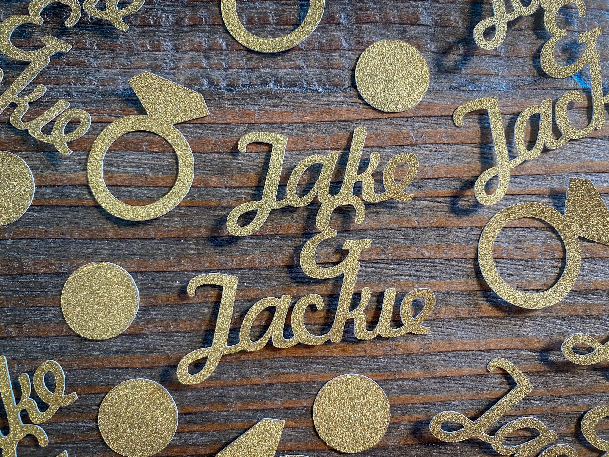 This listing is for 50 pieces of confetti! It includes 15 pieces of personalized name confetti, 15 pieces of ring confetti, and 20 pieces of gold glitter circles. All of the pieces are made of premium gold glitter cardstock and is white on the reverse side. The size of the names will vary depending on the length of the names.