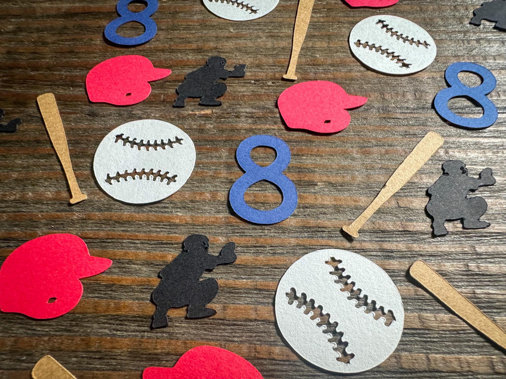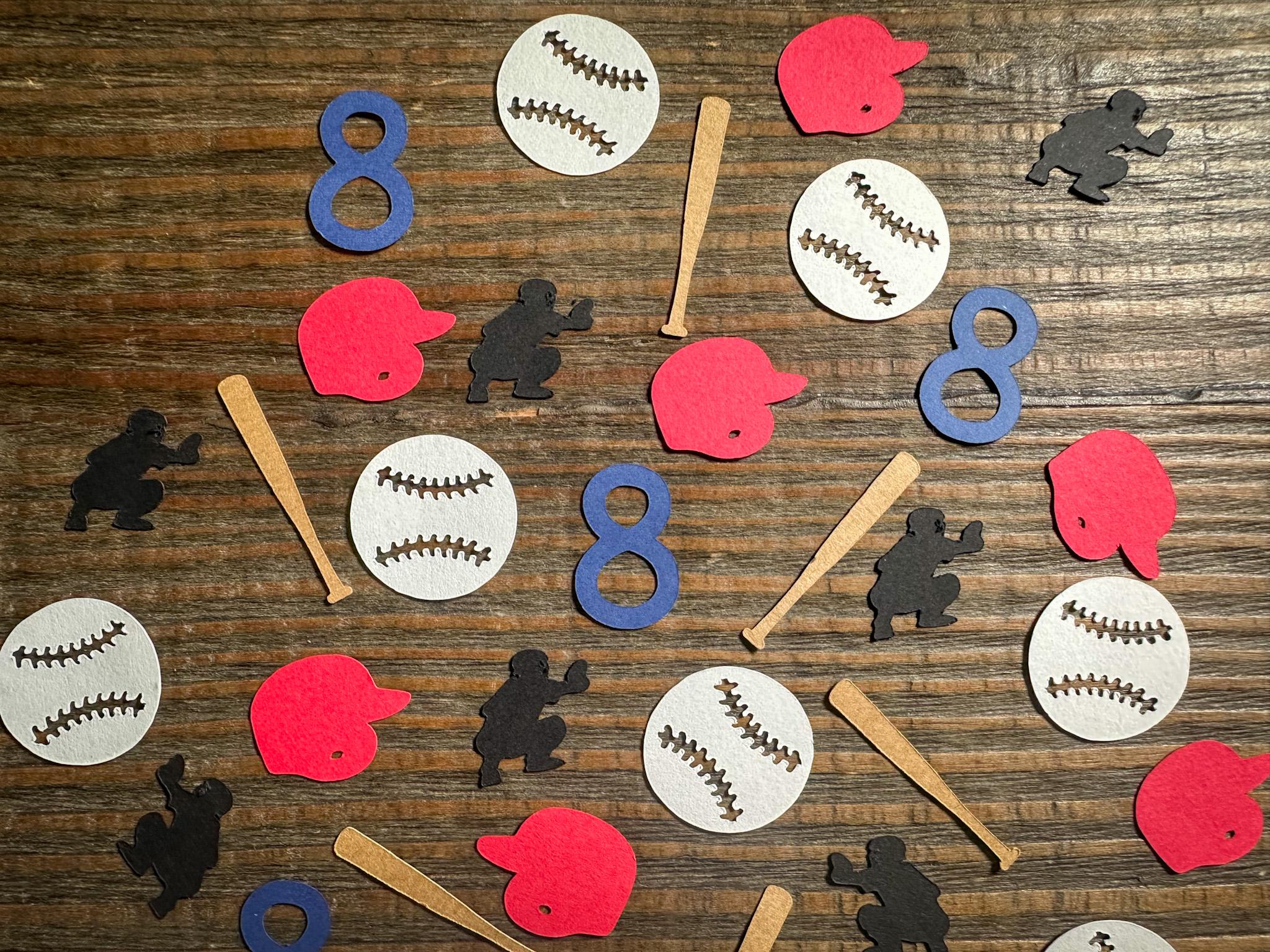 This listing is for 100 pieces of confetti! It includes 20 ages, 20 bats, 20 helmets, 20 catcher cutouts, and 20 baseballs. It is made from premium 67 lb cardstock. The bat measures approximately 1.5 inches, the ball measures approximately 1.25 inches, the catcher measures approximately .9 inches, and the helmet measures approximately 1.25 inches. The helmet and numbers are available in different colors. If you would like a color that you don't see listed please message me for a custom listing!