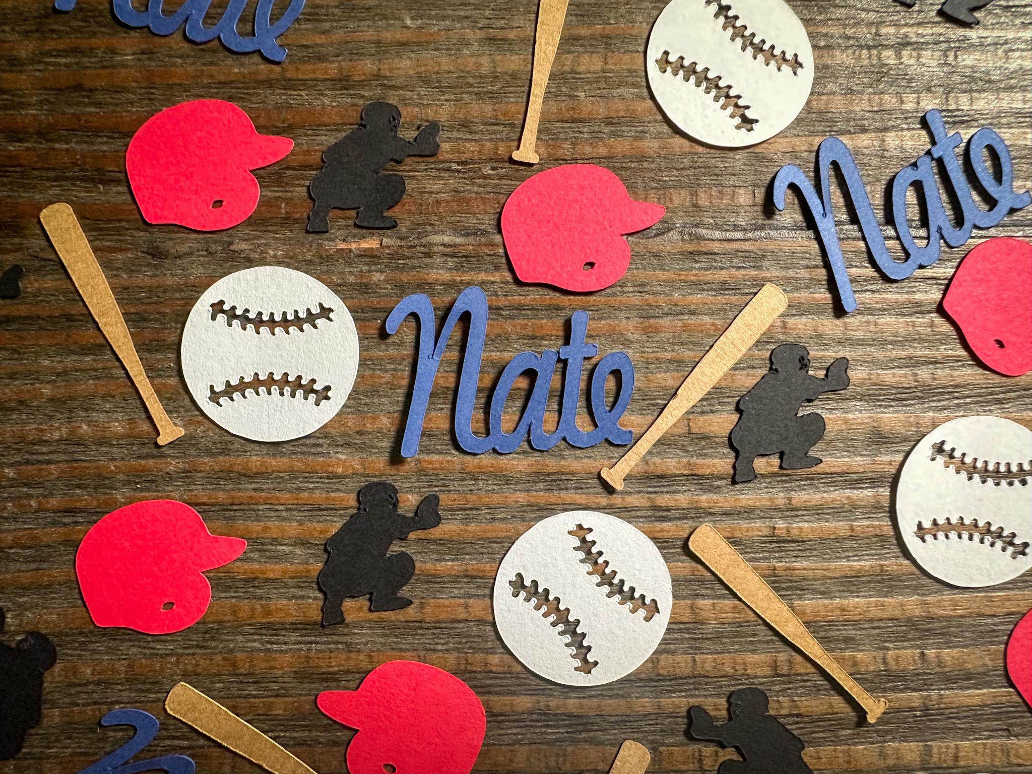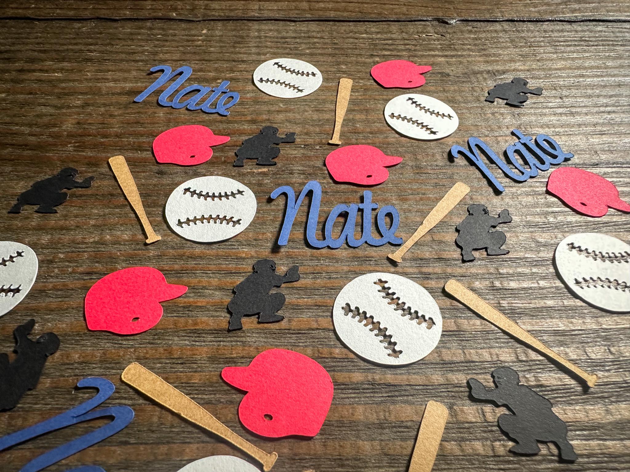 This listing is for 100 pieces of confetti! It includes 20 names, 20 bats, 20 helmets, 20 catcher cutouts, and 20 baseballs. It is made from premium 67 lb cardstock. The bat measures approximately 1.5 inches, the ball measures approximately 1.25 inches, the catcher measure approximately .9 inches, and the helmet measures approximately 1.25 inches. The helmet and names are available in different colors. If you would like a color that you don't see listed please message me for a custom listing!