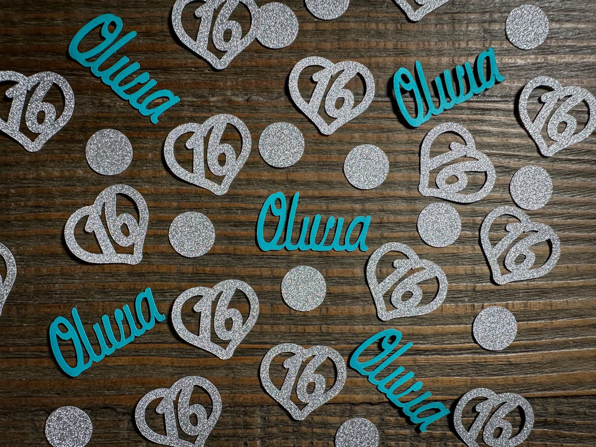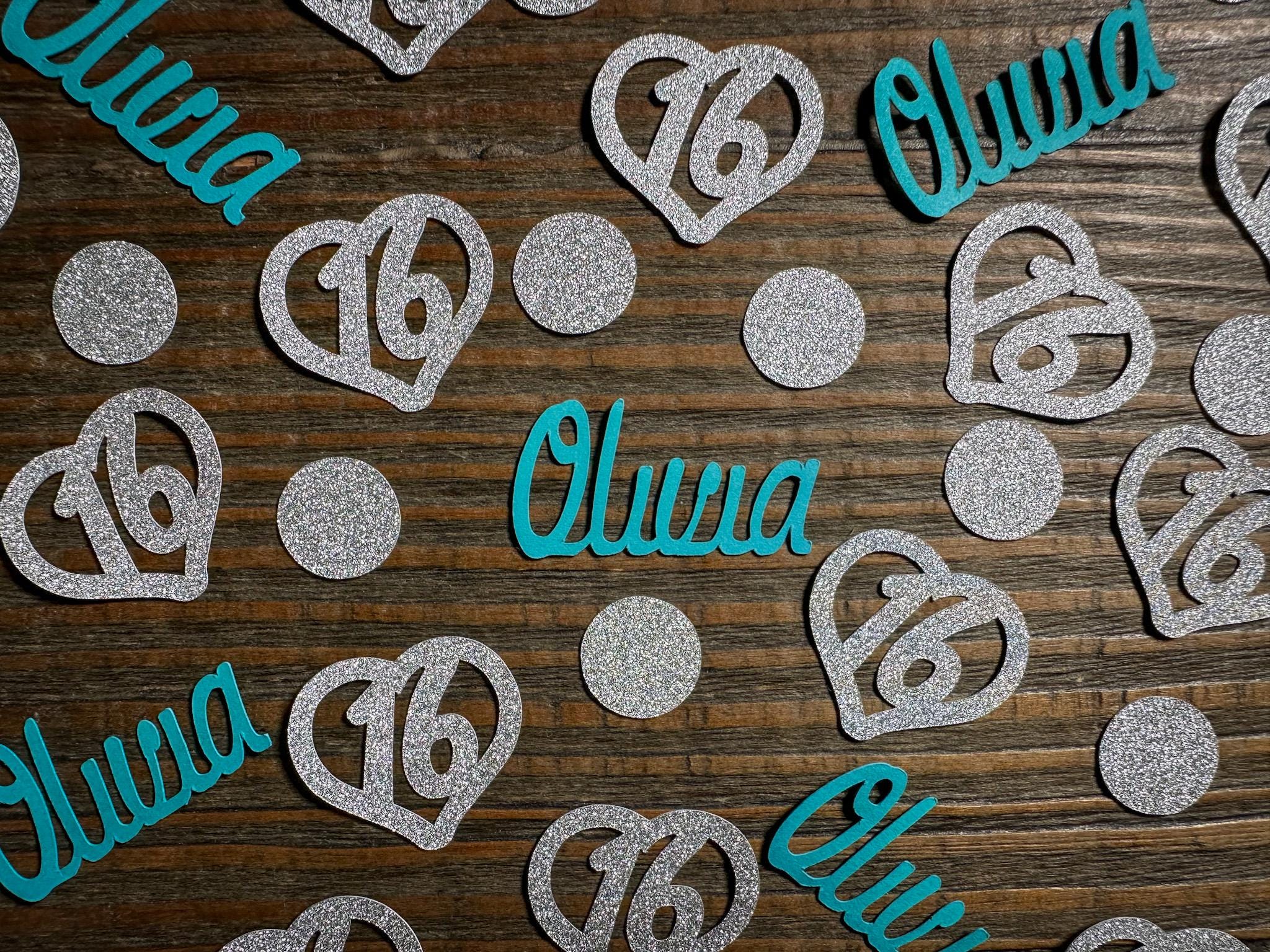 This listing is for 100 pieces of confetti! It includes 25 names, 25 hearts and 50 circles. This confetti is made from glitter cardstock that is white on the reverse side. They measure approximately 1.25 inches in diameter and the circles measure approximately .75 inches in diameter. This confetti is available in different colors!