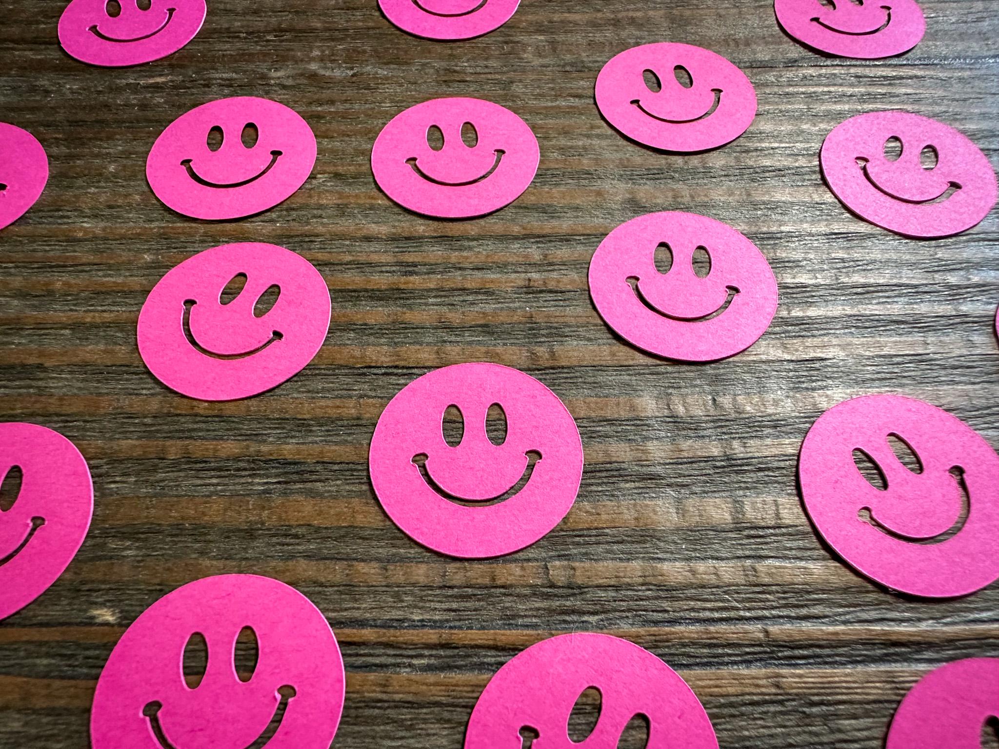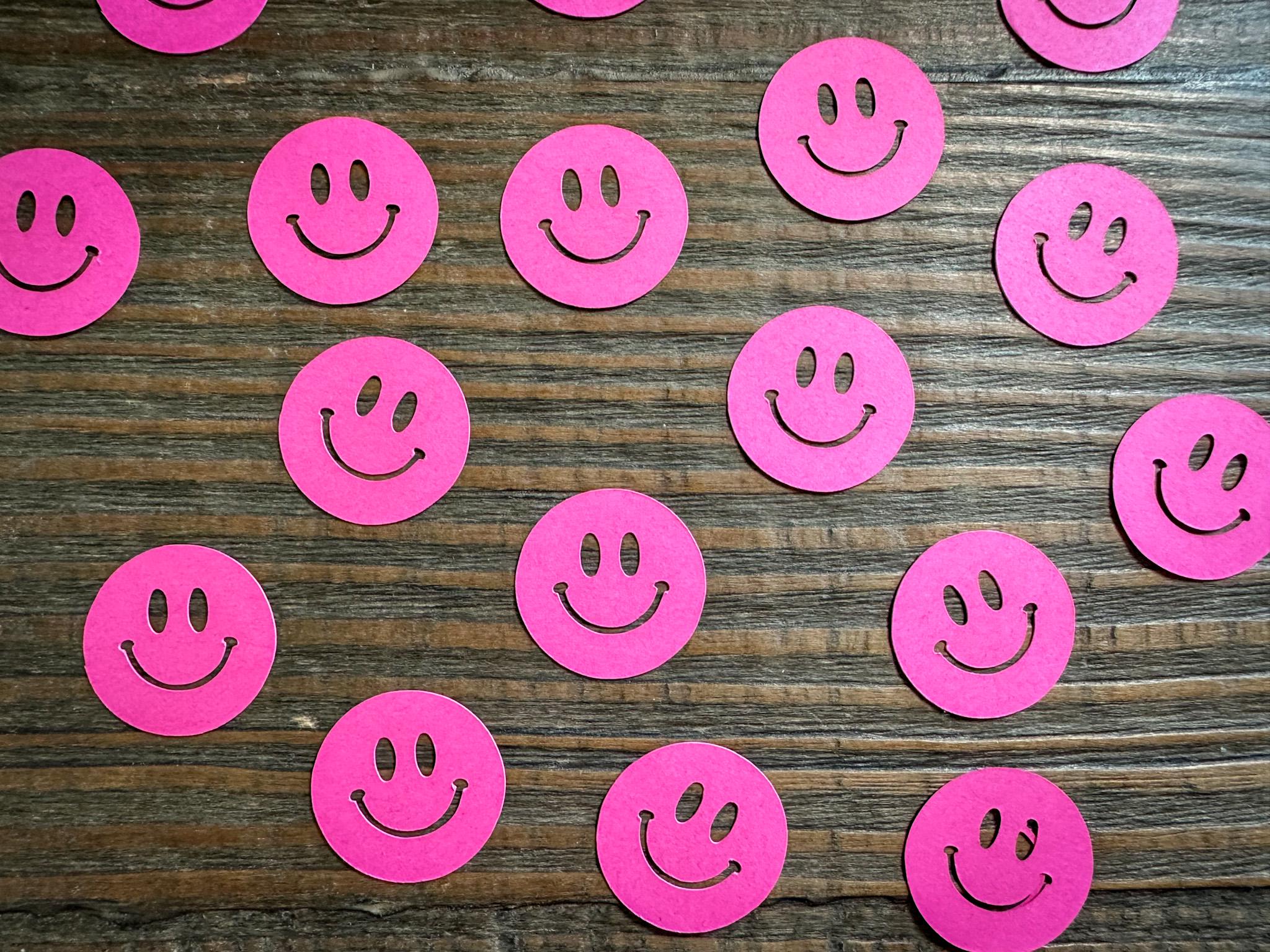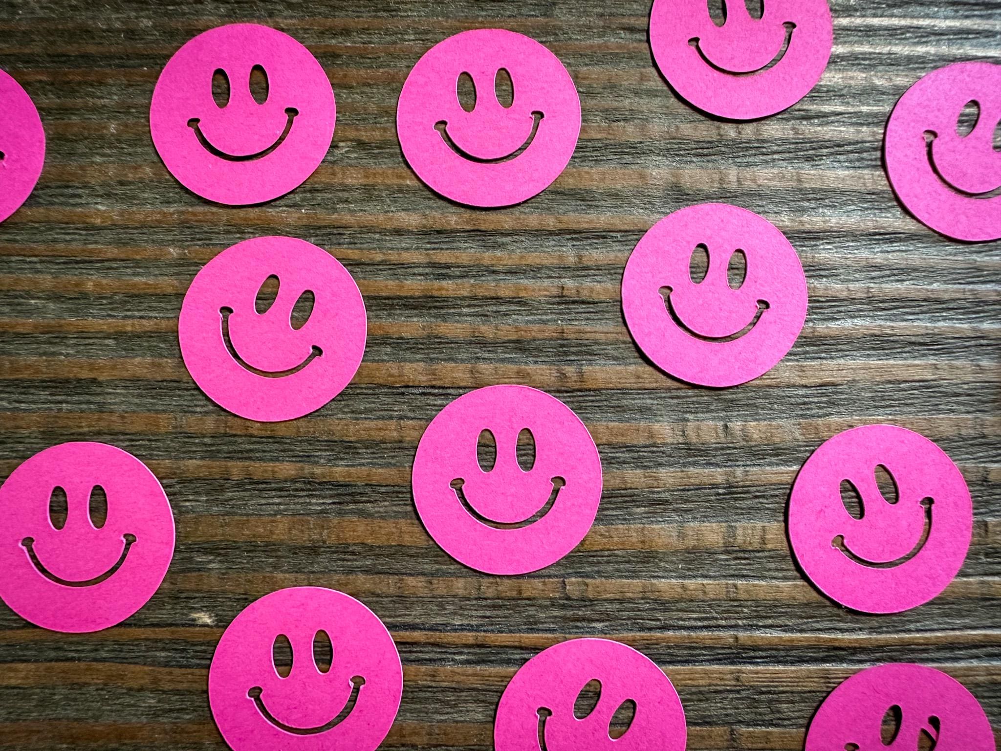 This listing is for 100 pieces of bright pink smiley face confetti! It is made from premium cardstock and each piece measures approximately 1 inch in diameter.