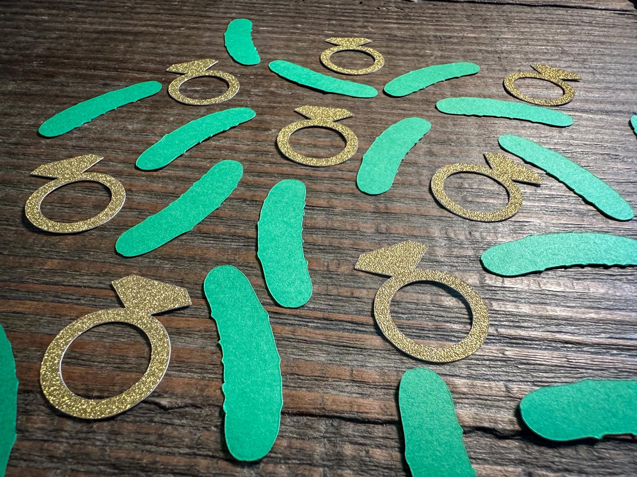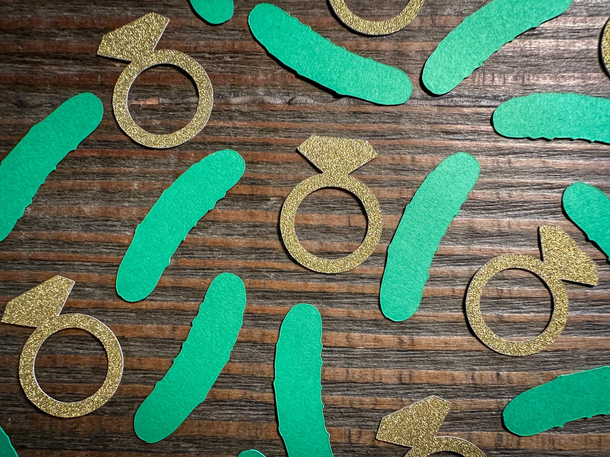 Planning a big dill bachelorette bash? This Pickle & Engagement Ring Confetti is the perfect blend of silly and sparkly to celebrate the bride-to-be in style!