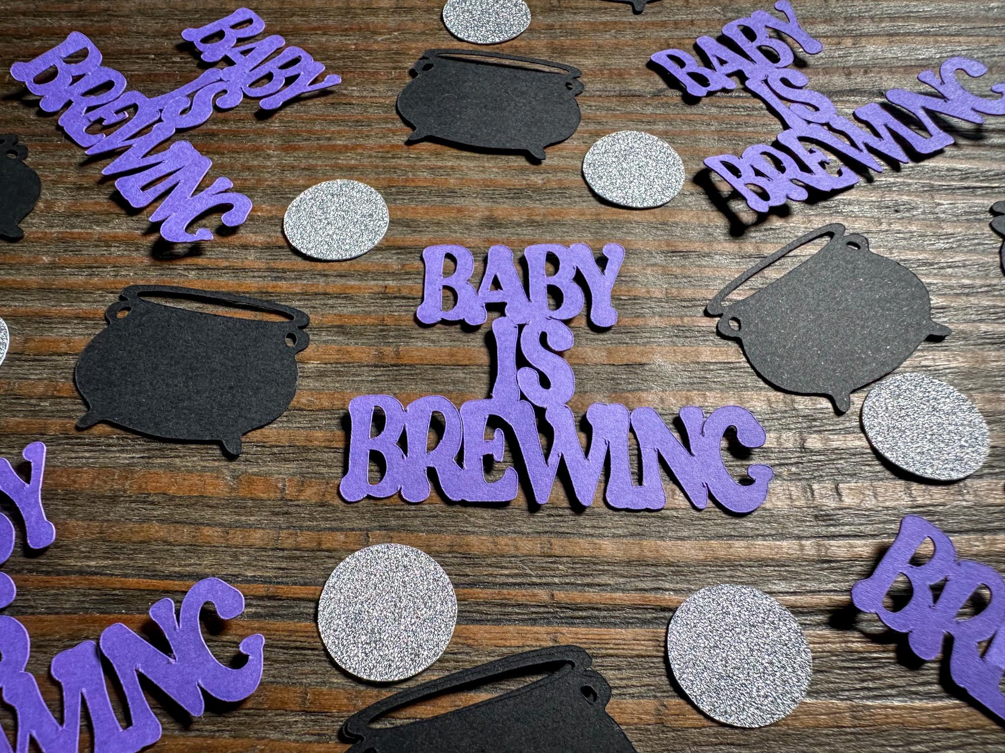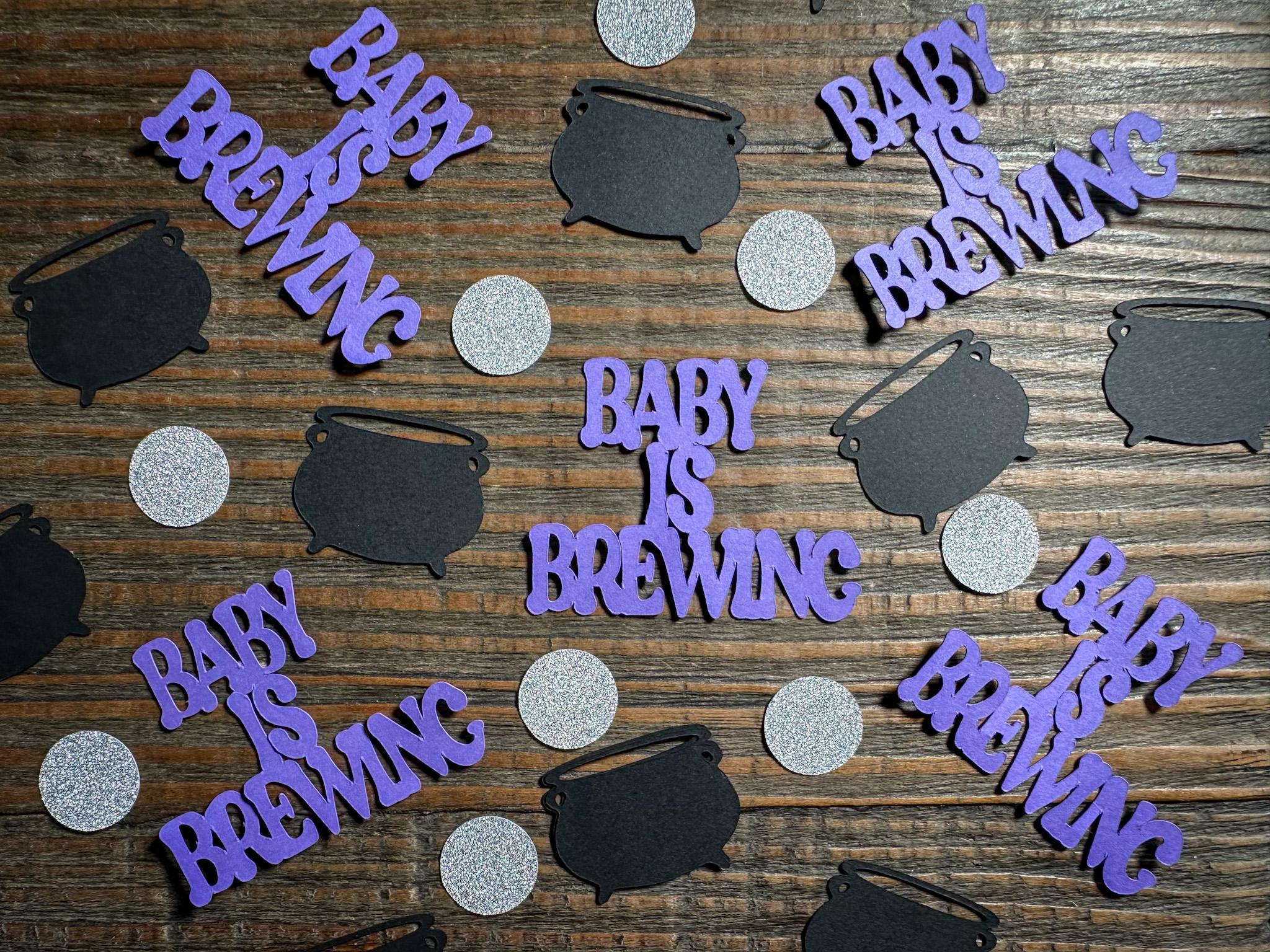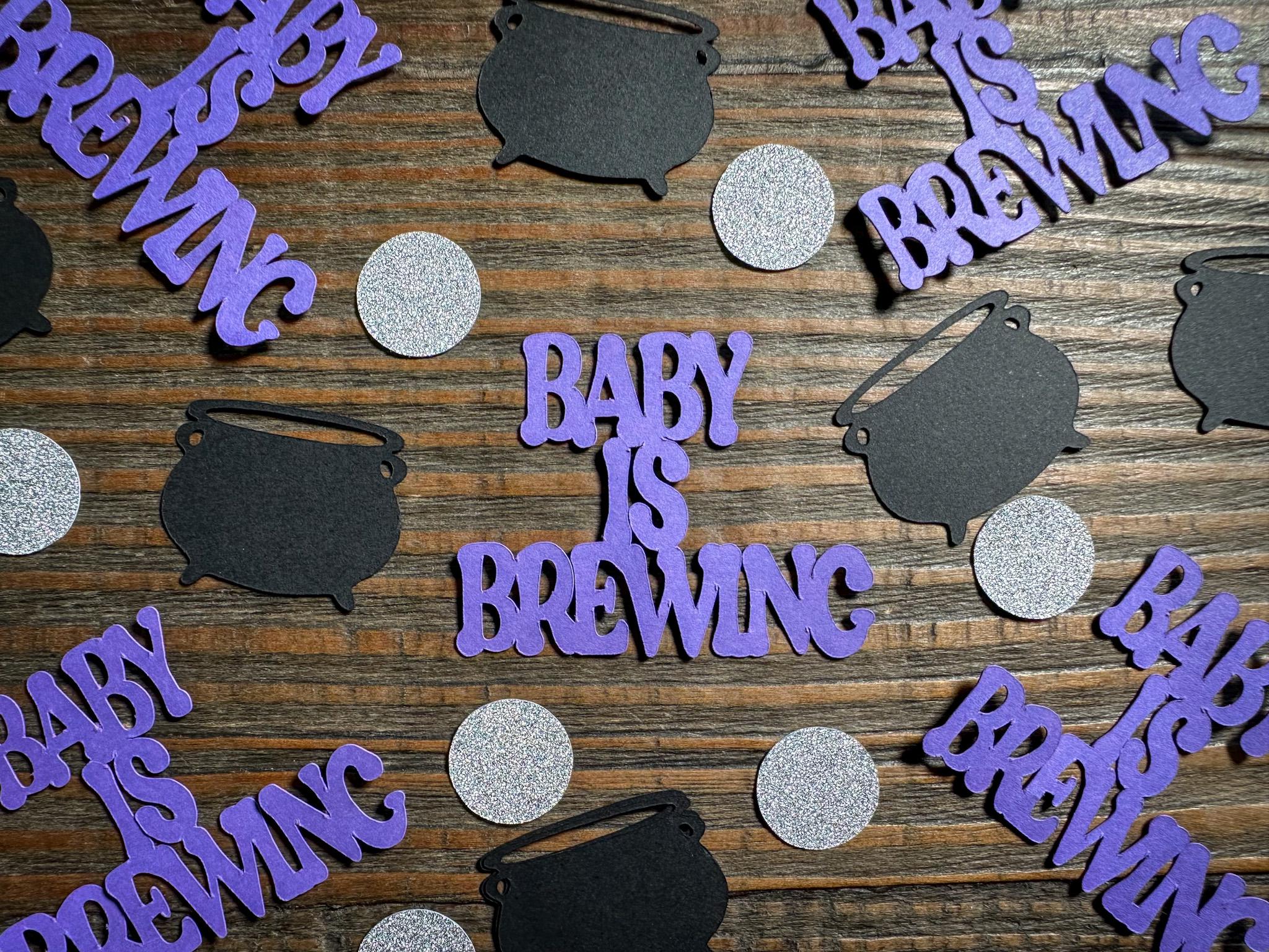 Celebrate the magic of a little one on the way with this enchanting Baby is Brewing confetti set! Perfect for a Halloween-themed baby shower, this mix of purple script cutouts, bubbling cauldrons, and sparkling silver glitter circles adds the perfect spooky-sweet touch to your party decor.