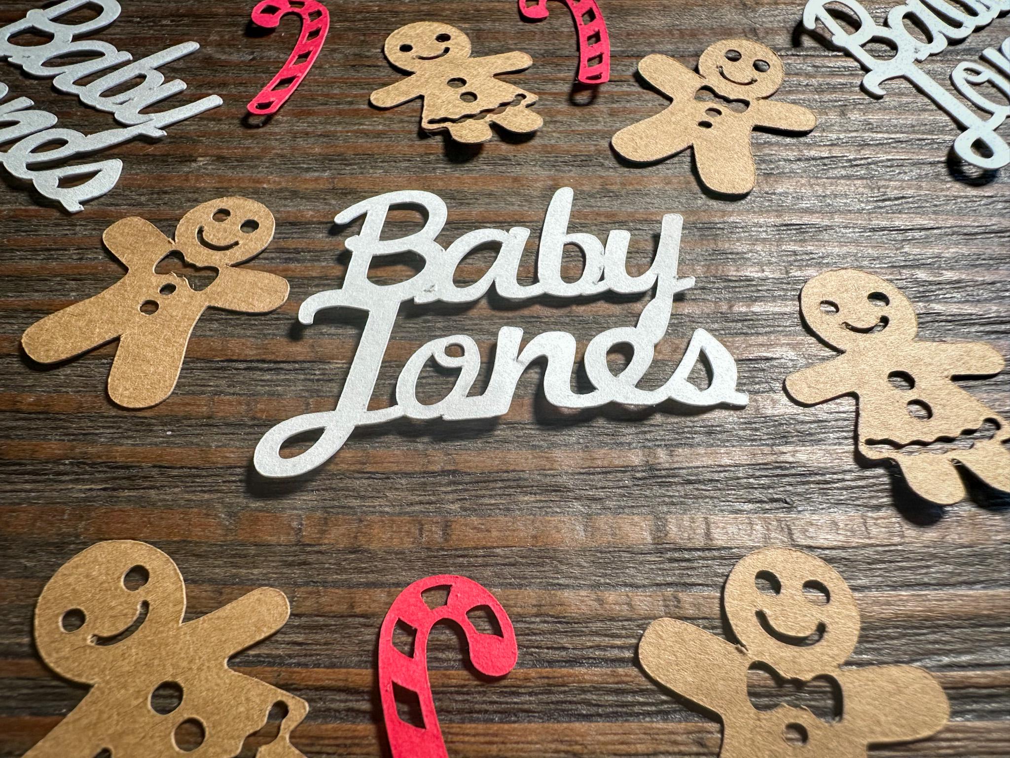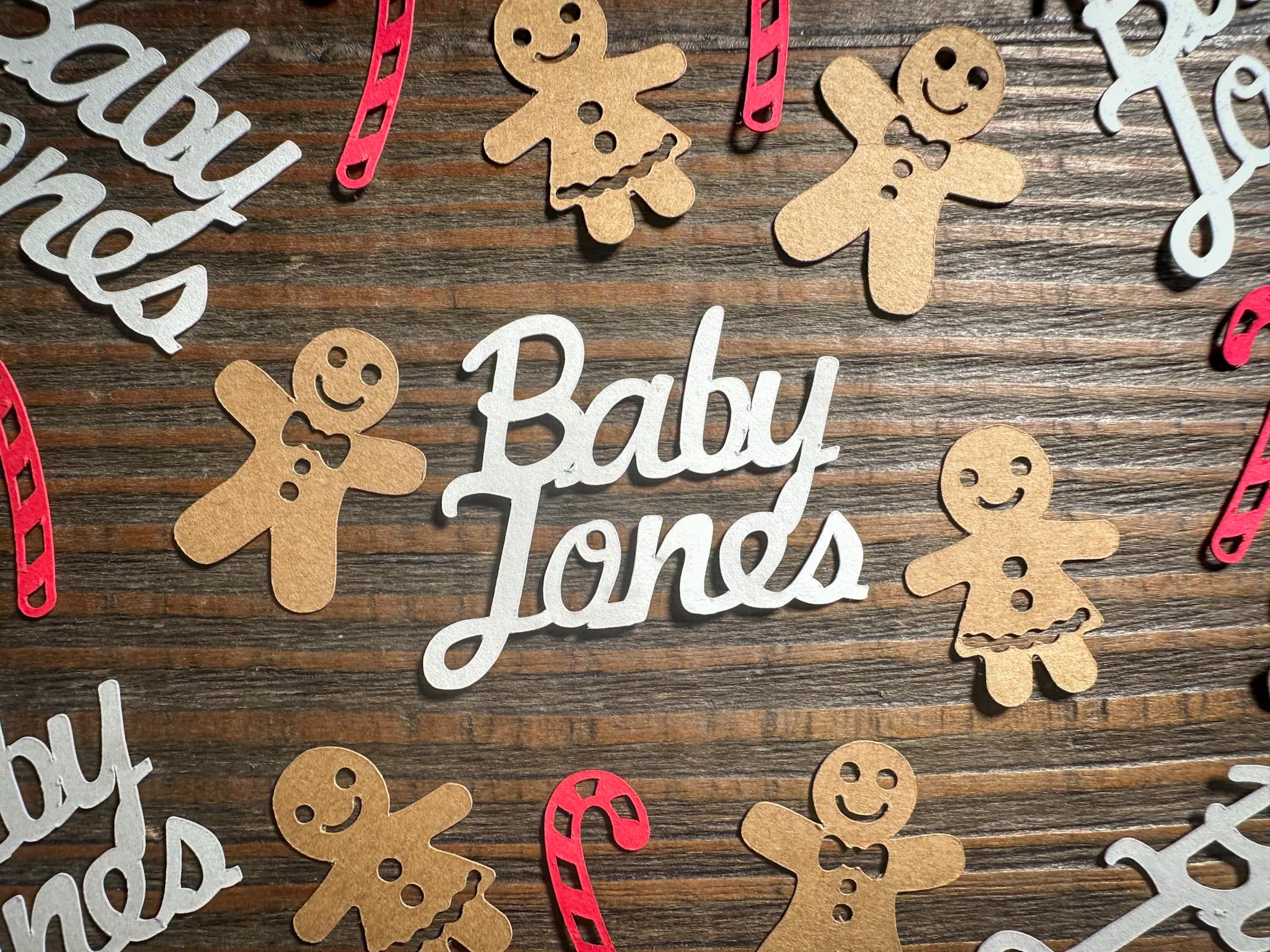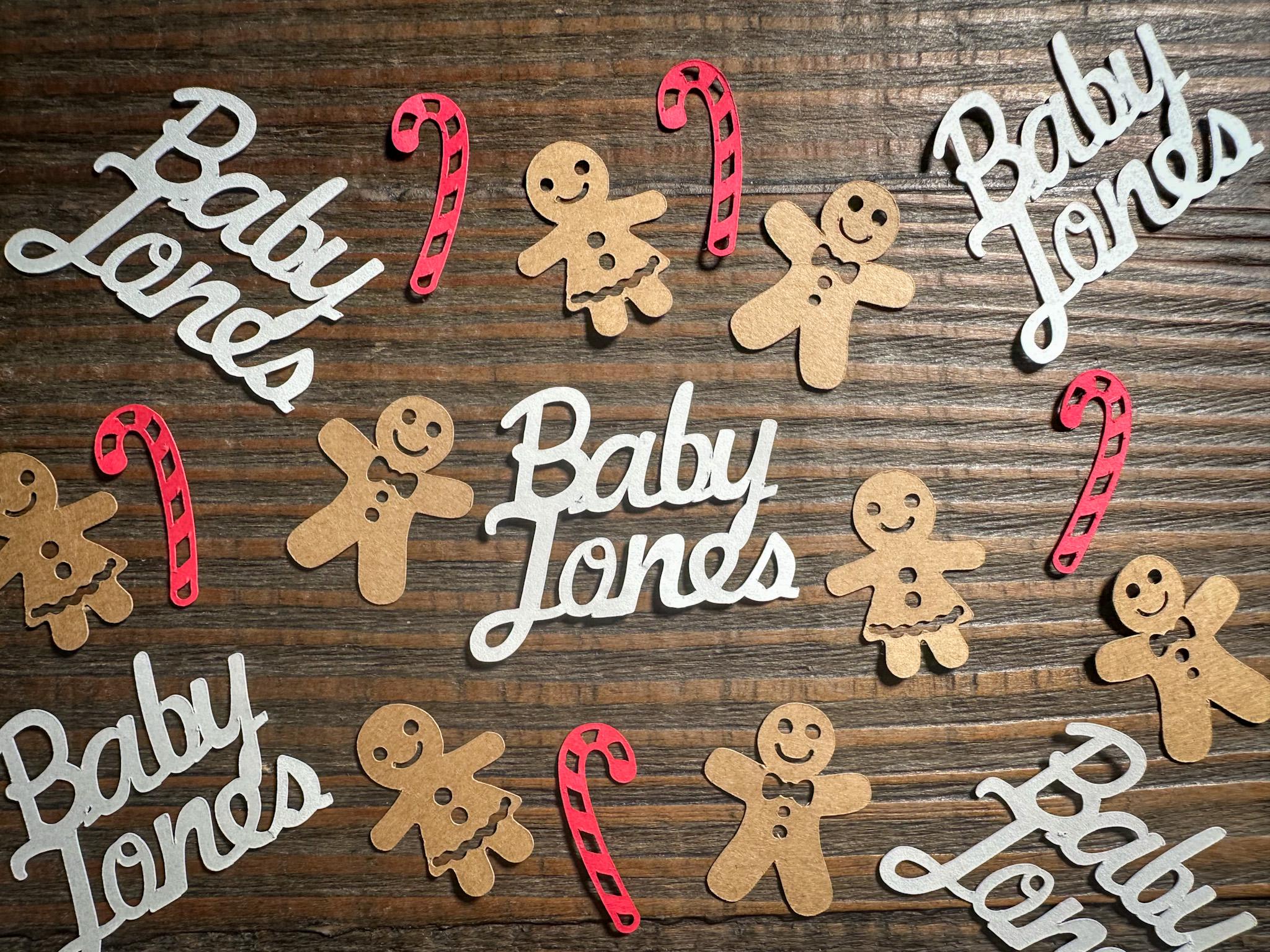 Each set includes 100 high-quality cardstock pieces featuring gingerbread men and ladies, red candy canes, and custom baby name confetti in white – a sweet and personal touch to your party decor.