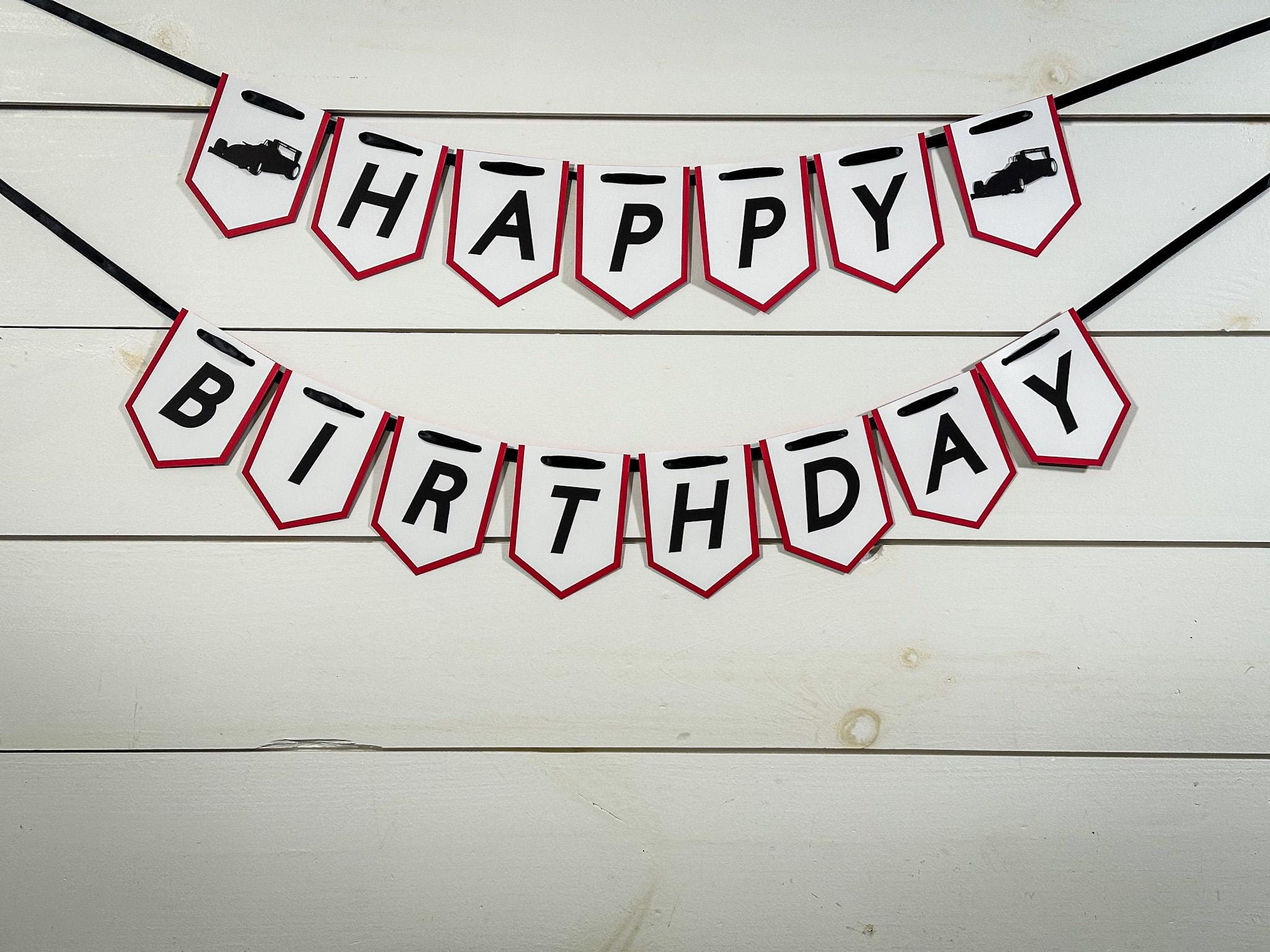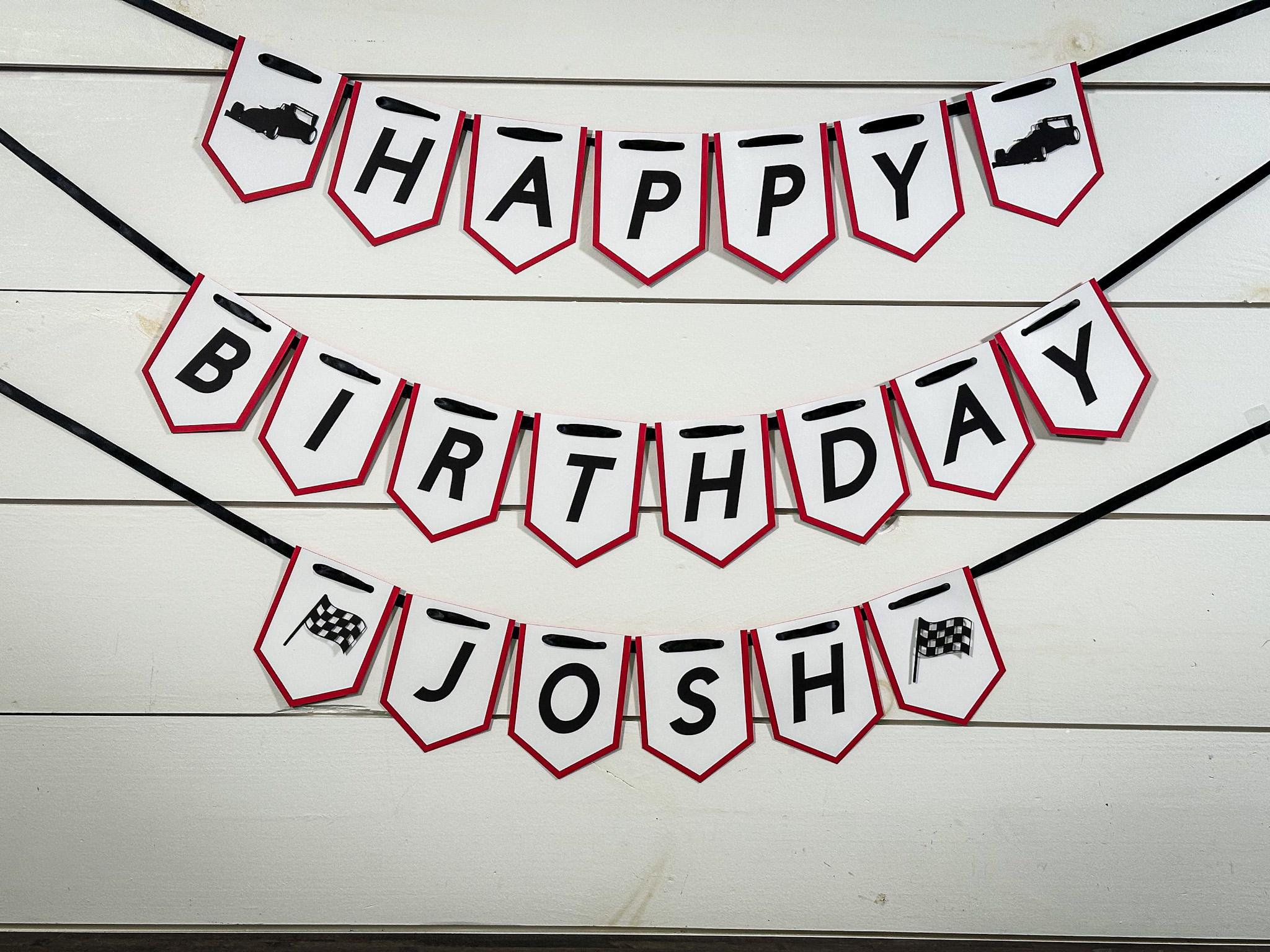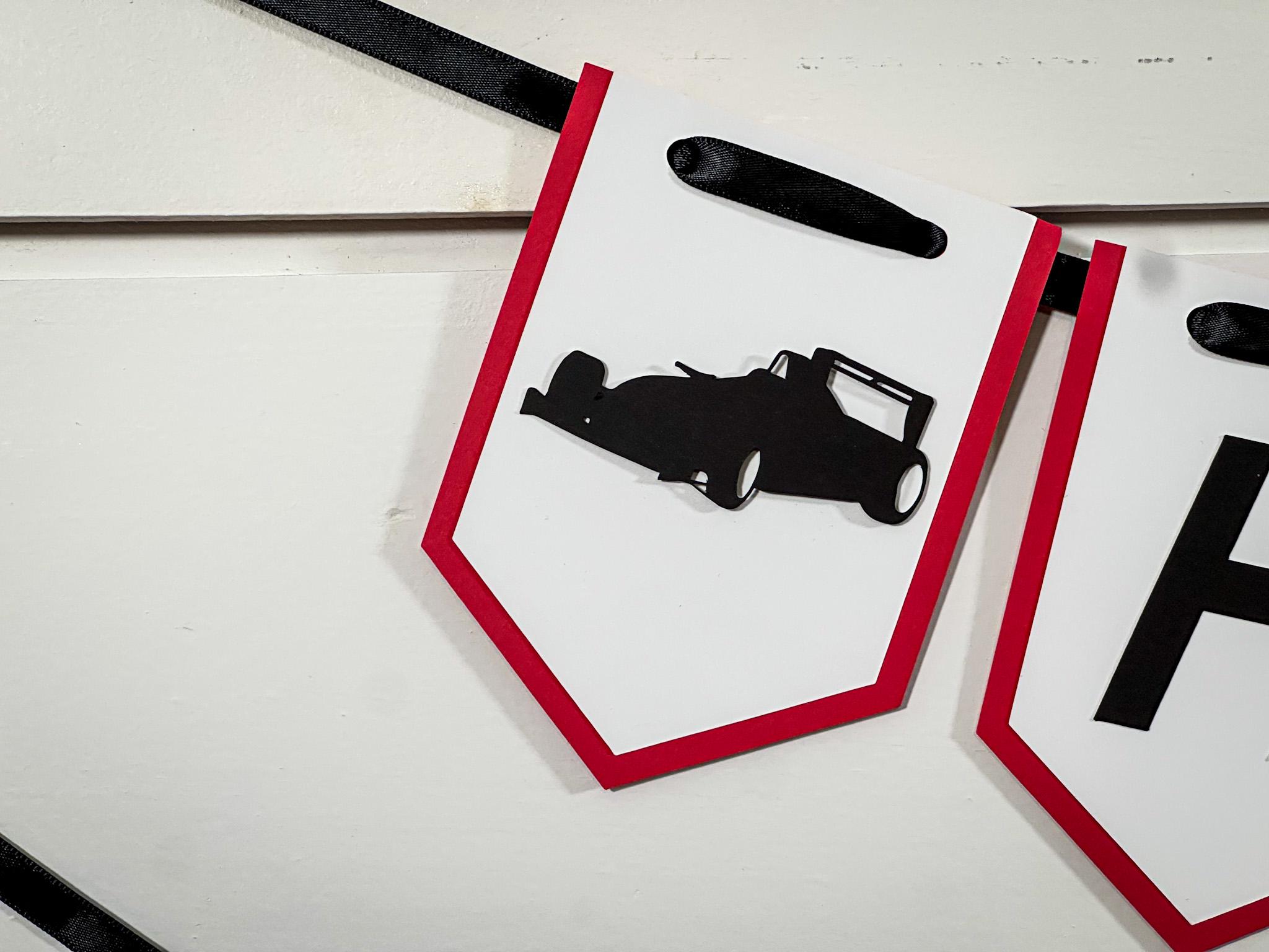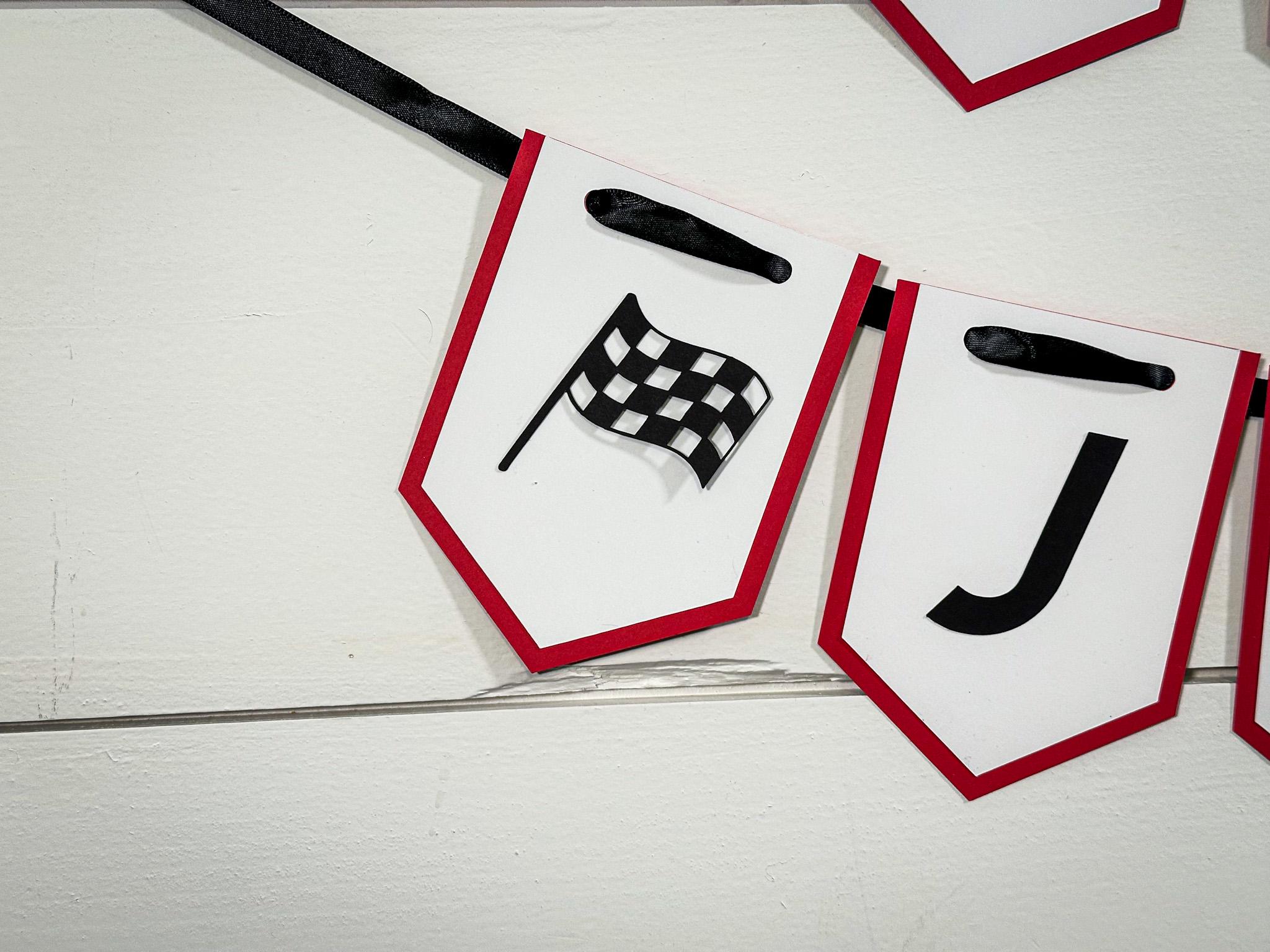 Each banner is handcrafted from sturdy 65 lb cardstock and features a two-layer design—a vibrant red backing layer topped with a crisp white front layer for a clean, high-contrast look. The race car and checkered flag details are attached with foam dots, creating a fun 3D effect that really pops.