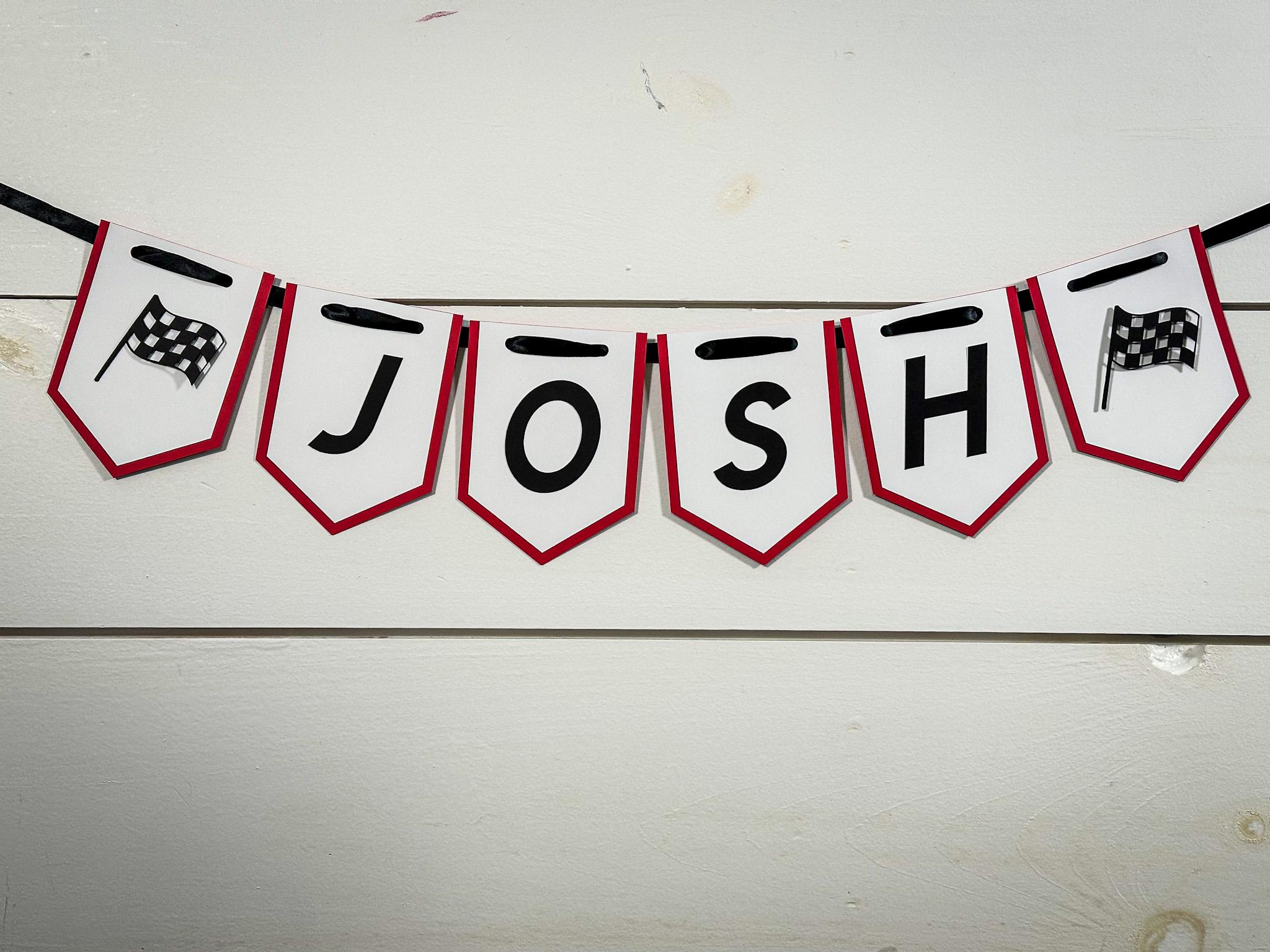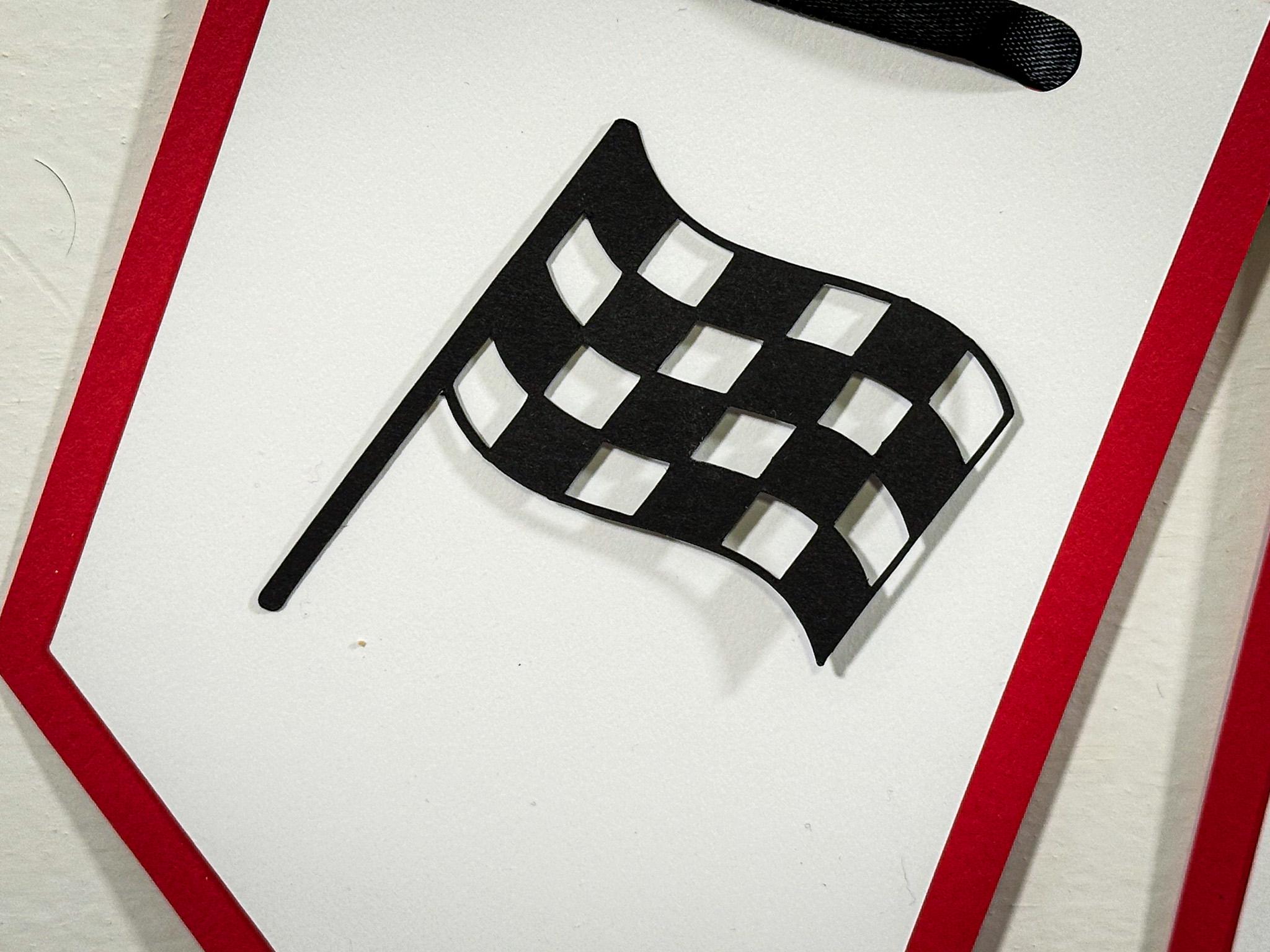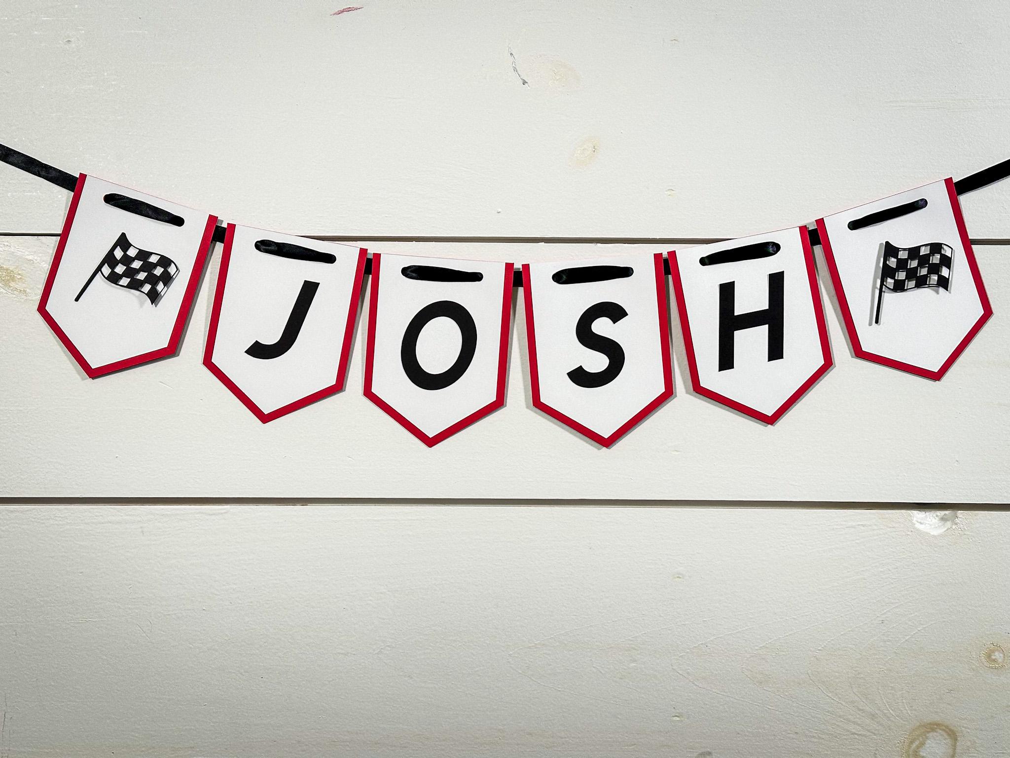 Each banner is handcrafted from sturdy 65 lb cardstock and features a two-layer design—a vibrant red backing layer topped with a crisp white front layer for a clean, high-contrast look. The race car and checkered flag details are attached with foam dots, creating a fun 3D effect that really pops.