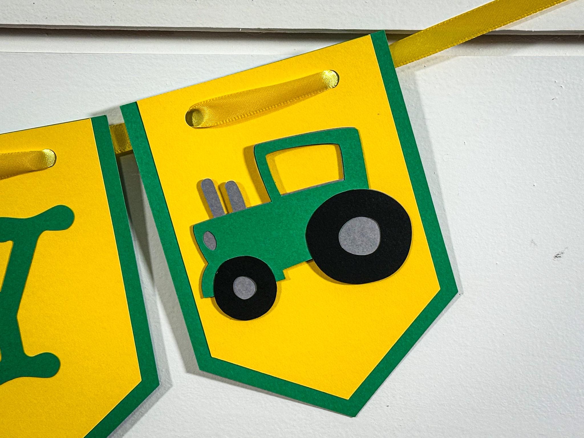 Each banner is handmade from sturdy 65 lb cardstock and features a two-layer pennant design—a bright green back layer topped with a sunny yellow front layer. The tractor accents are attached using foam dots, giving the banner a playful 3D effect that stands out on dessert tables, mantels, and party backdrops.