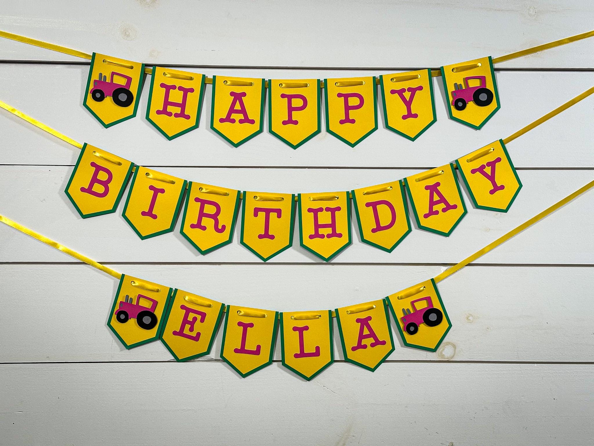 Celebrate your little farmer’s big day with this Green, Yellow & Pink Tractor Happy Birthday Banner 🚜💖