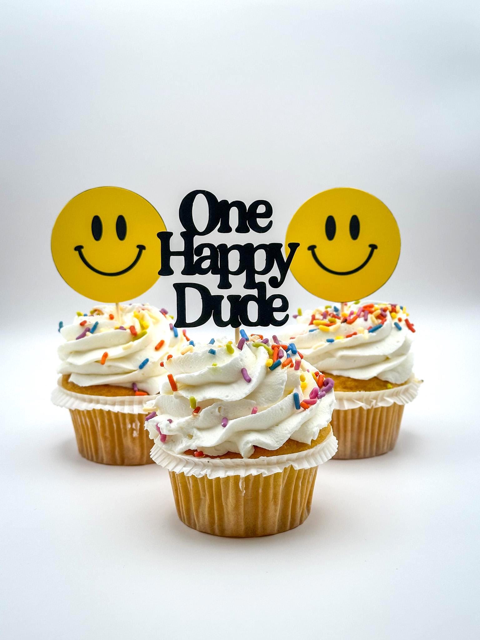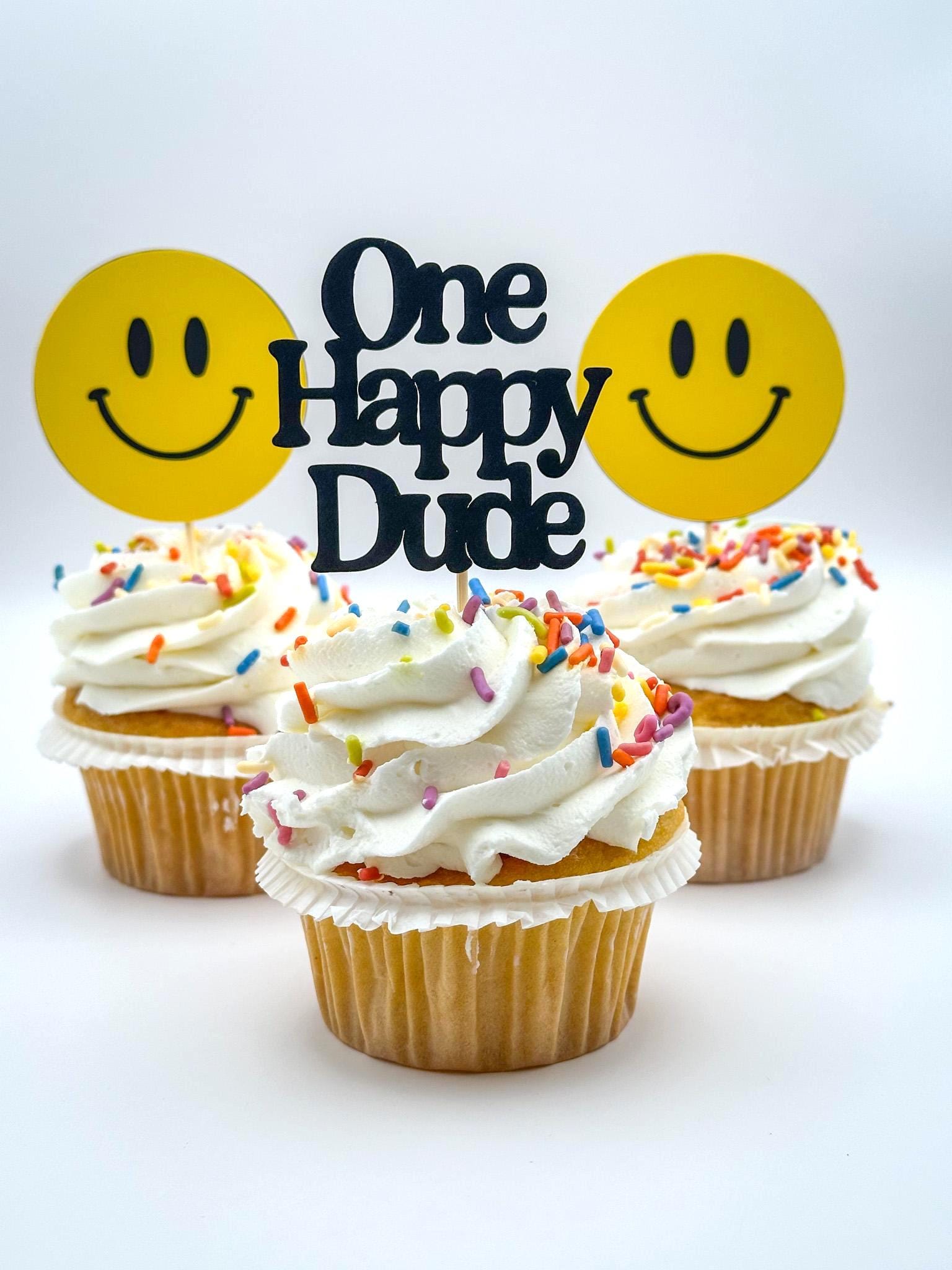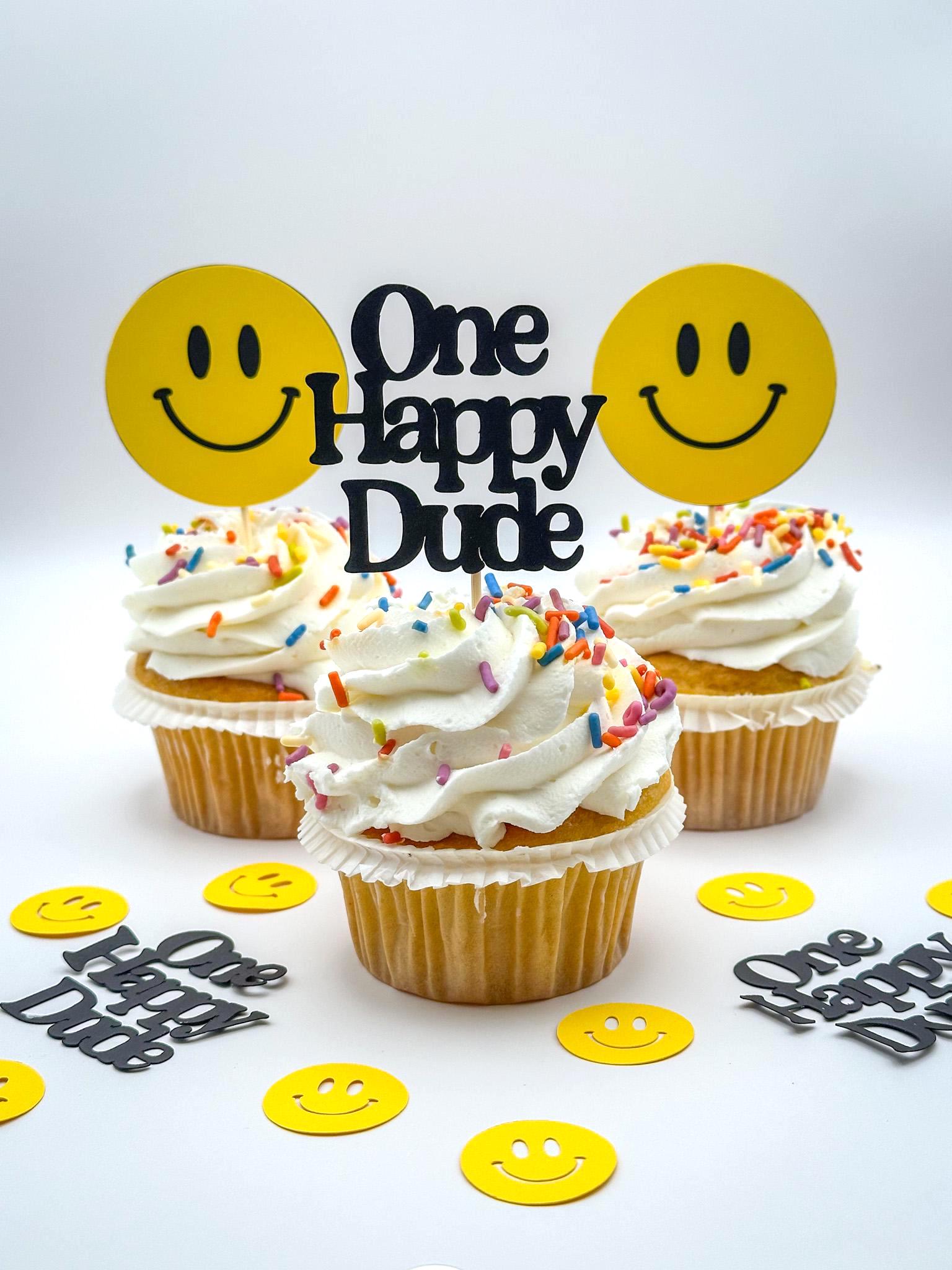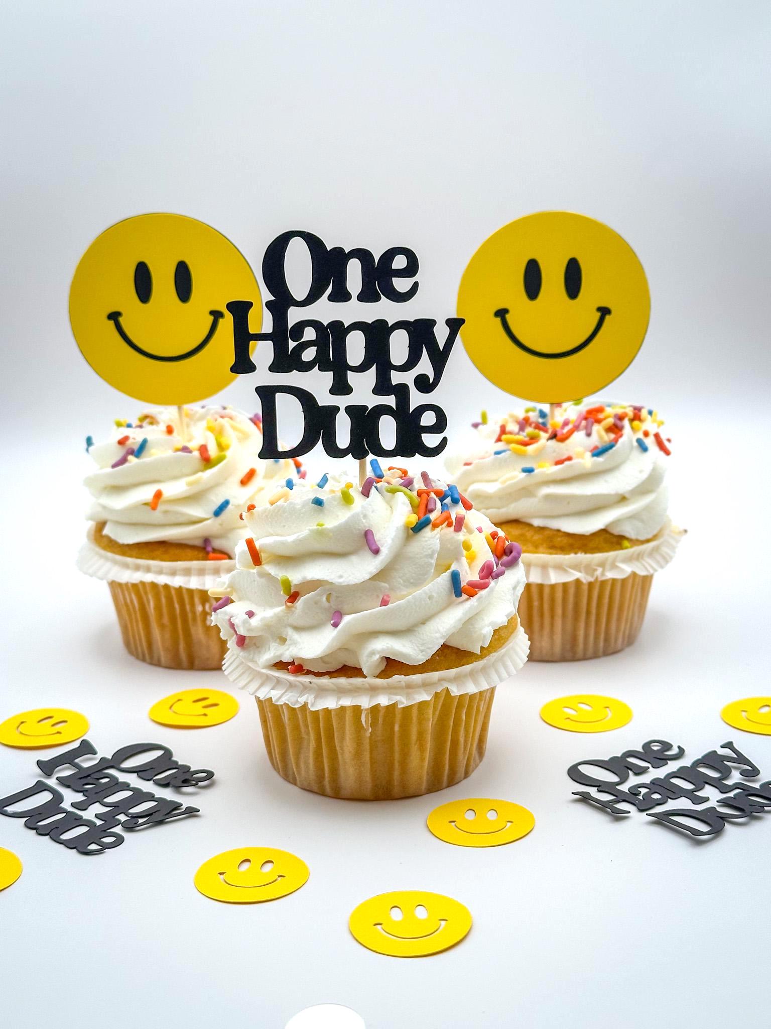 Celebrate your little guy’s big day with these fun and cheerful One Happy Dude cupcake toppers! Featuring classic bright yellow smiley faces paired with bold black “One Happy Dude” toppers, this set is perfect for a modern first birthday celebration.