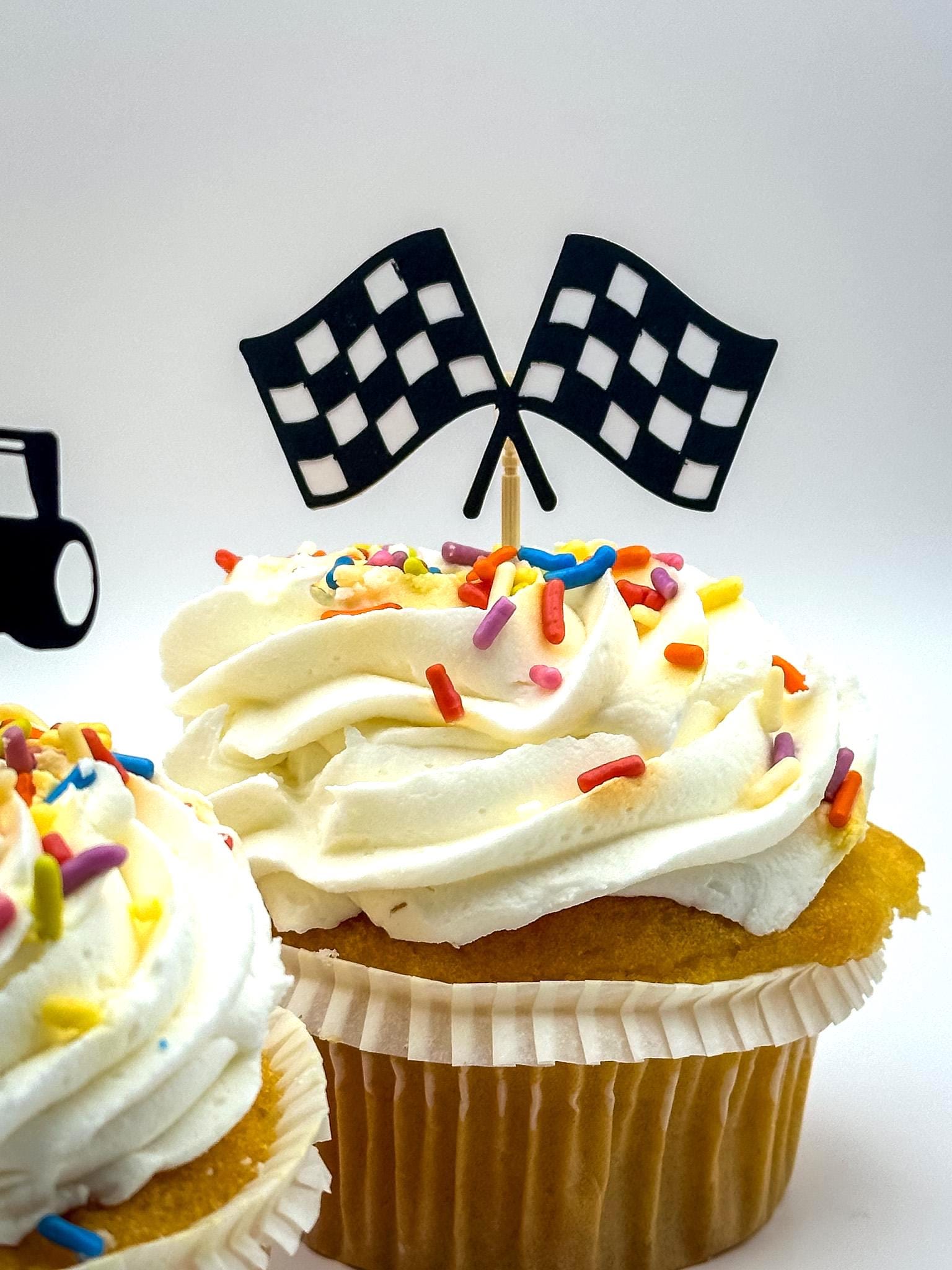 Simply place these toppers into cupcakes, brownies, or other desserts to instantly create a fun racing-themed display.