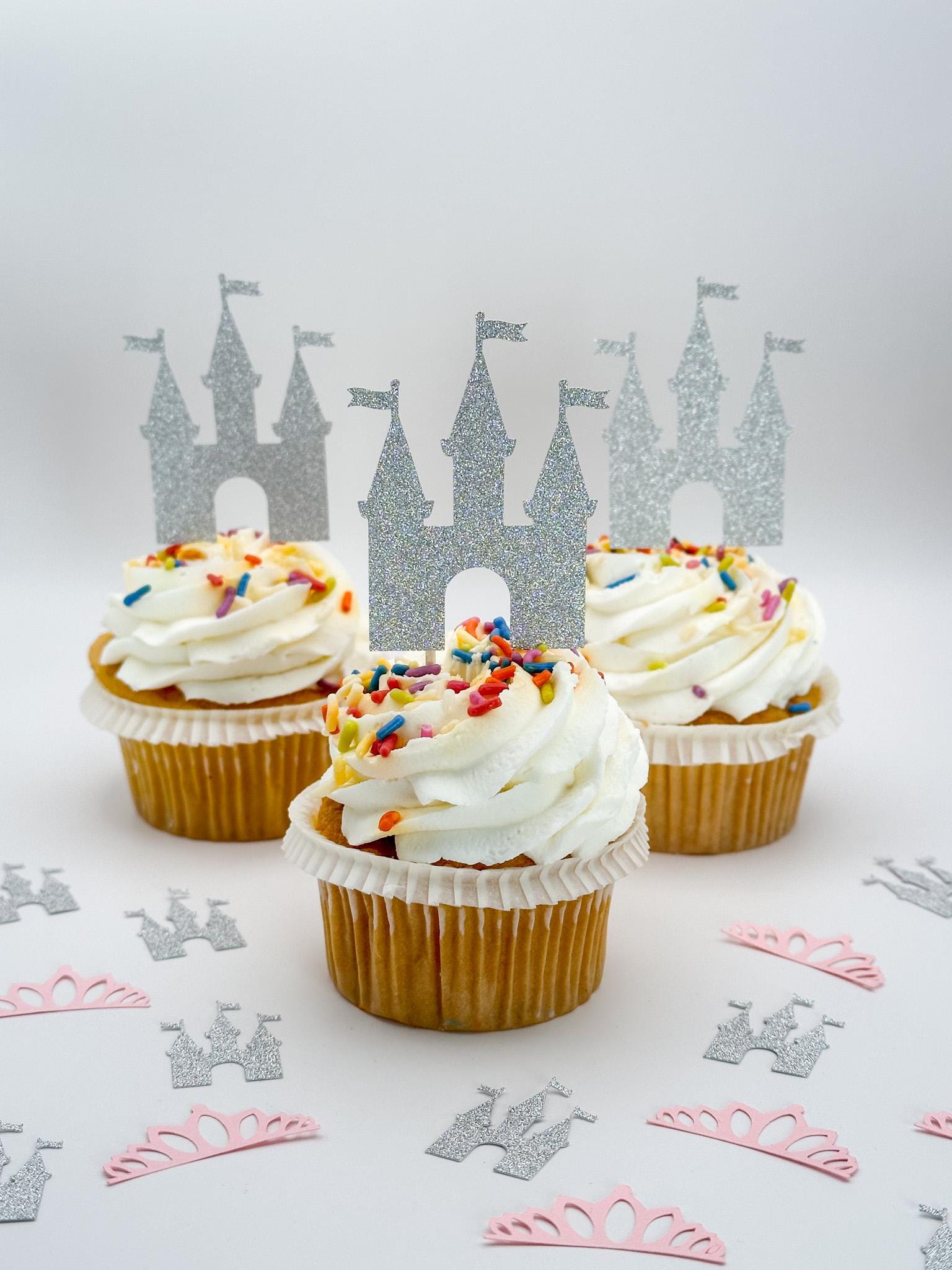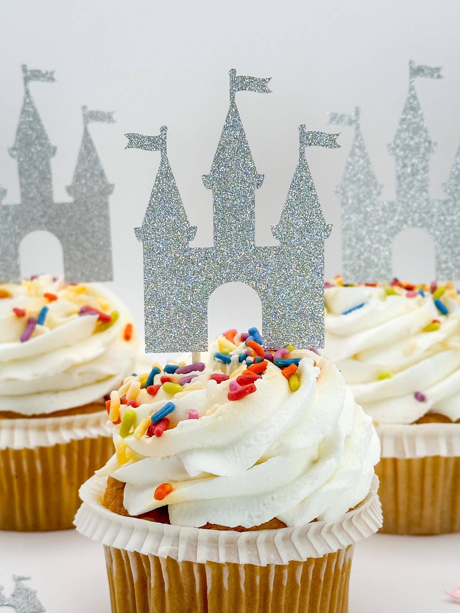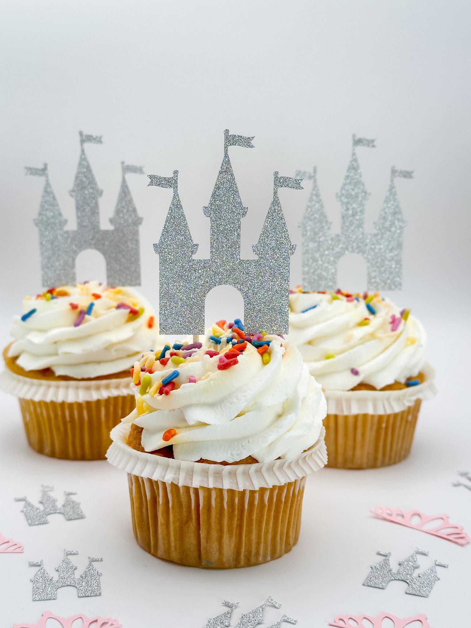 Add a touch of sparkle and fairytale magic to your celebration with these beautiful silver glitter princess castle cupcake toppers!