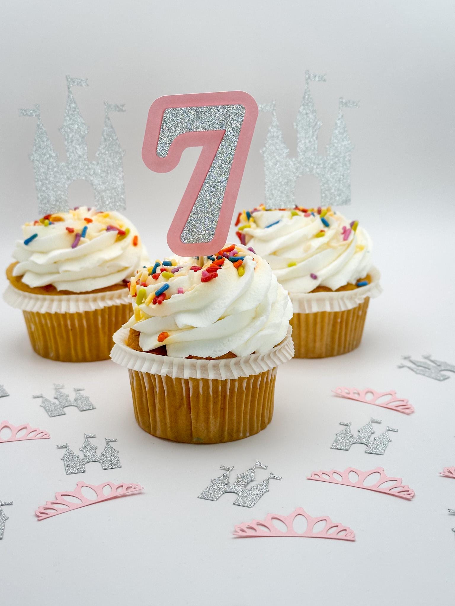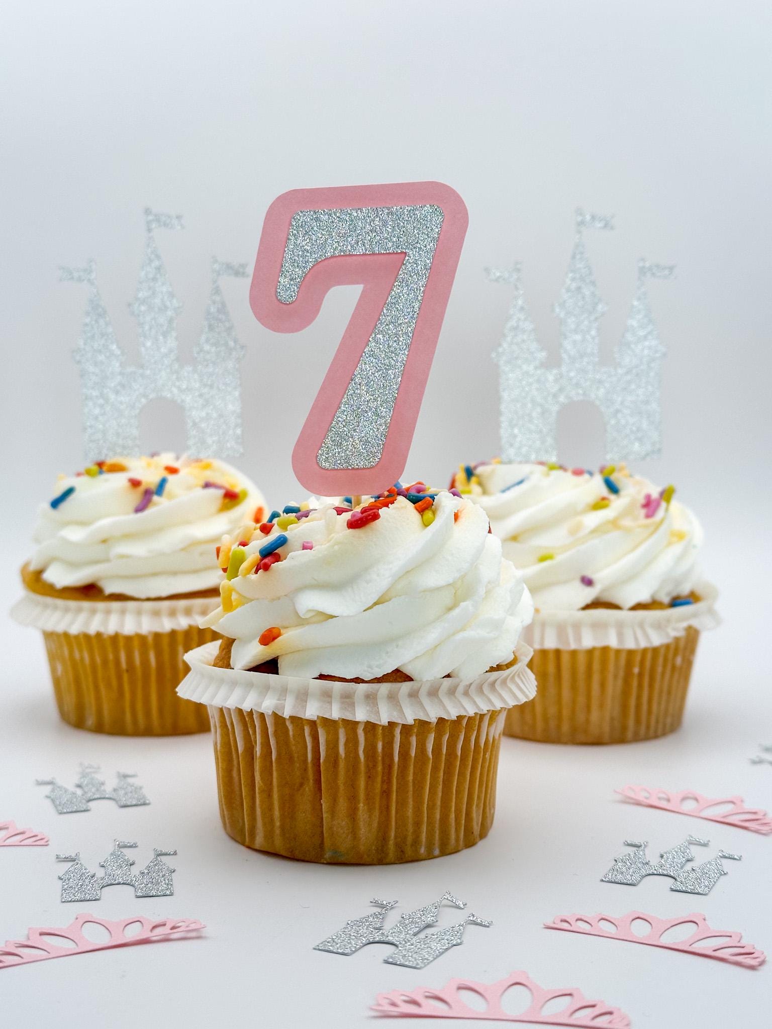 Create a magical, fairytale-inspired dessert table with this beautiful set of princess cupcake toppers, featuring sparkling castles and custom age numbers!