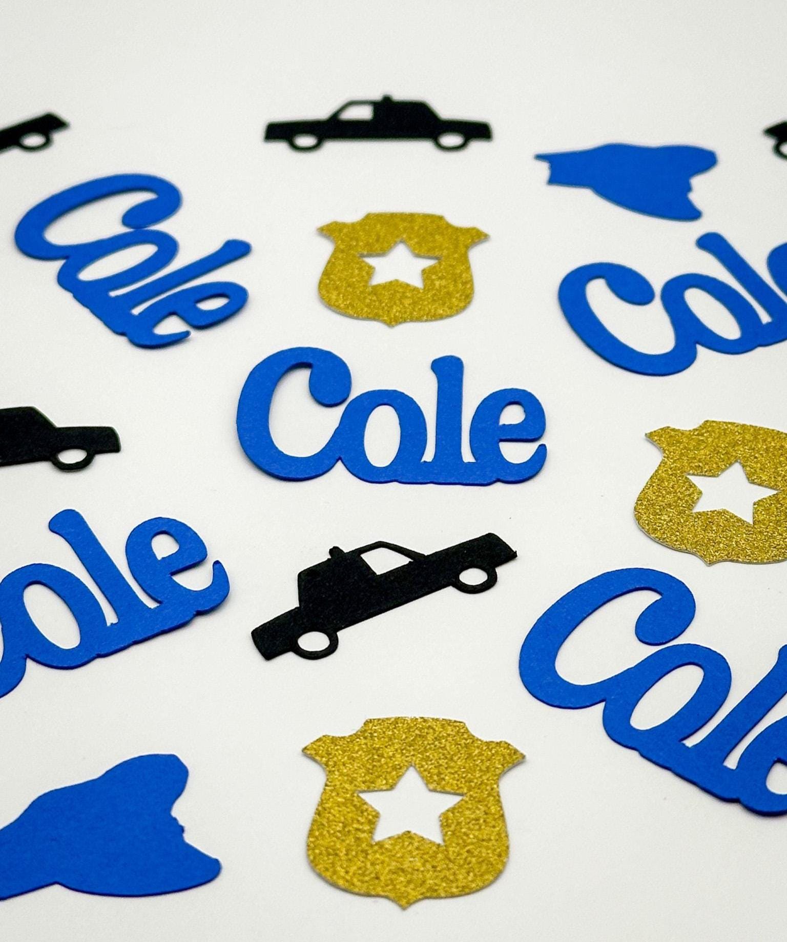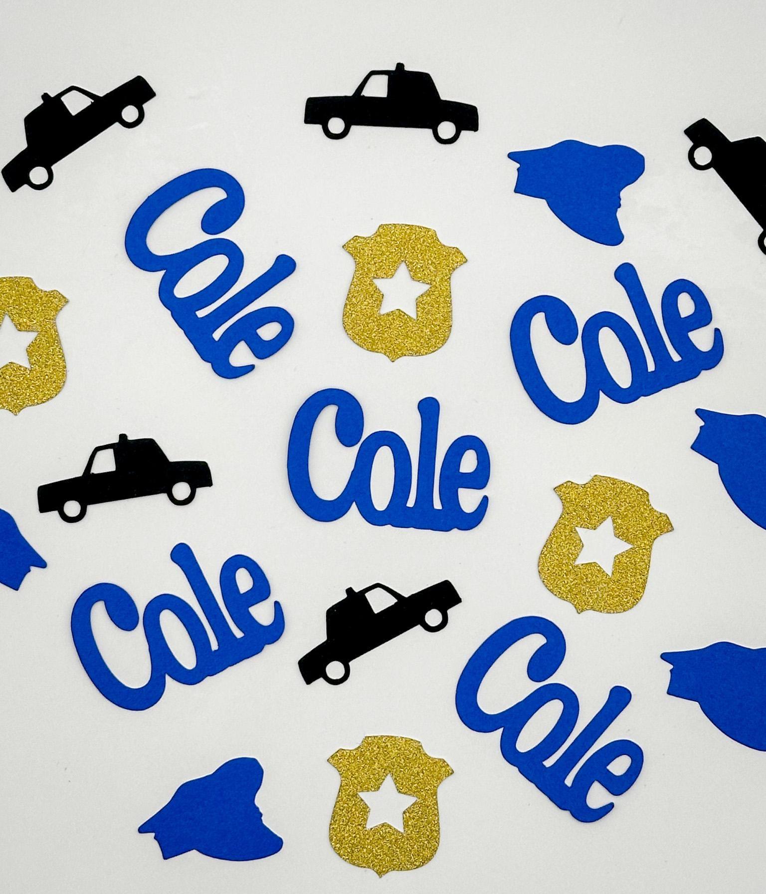 This unique mix includes custom name pieces along with classic police-themed shapes—perfect for adding a fun and personal touch to your party tables, invitations, or favor bags.