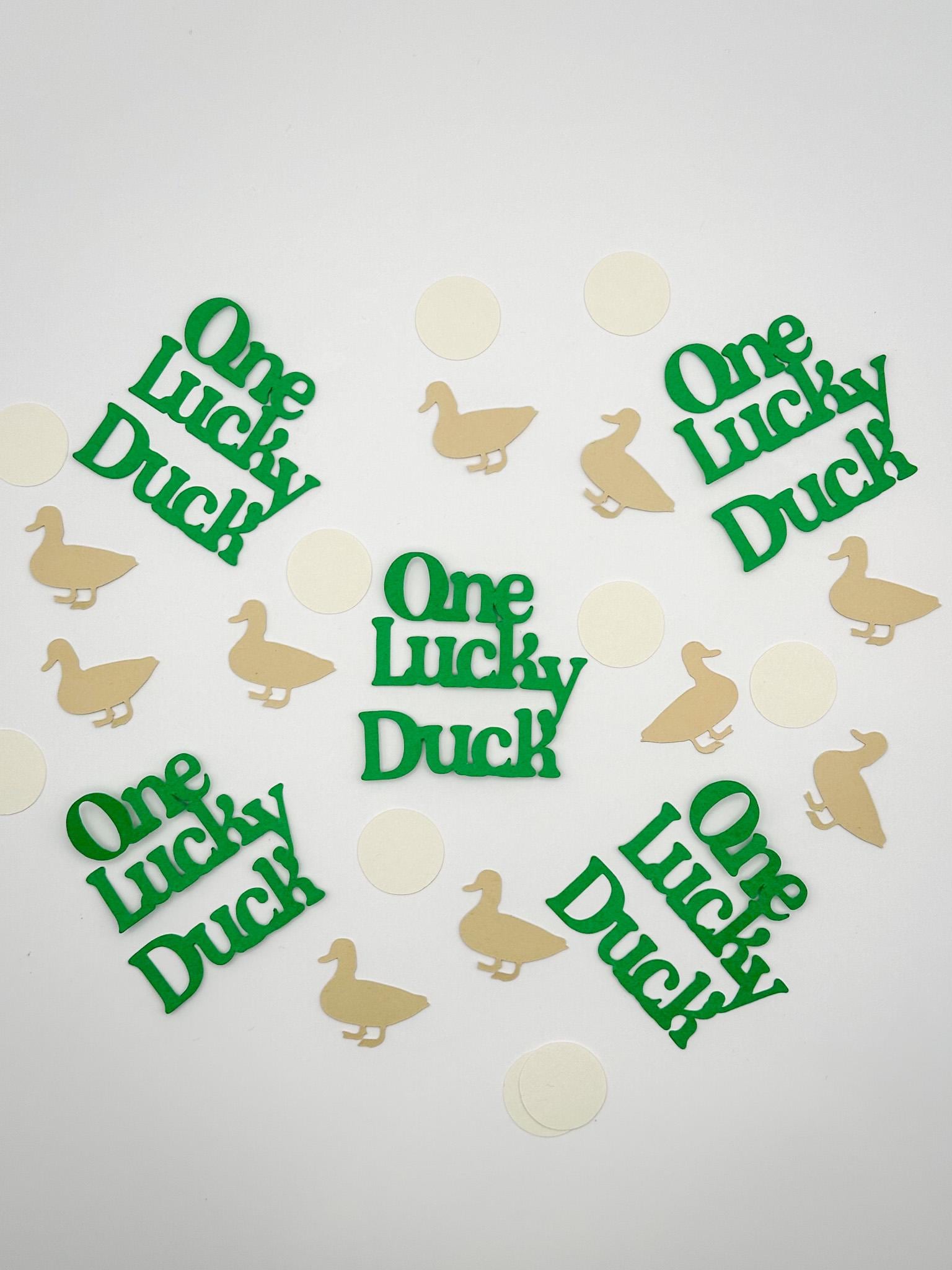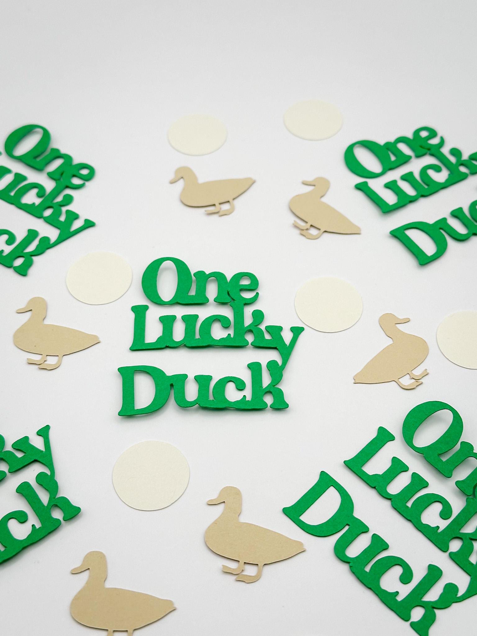 Add a sweet and charming touch to your celebration with this “One Lucky Duck” confetti set in soft, neutral tones!