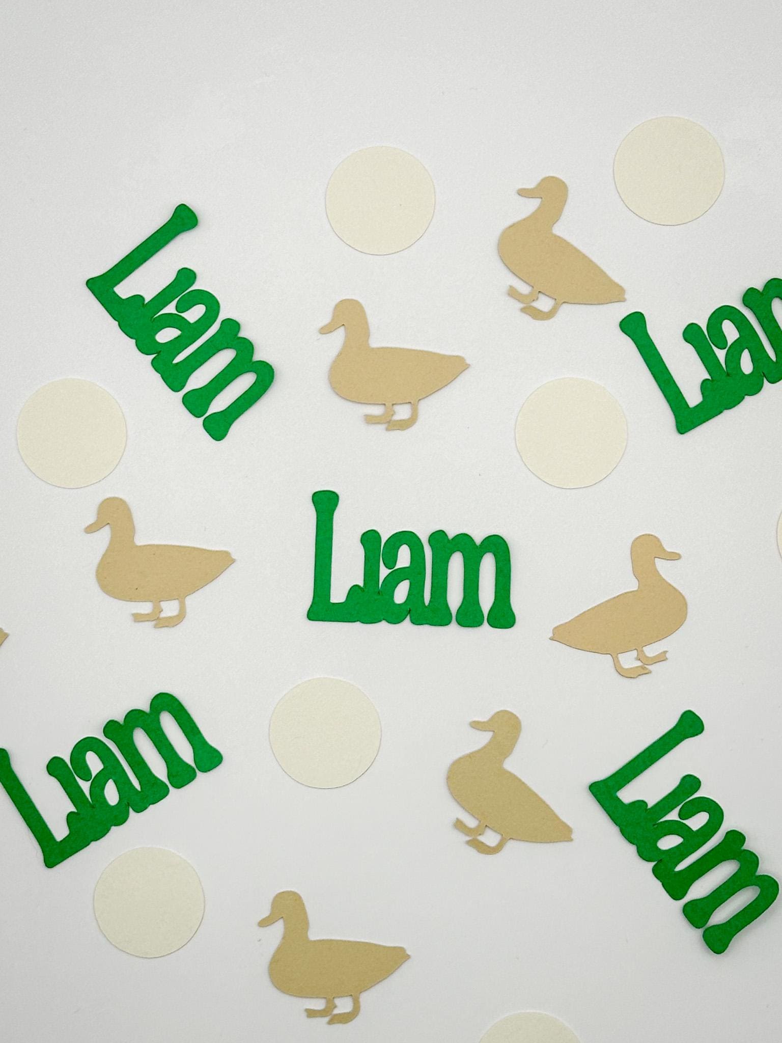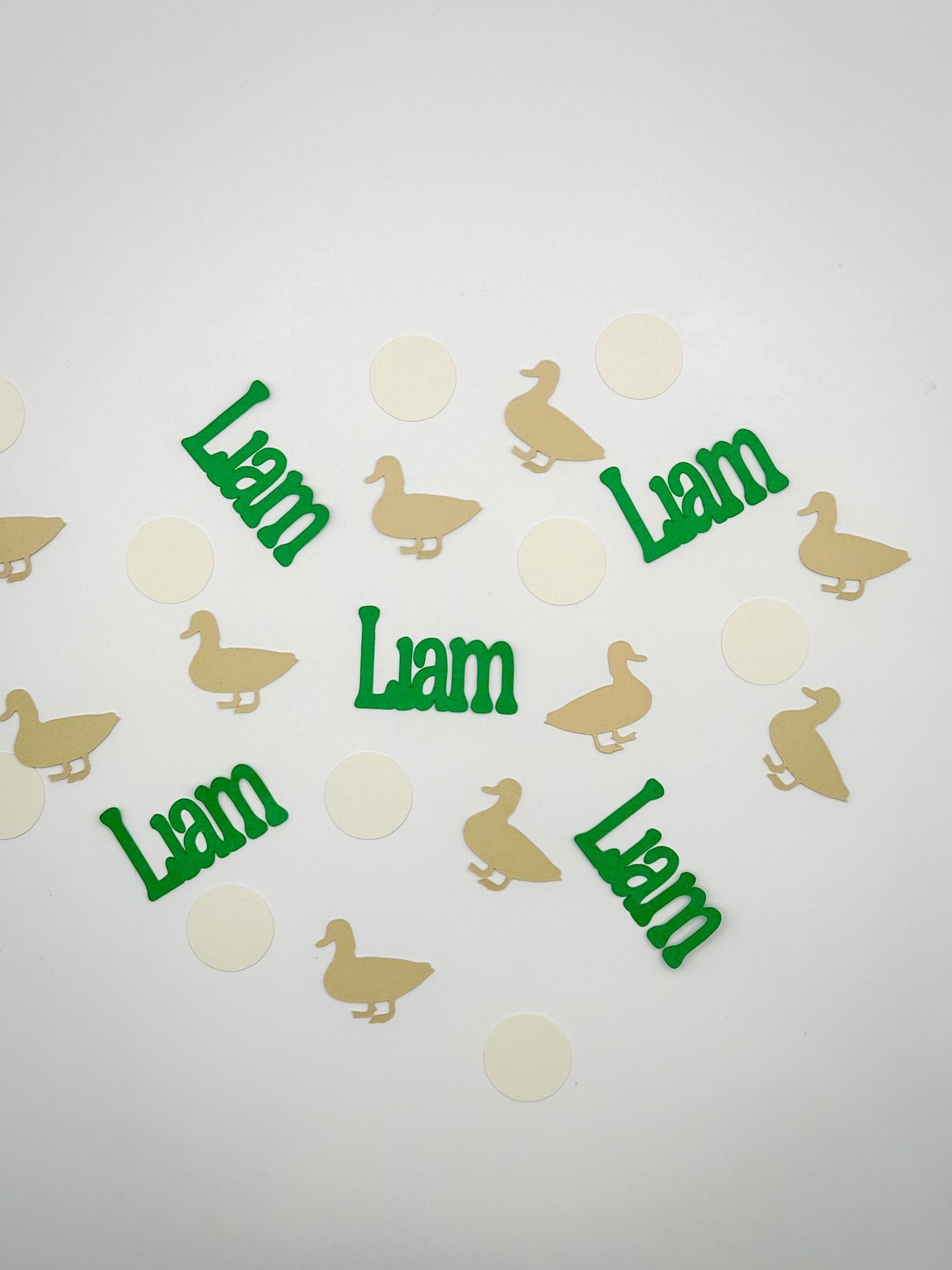 Featuring personalized name pieces alongside adorable ducks and classic circle confetti, this set is perfect for baby showers, birthdays, and “Lucky Duck” themed parties. The soft, neutral color palette makes it easy to match with a variety of party themes.