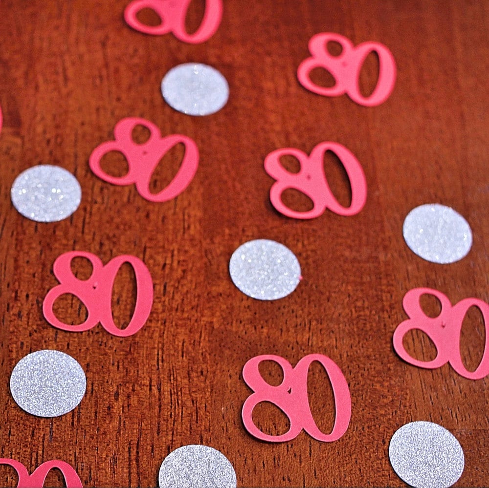 This listing is for 100 pieces of confetti. It includes 30 pieces of age confetti in red premium card stock and 70 pieces of silver glitter circles. The circles are white on the back and measure 3/4 of an inch. The size of the numbers varies based on the age but is typically 1 to 1.5 inches wide.